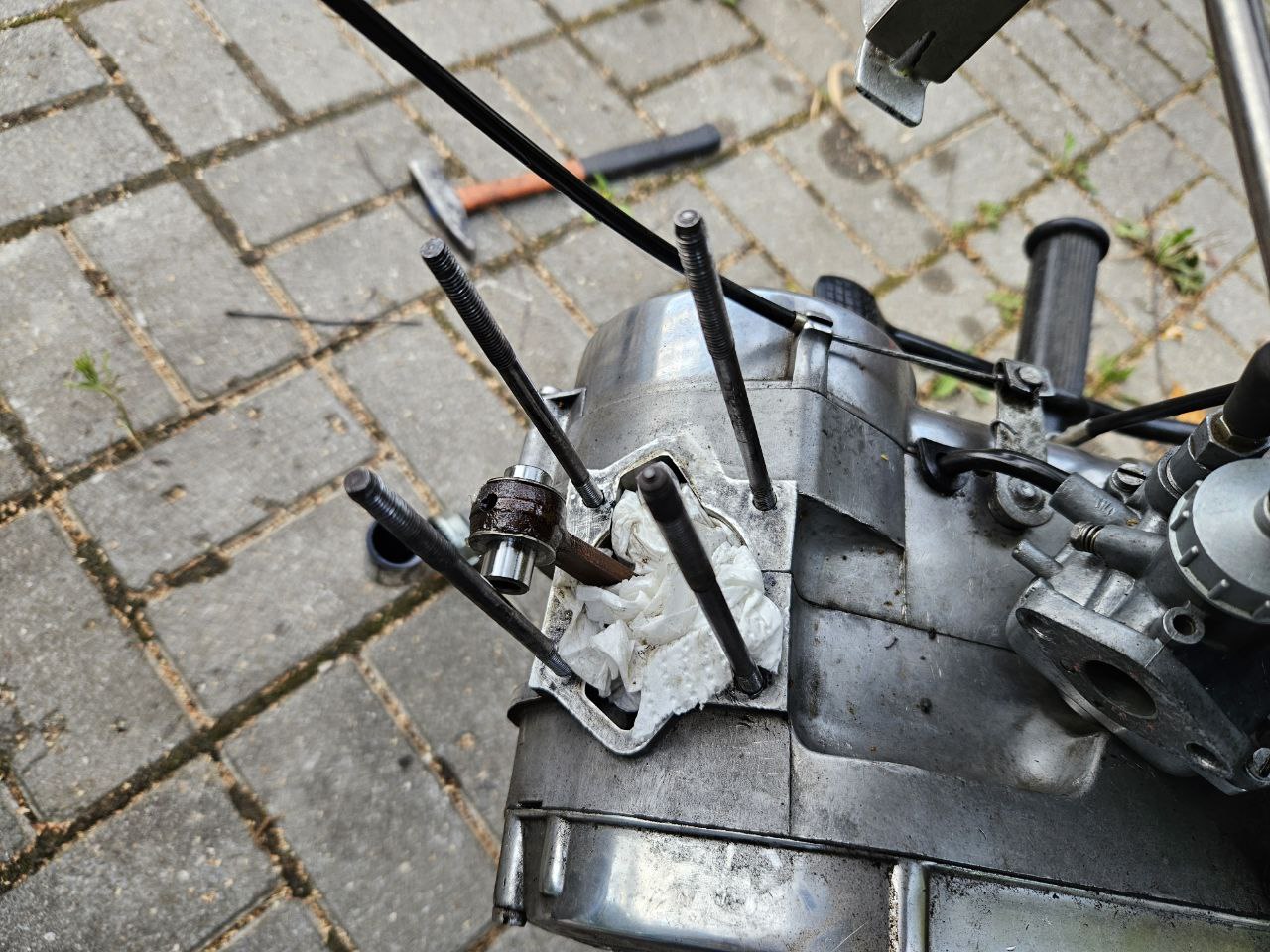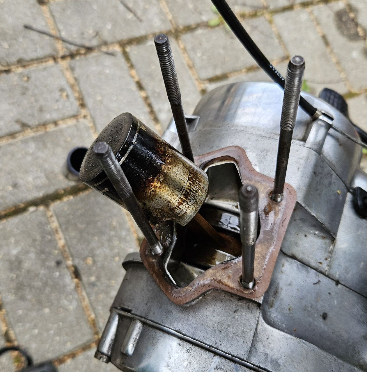 Ожидая что случился клин двигателя, принялся разбирать. Выдавить поршень удалось при помощи съемника и как оказалось, поршень просто прилип к цилиндру! Причина - нагар на поршне, кольцо залегло, НАГАР НА зеркале ЦИЛИНДРЕ!!! Все это склеилось маслом или отложениями старого бензина. Бензин в баке не обновляю, а только доливаю 1-2 литра каждый год. Катаюсь я очень редко, 2-3 раза за сезон. Изначально цилиндр был изношен, но я ставил спортивный поршень с одним кольцом. Двигатель в таком конфиге был очень резвым, но износ цилиндра и отложения старого масла в баке сказался негативным образом.