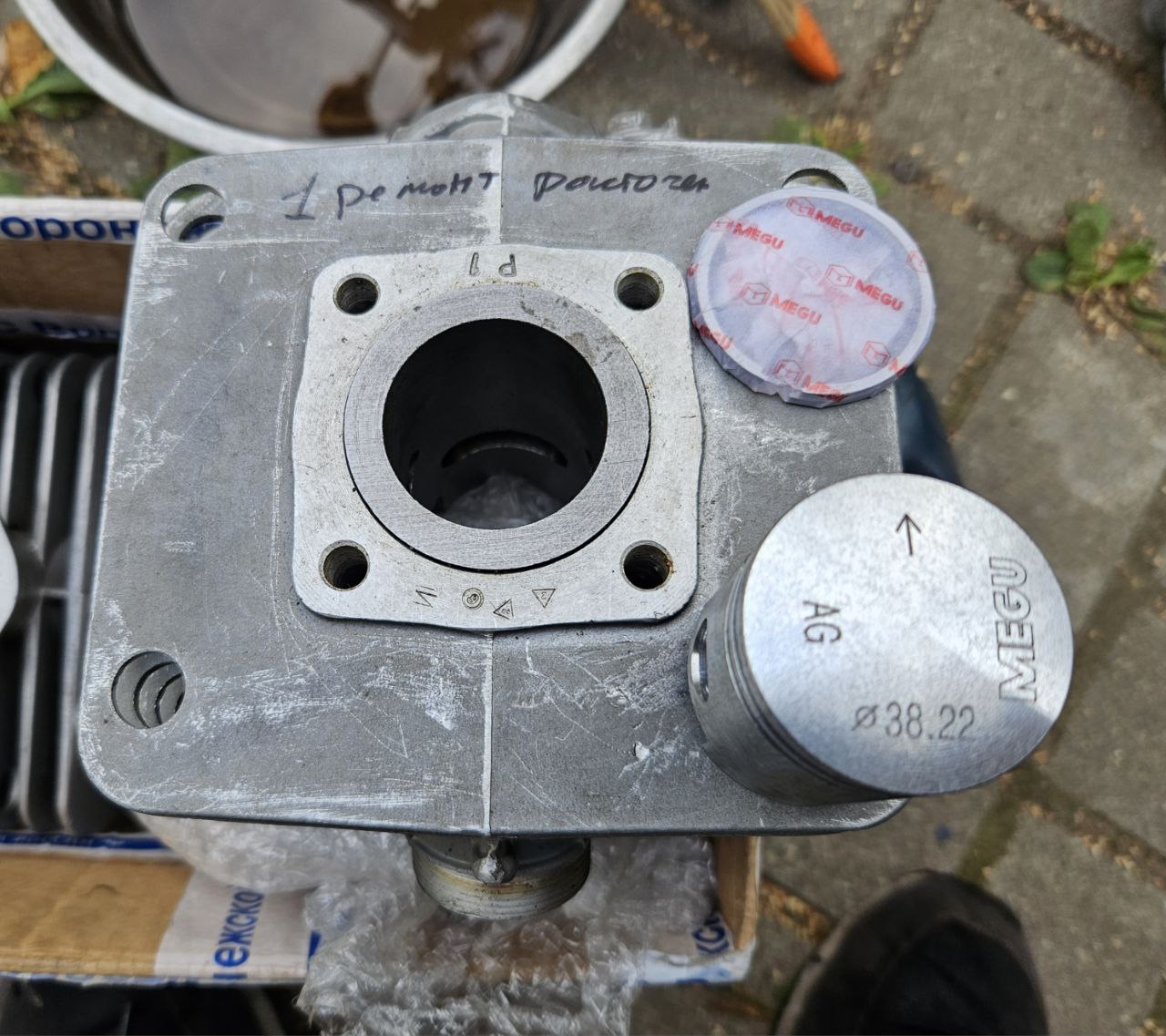 Решил менять на что-то новое. В запасах оказался новый цилиндр 1 ремонта от ВП-50 и подходящий немецкий поршень. Палец и подшипник ВГШ так же поставил новый. Мотор стал работать очень мягко, без лишних призвуков, но тяга конечно не та..