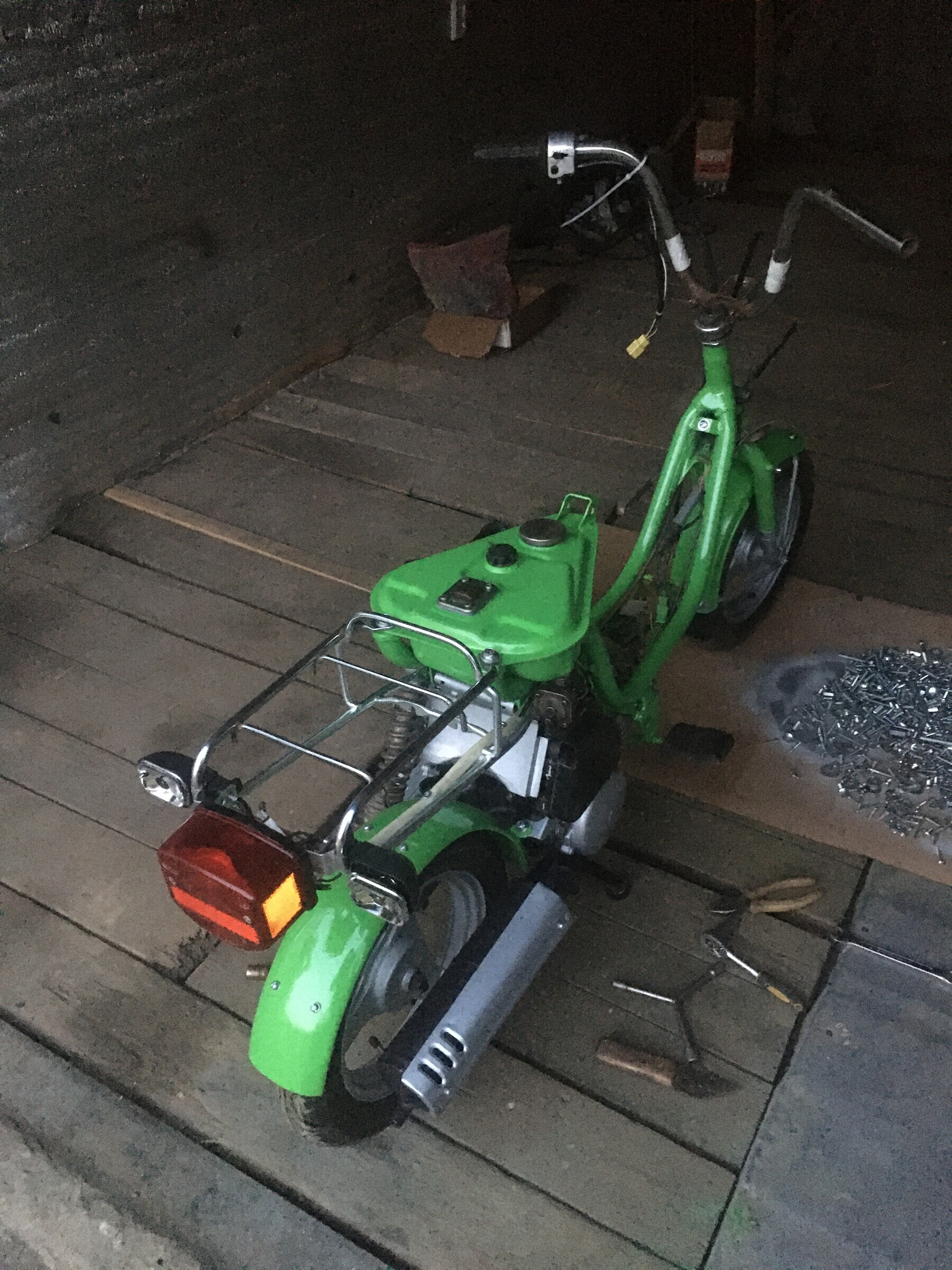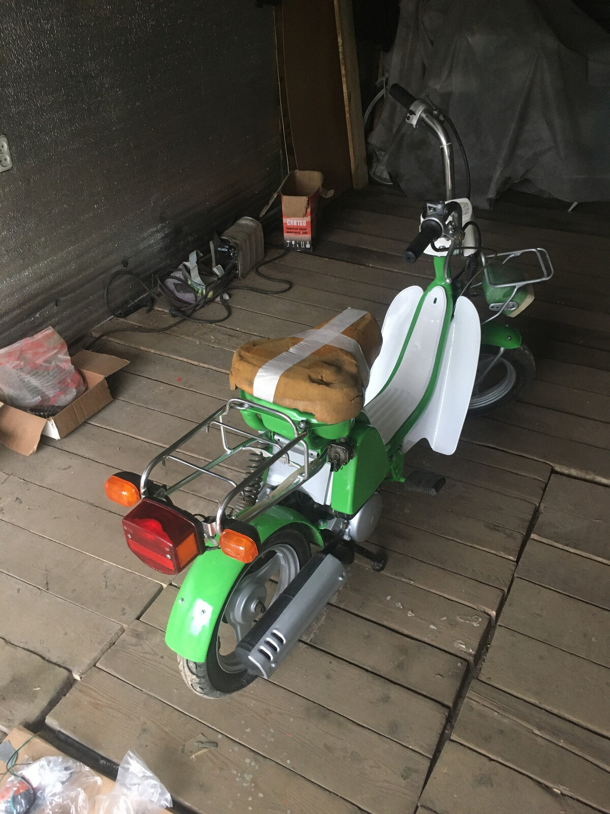 Подведем итоги. Мопед после покупки восстановился только через 13 лет примерно) Но мне понравилось, работая с этой японско техникой понимаешь насколько она технологичнее сделана. Везде предусмотрены дренажные каналы, пылезащита и т.д. датчик бензина, окно под количества масла, да масло мешать не нужно, оно само мешается из отдельного бачка. Конечно не сравнить с Ригой 26, а какой разгон с автоматической 2х скоростной коробкой, не знаю как они добились равномерной тяги на все протяжении разгона. По ощущениям едет максимум 50-55км/час, но тянет отлично до победного! Расход бензина пока высоковат, раза в 2 выше нормы, думаю жиклер стоит не родно или расточен, ибо компрессия на отлично! Брызговики вообще супер, двойная защита от брызг и грязи) Заводится тоже гораздо лучше чем наши V-50 т.к. за кик делает больше оборотов коленвала, про искру вообще молчу) Отличная на любой свече) Свечу не менял, стоит какая-то непонятная, скорее всего отечественная. Ну как-то так)) Для меня мопед конечно маловат, за то очень компактный) В планах бы сделать короб в багажнике под инструмент как в оригинале)