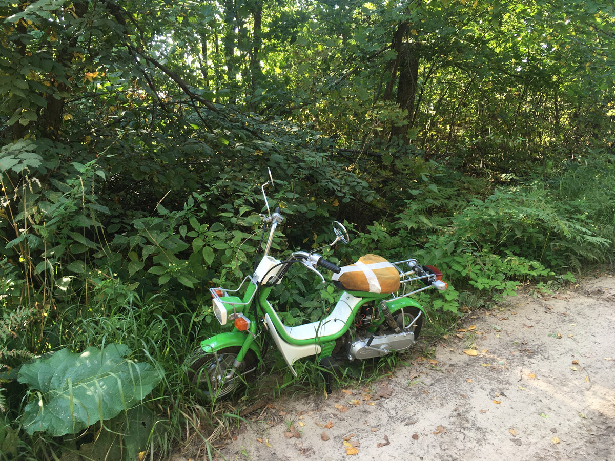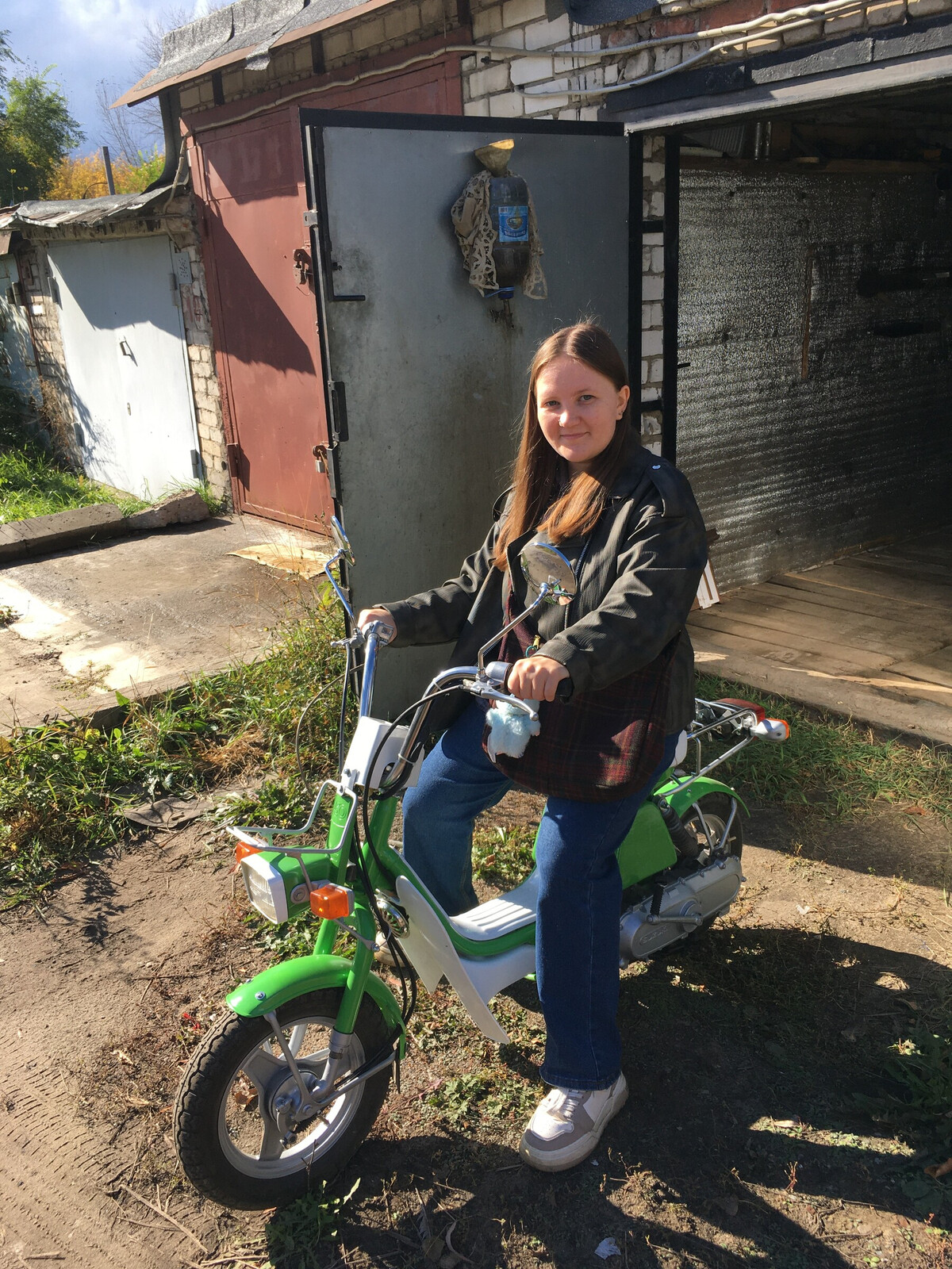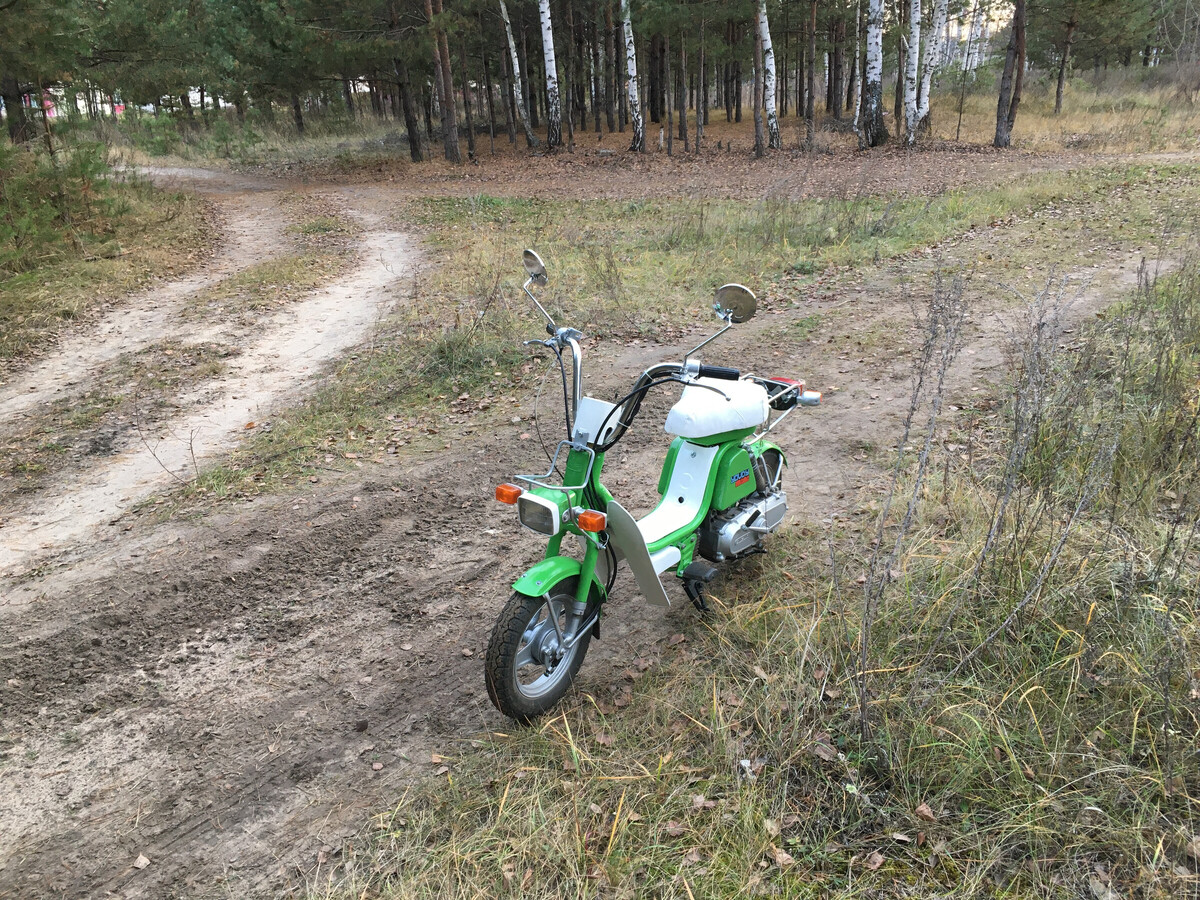 Один из покатушных дней, мопед очень маленький, и сравнить можно только с Ригой 26 (Рига-мини). Передняя резина оригинал с японии (была на мопеде), а вот заднюю покупал уже в мотомагазине, и вот тут тоже запара, нет уже таких размеров нигде и пришлось брать под заказ, и тут не все так гладко камеры под эту покрышку ну нигде нету. Поставил родную с двумя заплатками( Ну а что делать...