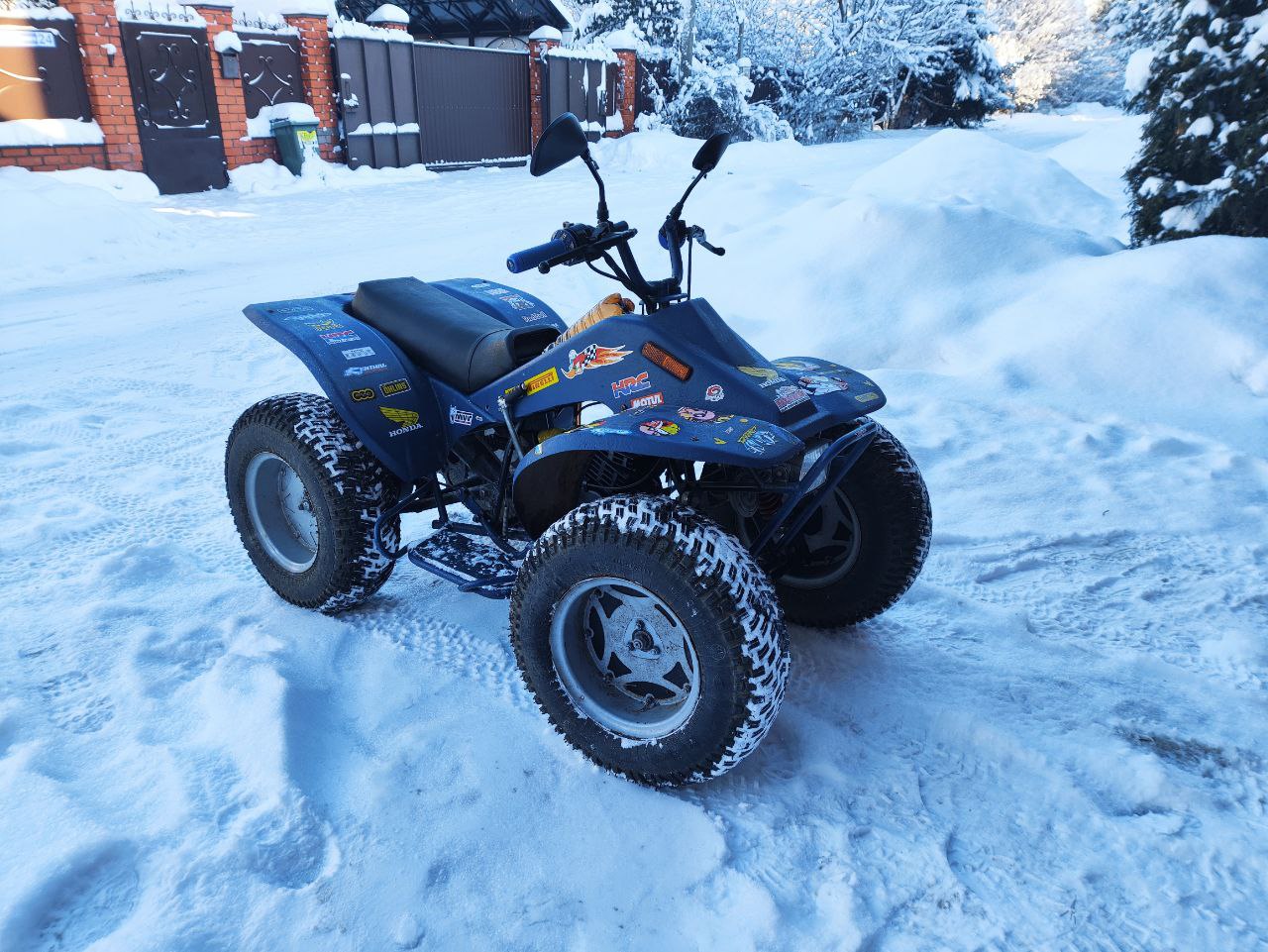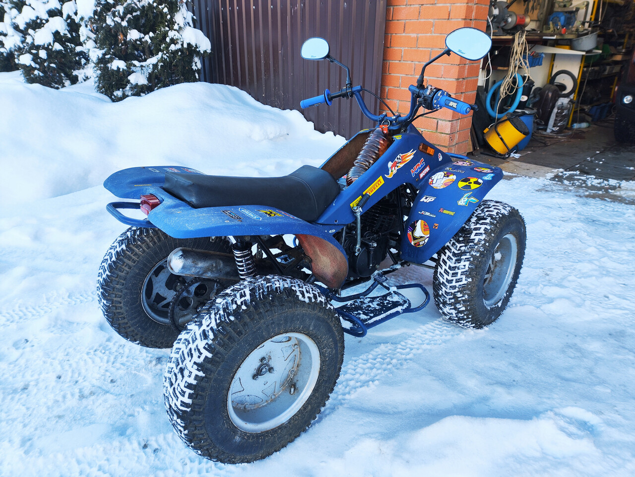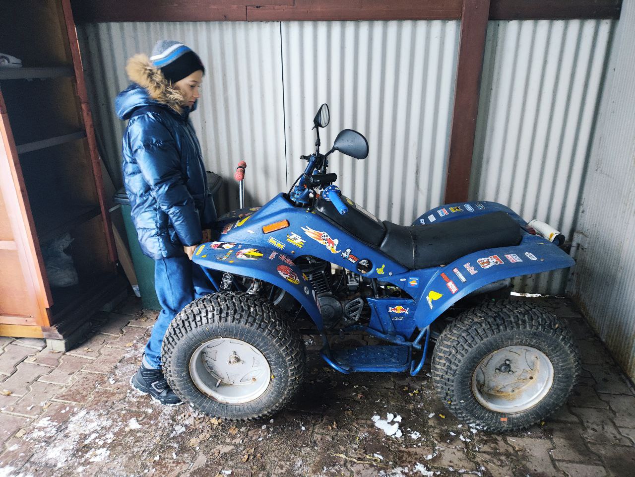 Дальше всё по классике - долгая стоянка за сараем на улице, клиническая смерть и продажа. К большому сожалению хозяин был не чужд прекрасного и облил весь квадрик целиком как попало синей краской с потёками. Вполне в саратовском стиле, но я почему-то не оценил. Изгажено всё, от руля до подножек. "Я так хотел его внешне освежить" - поведал мне эстет. Ну и гоночные наклейки как пудра из корицы на этом изящном капучино.