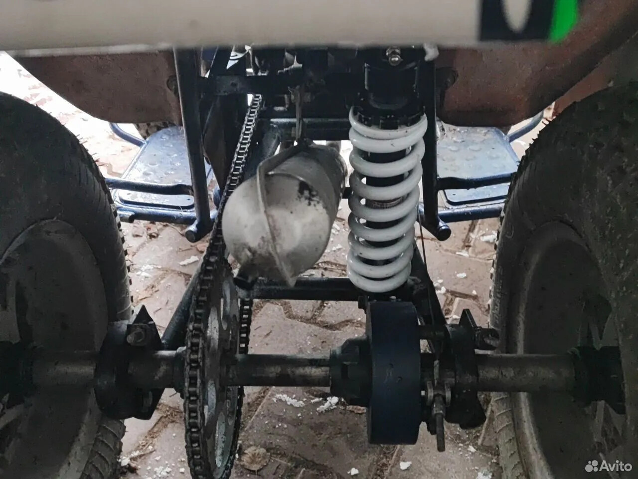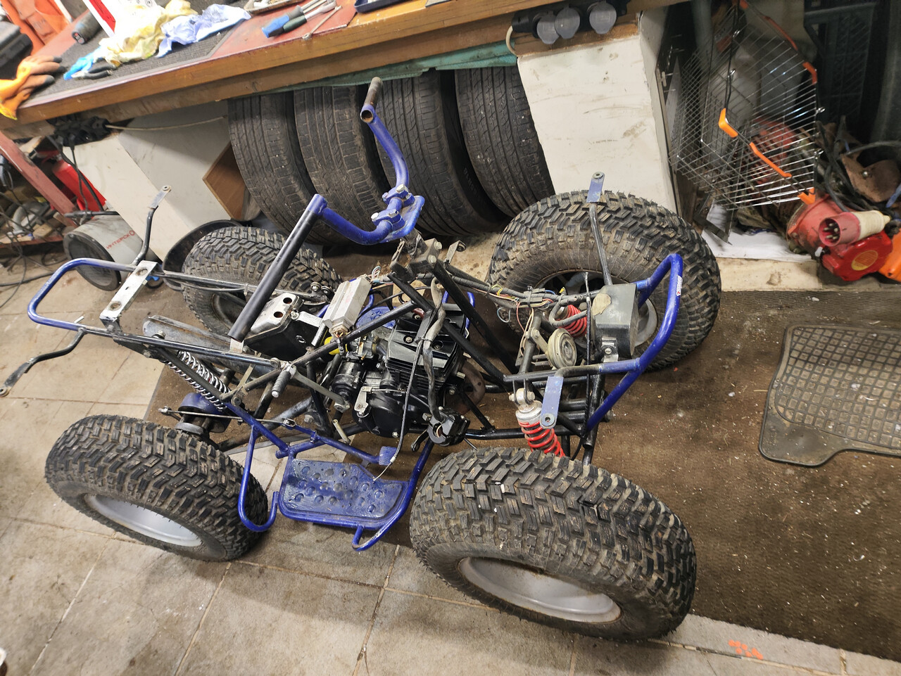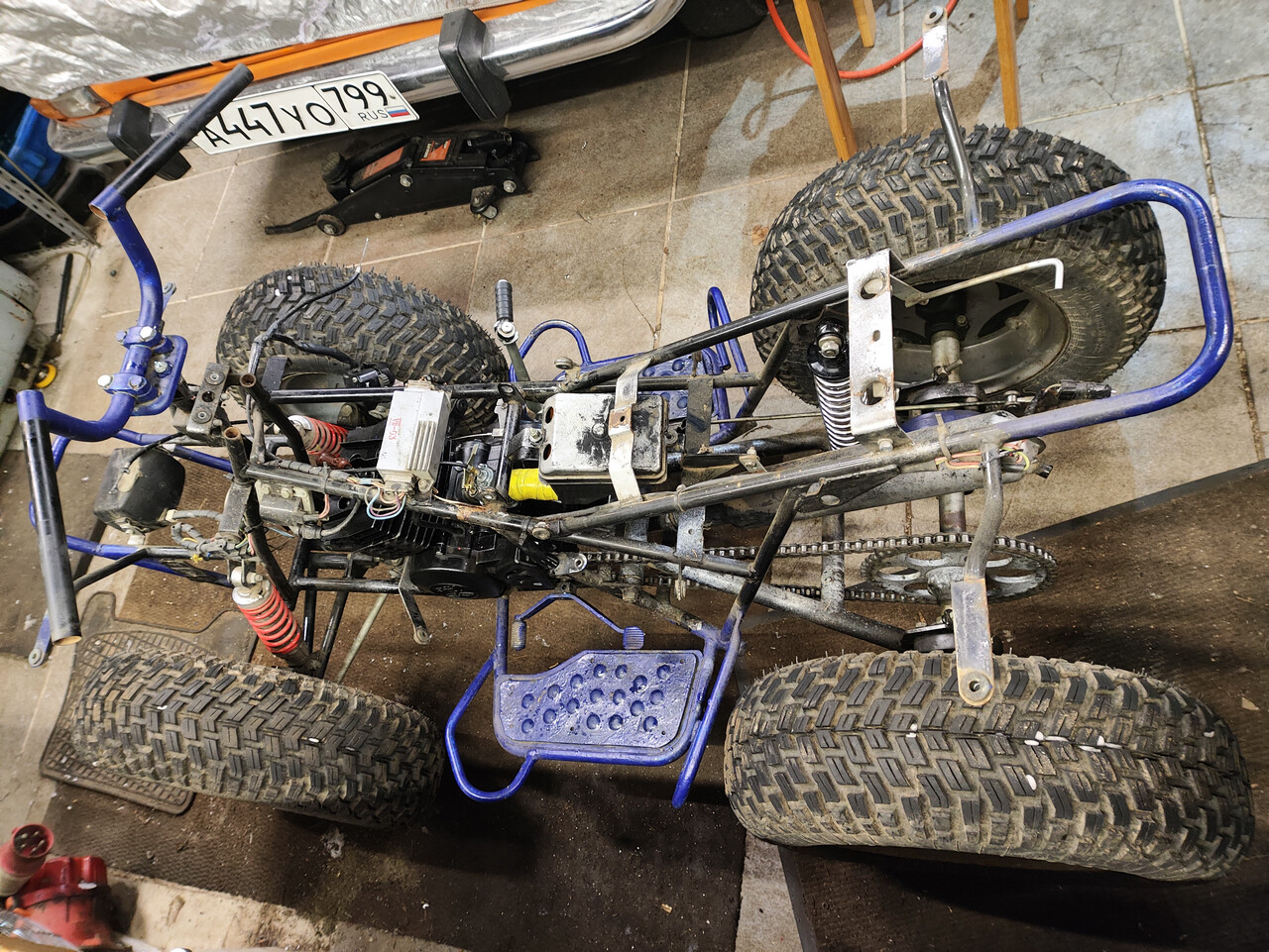 Итого - мотор заклинен, задний маятник нуждается в сварке-болгарке, резина в утиль (что в принципе не удивительно для покрышек Н-222, как туловод говорю), весь квадрик обдристан синей масляной краской веником из ведра. Торгуемся и берём!