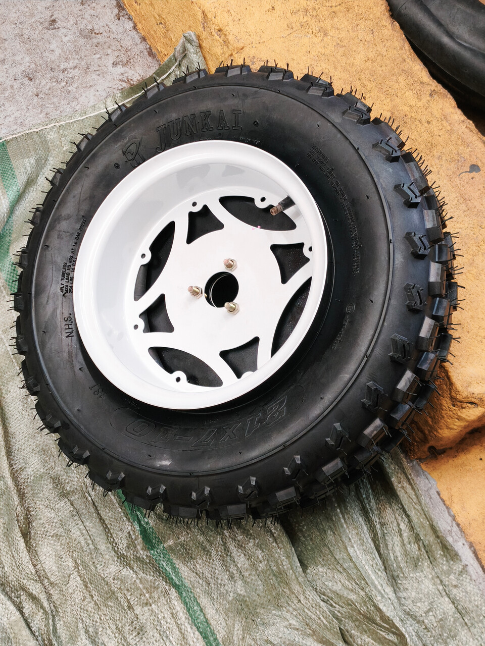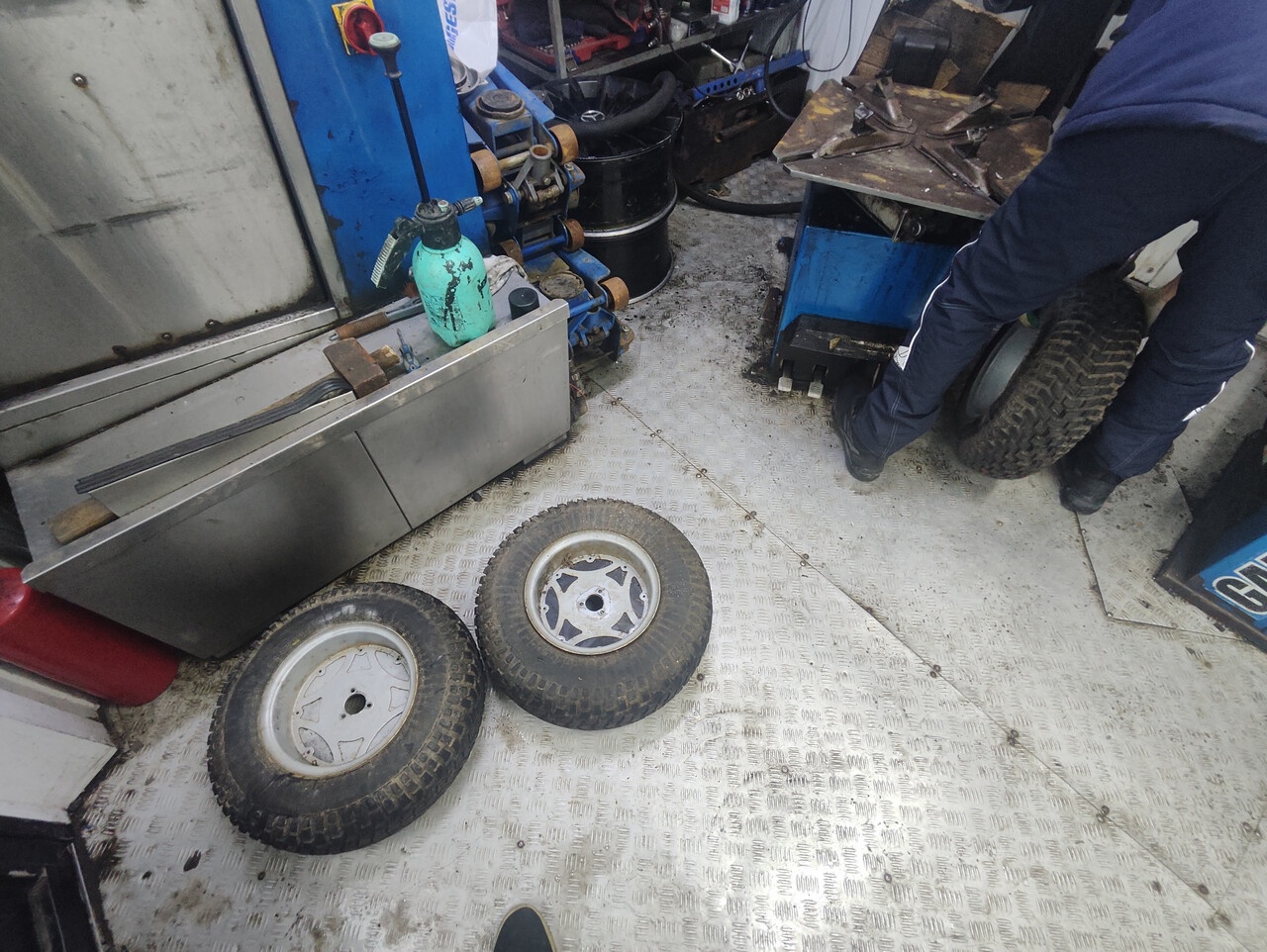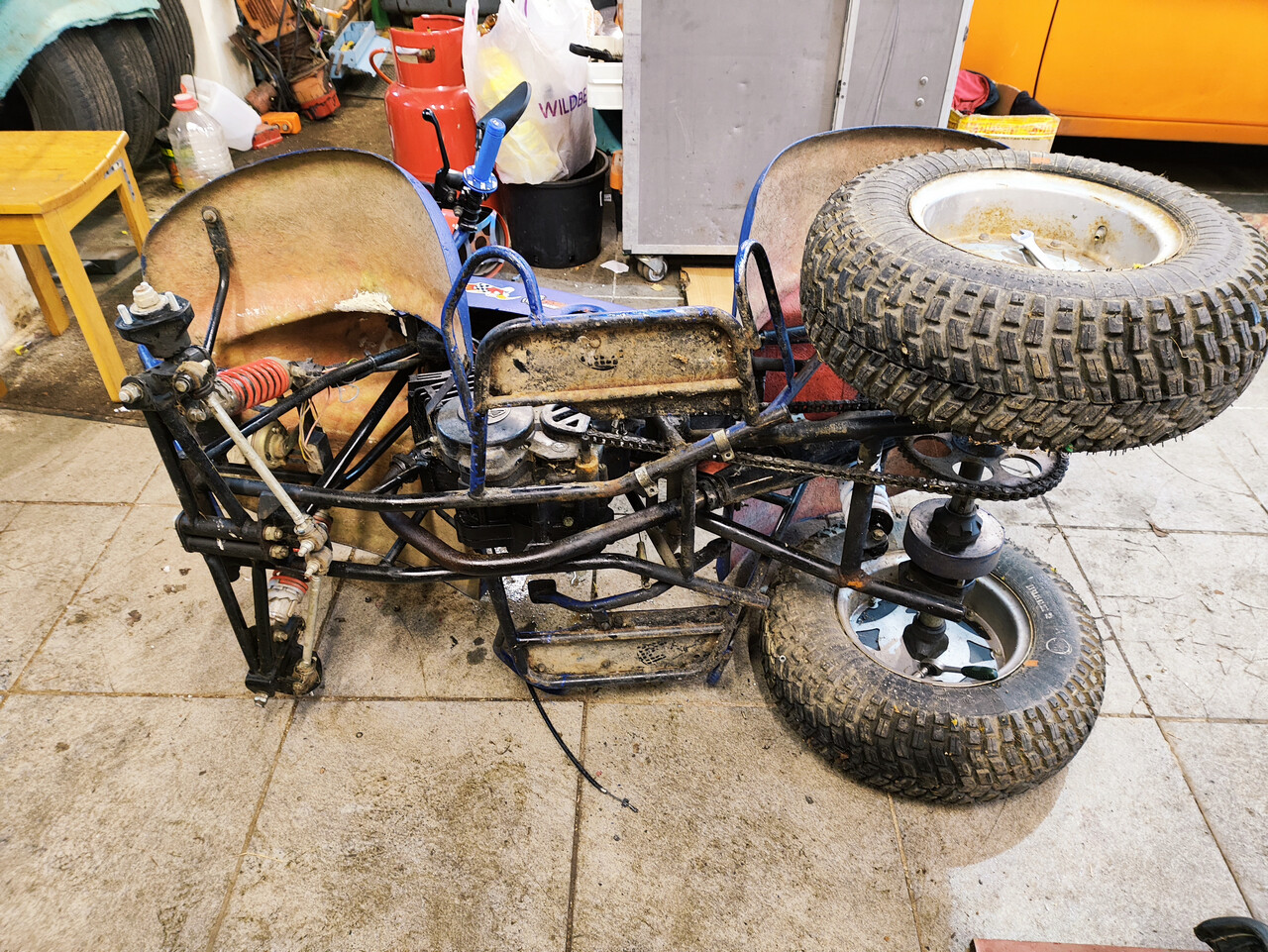 Итого - мотор заклинен, задний маятник нуждается в сварке-болгарке, резина в утиль (что в принципе не удивительно для покрышек Н-222, как туловод говорю), весь квадрик обдристан синей масляной краской веником из ведра. Торгуемся и берём!