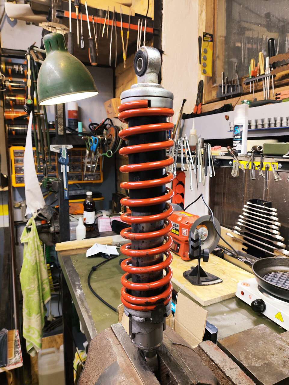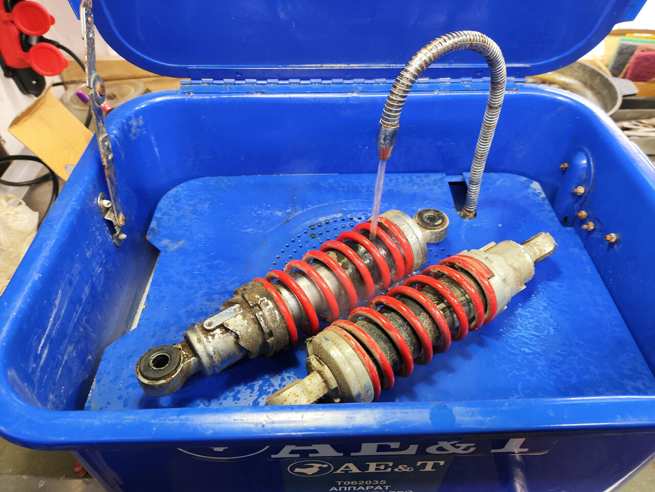 Вот вам бонусом передние амортизаторы - полный эксклюзив. Конструкция как у пилотовских-восходовских, но они на треть короче и имеют гораздо более мягкие пружины.
