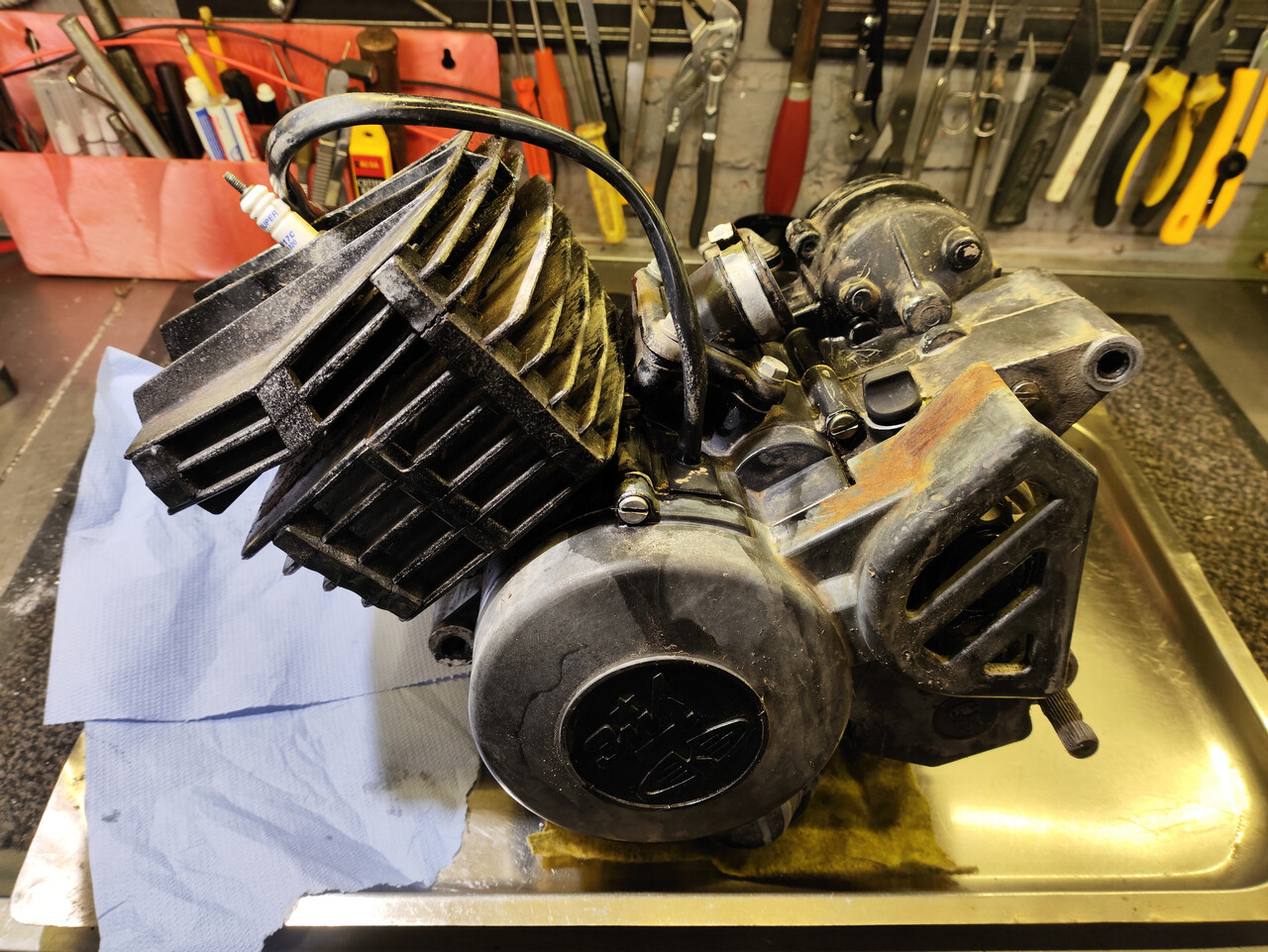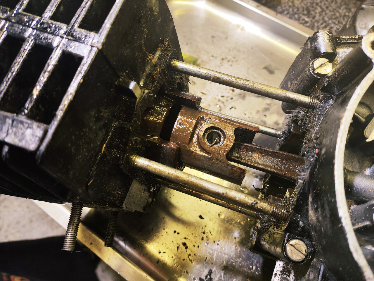 О том, что двигатель отправился в Вальгаллу, я знал ещё при покупке. Причины те же самые - стоянка на улице и водичка. Но хозяин был не только эстет, но и умел в консервацию техники! Мотор снаружи он залил цепной смазкой (до сих пор мучаюсь отмываю), а внутрь уже заклиненного цилиндра заботливо налил моторного масла.