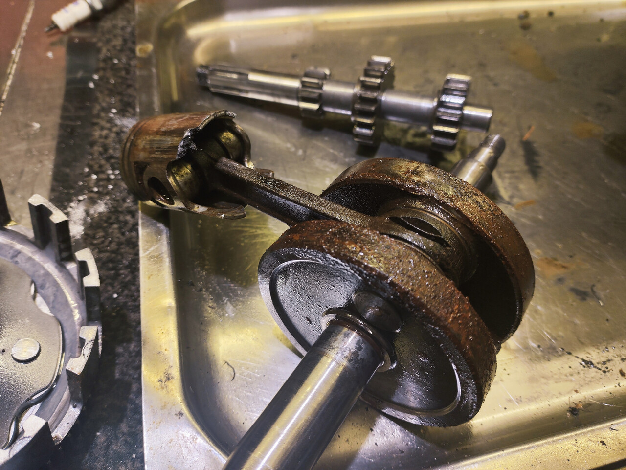 Коленвал тоже в перепрессовку. К счастью цапфы остались целы. В остальном мотор внутри НОВЫЙ. Он просто умер в младенчестве. Даже вечно драный нажимной столик сцепления щеголяет нетронутой заводской обработкой. Получается, что как и планировалось, по мотору я попал на поршневую с коленвалом, что в принципе норма.