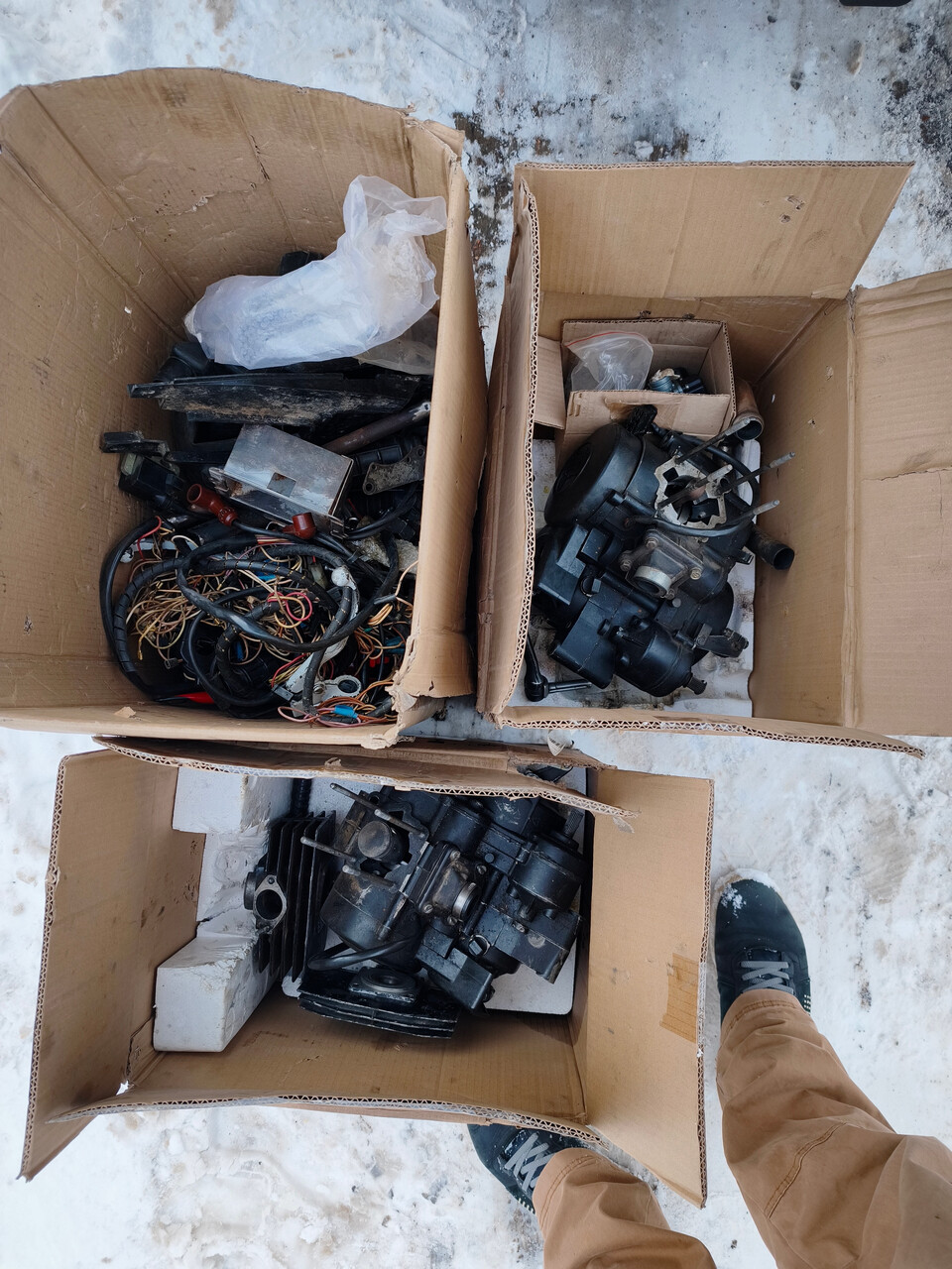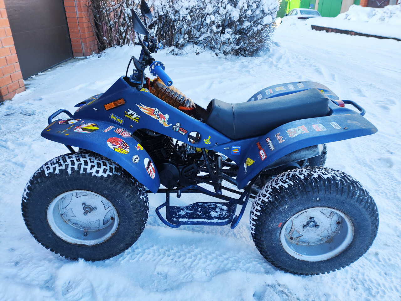 А пока - заряжаем вместо гнилого бака пластиковую бутылку с бензином и пробуждаем это древнее зло! Сразу ещё один конструктивный недостаток - пользоваться кикстартером ФЕЕРИЧЕСКИ неудобно! Серединой стопы кикать не получится, с размаху будешь пинать заднее правое крыло. Кикнуть получается только краешком пятки, что в зимней обуви добавляет удобства. В результате приноровился запускать мотор стоя сбоку от квадрика, носком правой ноги. Но электростартера этому транспортному средству не хватает просто безумно! Я сейчас вонзаю таковой на свой основной Пилот, если посчасливится найти ещё один - обязательно проинсталлирую на Робинзон.