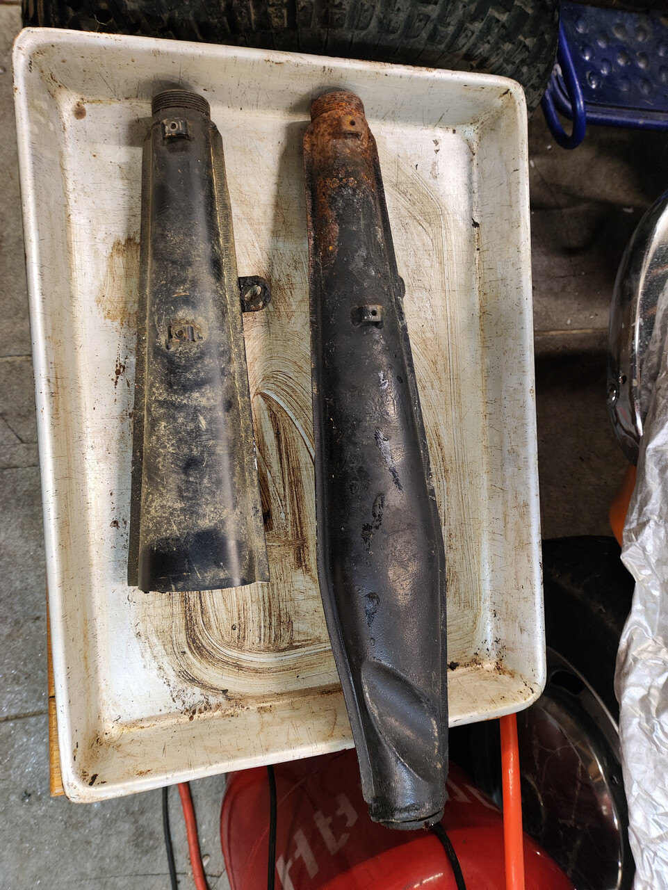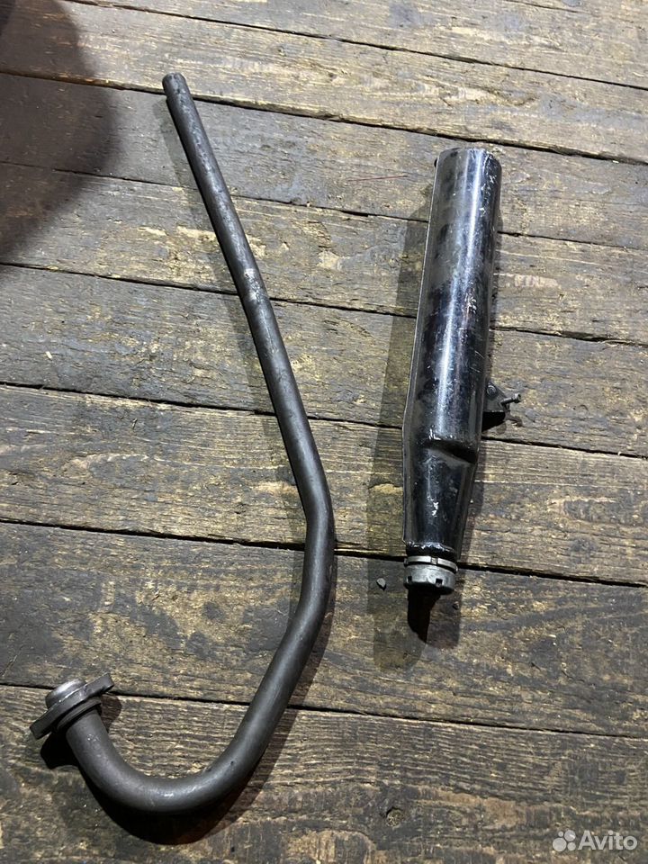 На глушаке стоит остановиться поподробнее. Как я понимаю, это тот самый узел, который душит пилотовский мотор с его 3.5 до 2.2 лошадок. Длиннющая выпускная труба заканчивается огрызком пилотовского глушителя, и визуально "пипка" у него даже меньше стоковой пилотовской. Надо замерить при случае. Этот глушак портить не буду, повешу на стену в назидание грядущим поколениям. А что я сколхозил взамен - чуть дальше.