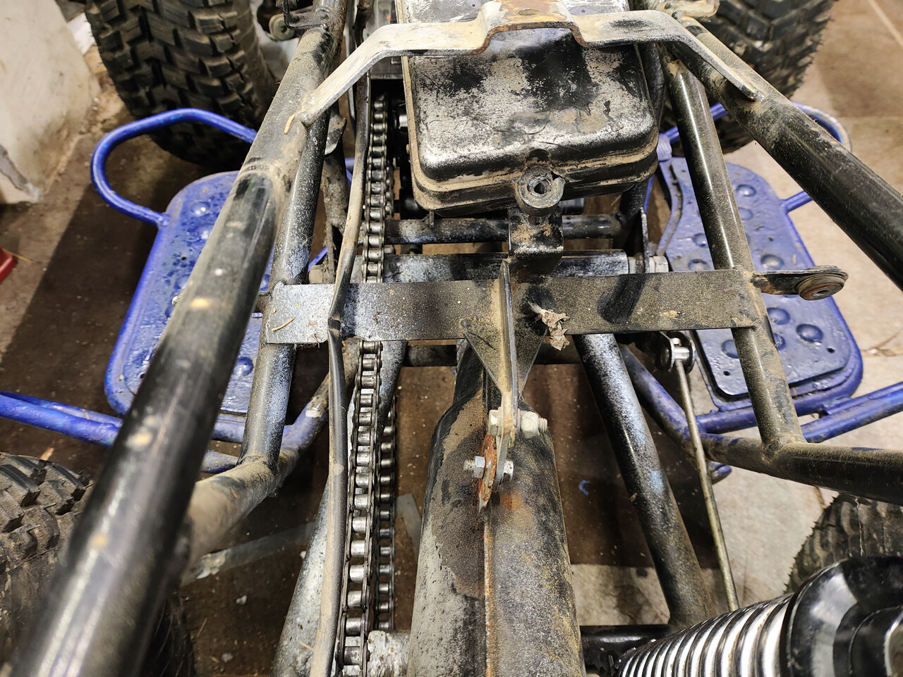 Вонзаем его в квадрик заместо убитого, к которому неспешно заказываем недостающее. Сразу вылезает неприятный конструктивный косяк. Пилотовский воздухофильтр (который тут нужен как корове седло) висит враспор между двумя перемычками на раме. Обе из полосы 2мм толщиной и гнутся просто руками. А на задней перемычке висит заодно кургузый, но довольно увесистый глушак. И играющая под его весом перемычка рвёт уши крепления фильтра. В дальнейшем в это место сделаю усиливающую пластину, которая будет воспринимать нагрузку вместо пластмассового корпуса.