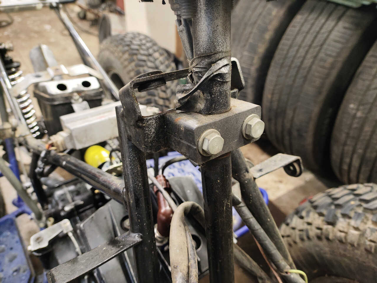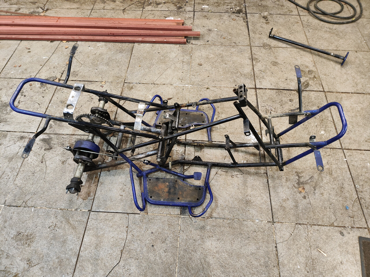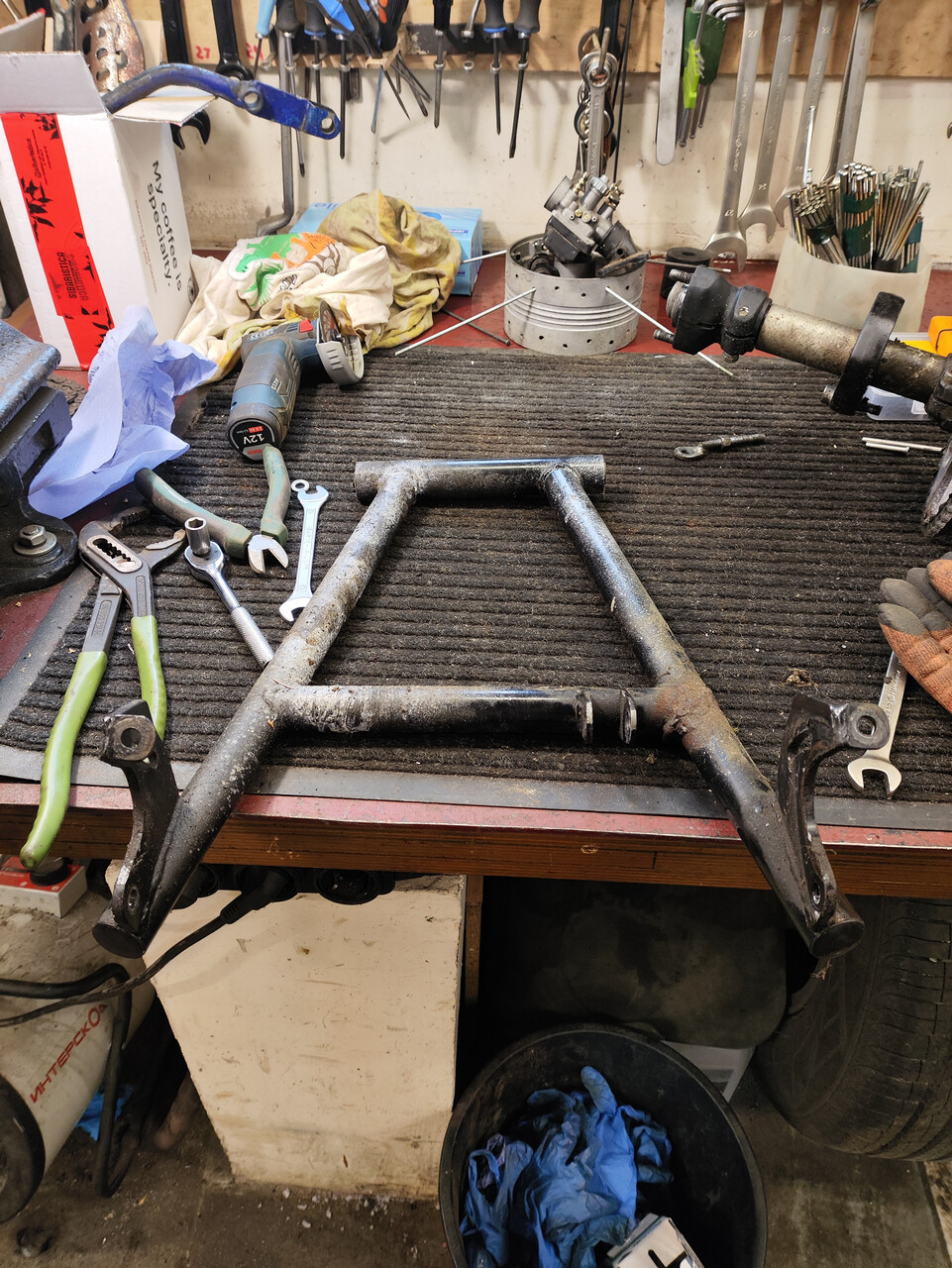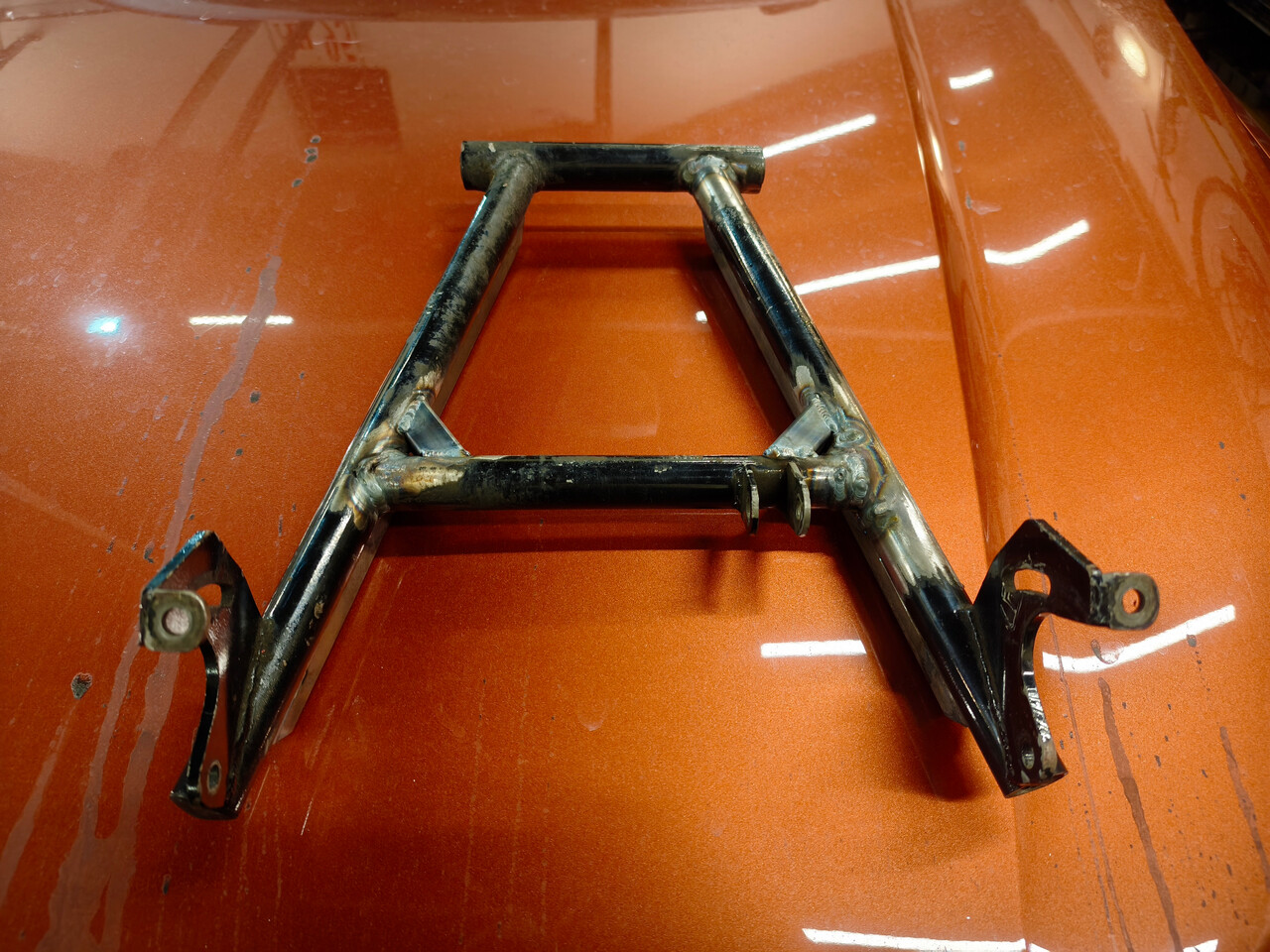 С маятником предстоит немало головной боли. Помимо вырванного и криво привареного крепления амортизатора, вся геометрия винтом. Придётся резать, варить, усиливать. Ну и не устраивать гонки взрослыми дядями в дальнейшем.