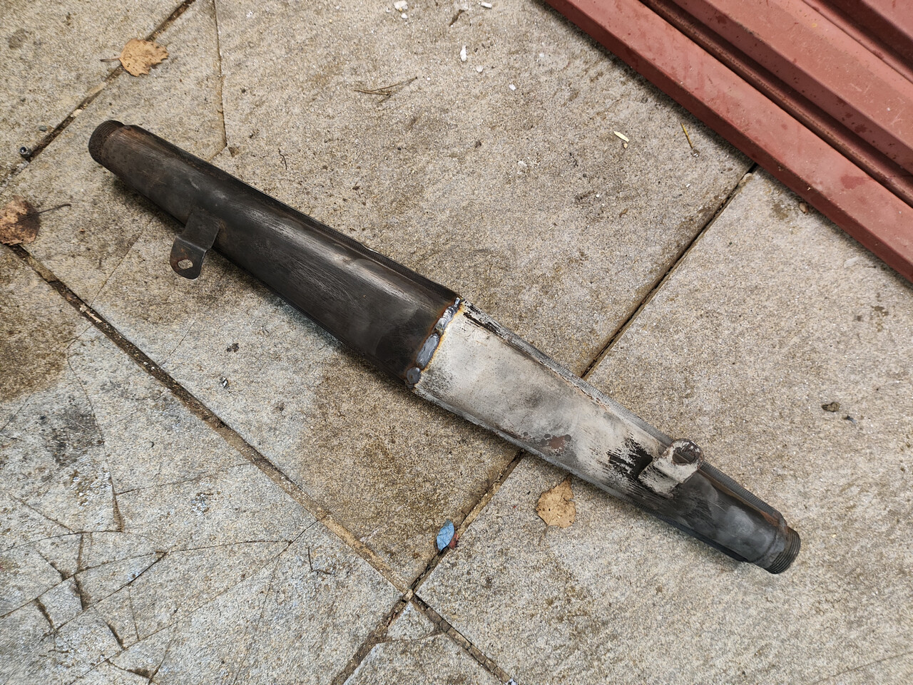 Из двух половинок сварил такой вот, прости господи, "резонатор". Не думаю, что он там всерьёз будет что-то резонировать, но он позволит расположить его значительно ближе к выпускному патрубку, и не будет ничего душить. Какой маффлер присрать на его выходе - придумаю позже, с этим проблем не вижу.