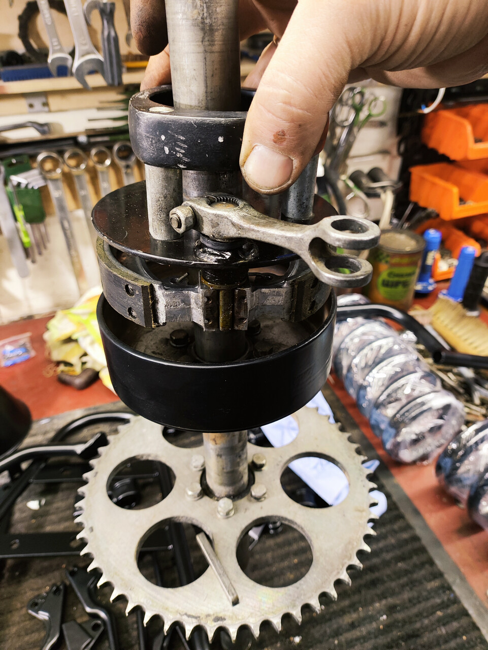 К сожалению, толком настроить всё это для пущего удовольствия от езды не вышло. Штатный Jikov и так не очень хорошо работает в связке с 40мм поршнем, ему очень не хватает воздуха. А глушак-душитель добавил проблем, вместо выхода на максимальные обороты - строчка, как на дешке. Всё это будет доводиться до ума, а пока - приступаем к разборке. Без пластика обходные технологии видны во всей красе.