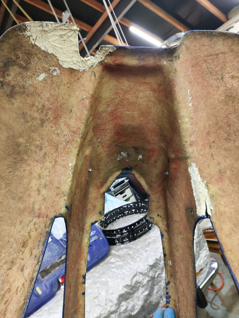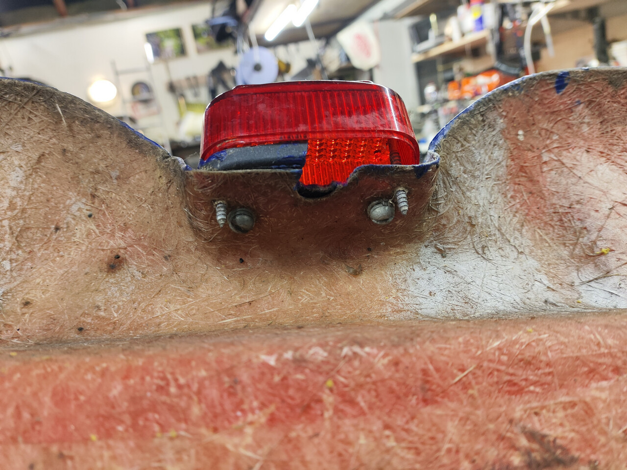 Проблемы по пластику. Задняя половина целая. Спереди есть трещина и выгрызен кусок. И то и другое пытались починить какими-то соплями, к счастью они крошатся в руках и легко удалятся. Отдал другу на ремонт, сам стеклоткань клеить не умею. Но вышкуривать всё это от сантиметрового слоя окраски "по-саратовски" предстоит всё равно мне