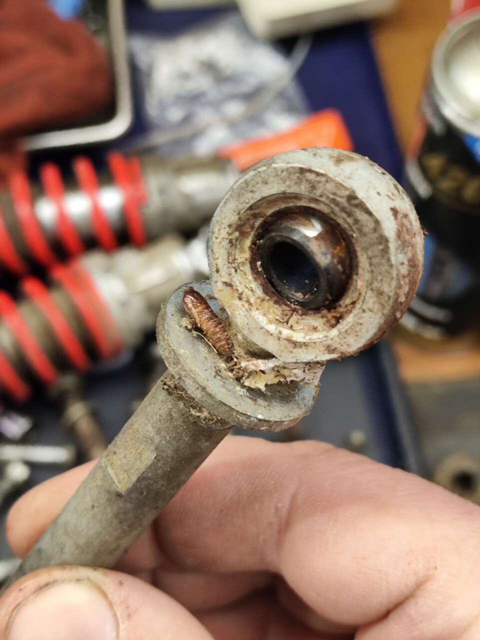 Рулевые тяги на обычных маленьких ШСах под болты М8. Все четыре с завода явно были без смазки, по крайней мере я следов её не обнаружил даже в окаменелом виде. Даже личинка под пыльником жила спокойно, пока я её не потревожил.