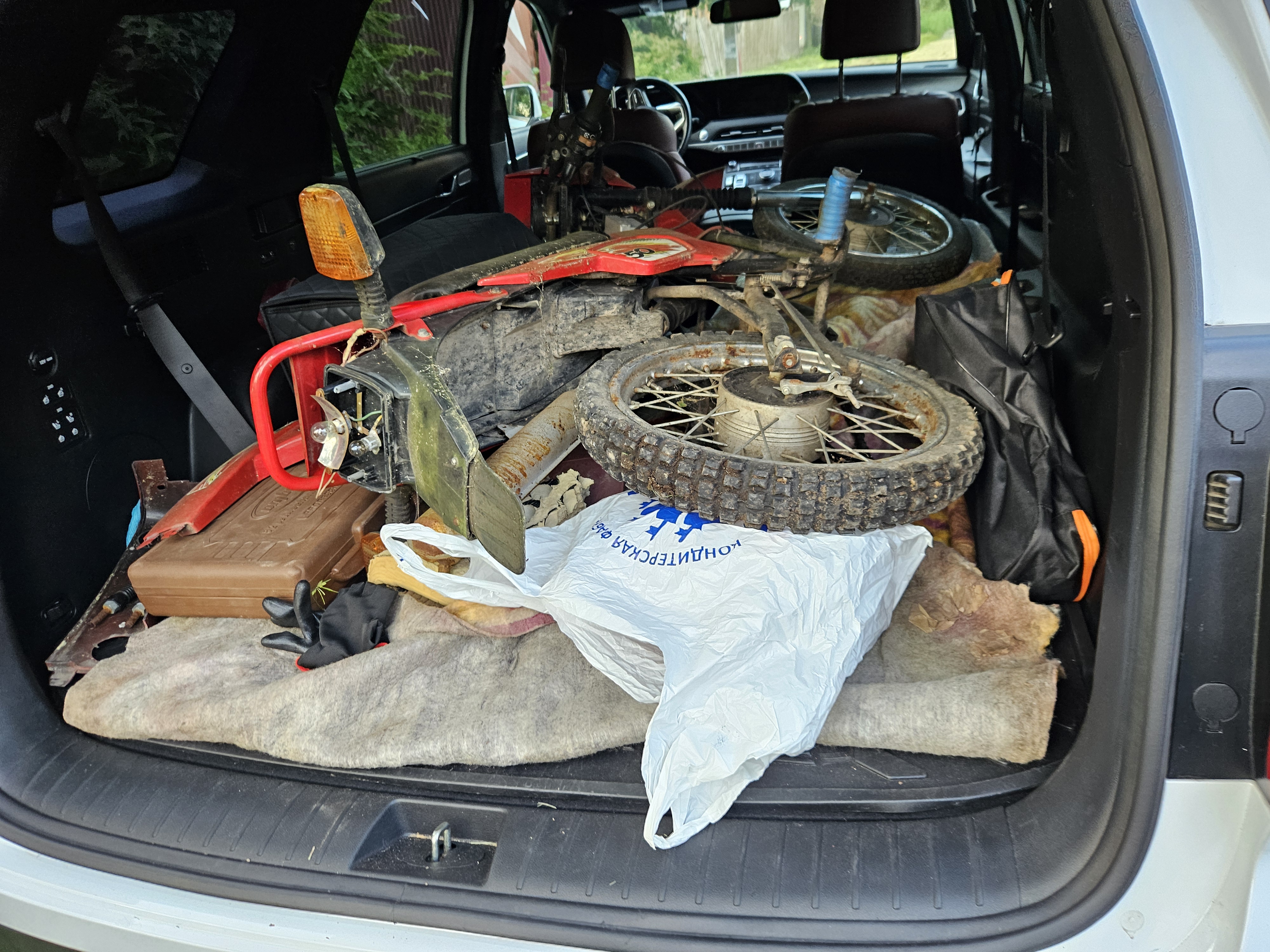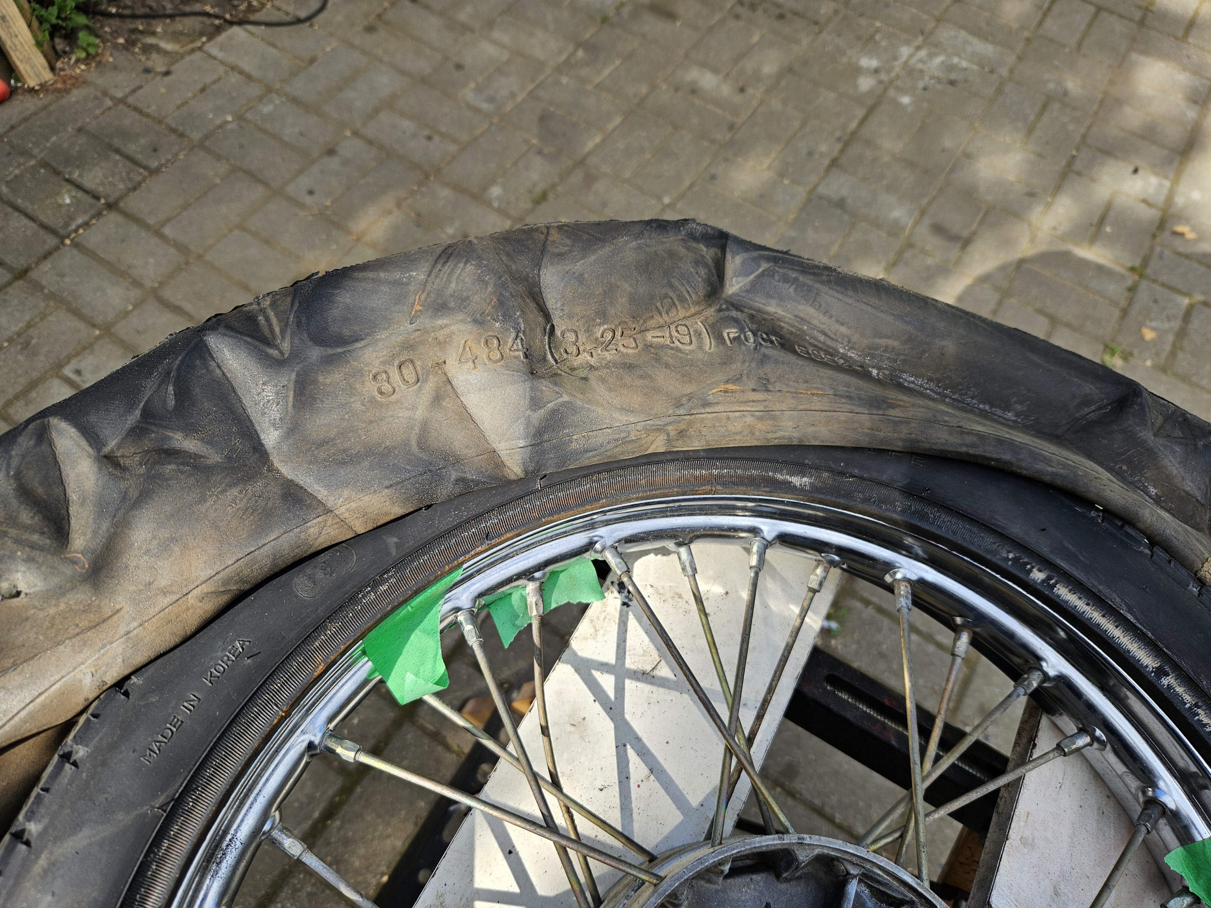 Но прикол оказался в другом. При разборке переднего колеса была извлечена камера, немного не по размеру 3,25 на 19 дюймов. Деревенские методы ремонта, когда подходящее не достать, а ездить хочется.