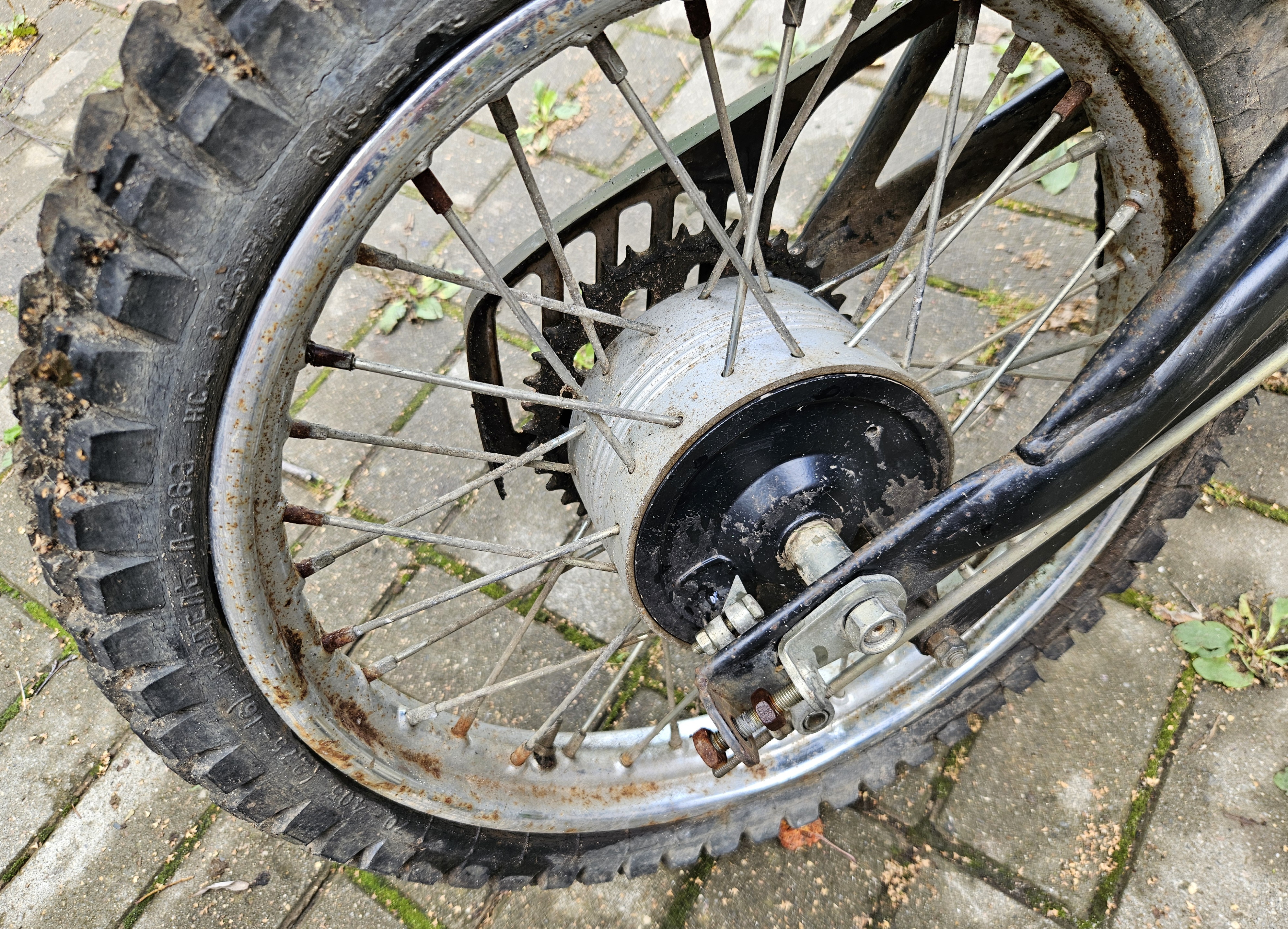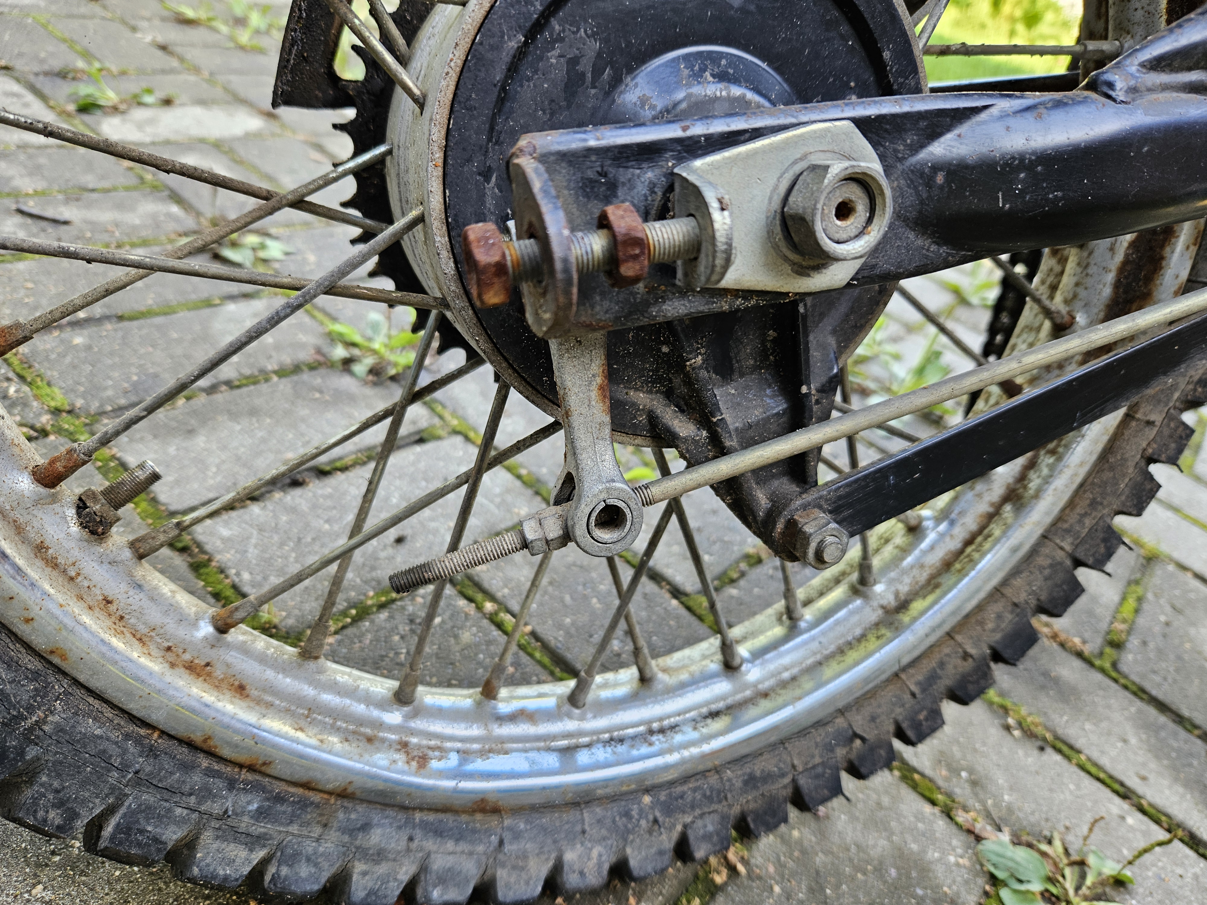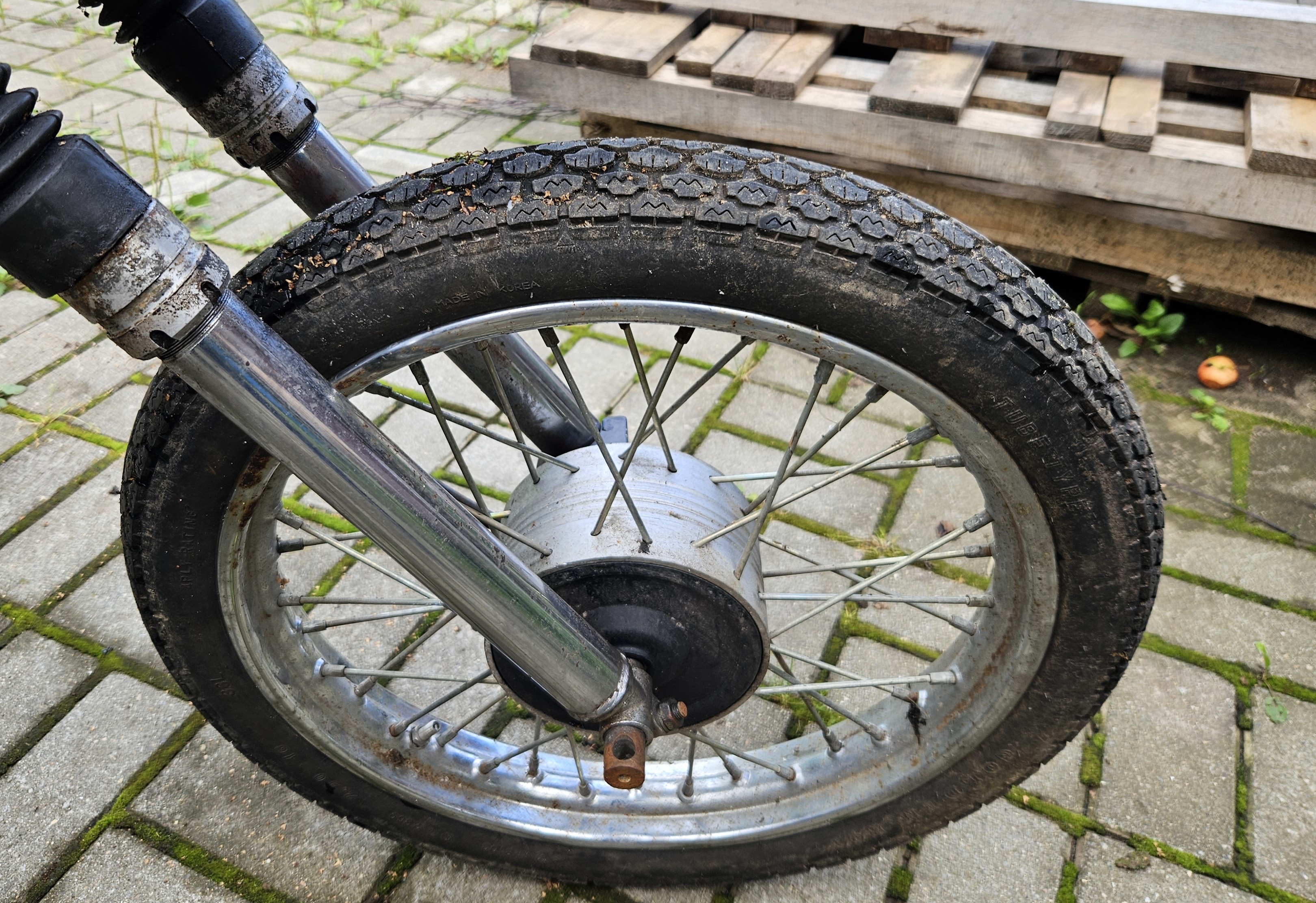 Долгий простой под открытым небом конечно же сказался на состоянии колес. Хром, особенно на заднем, при первичном осмотре показался сильно ржавым.