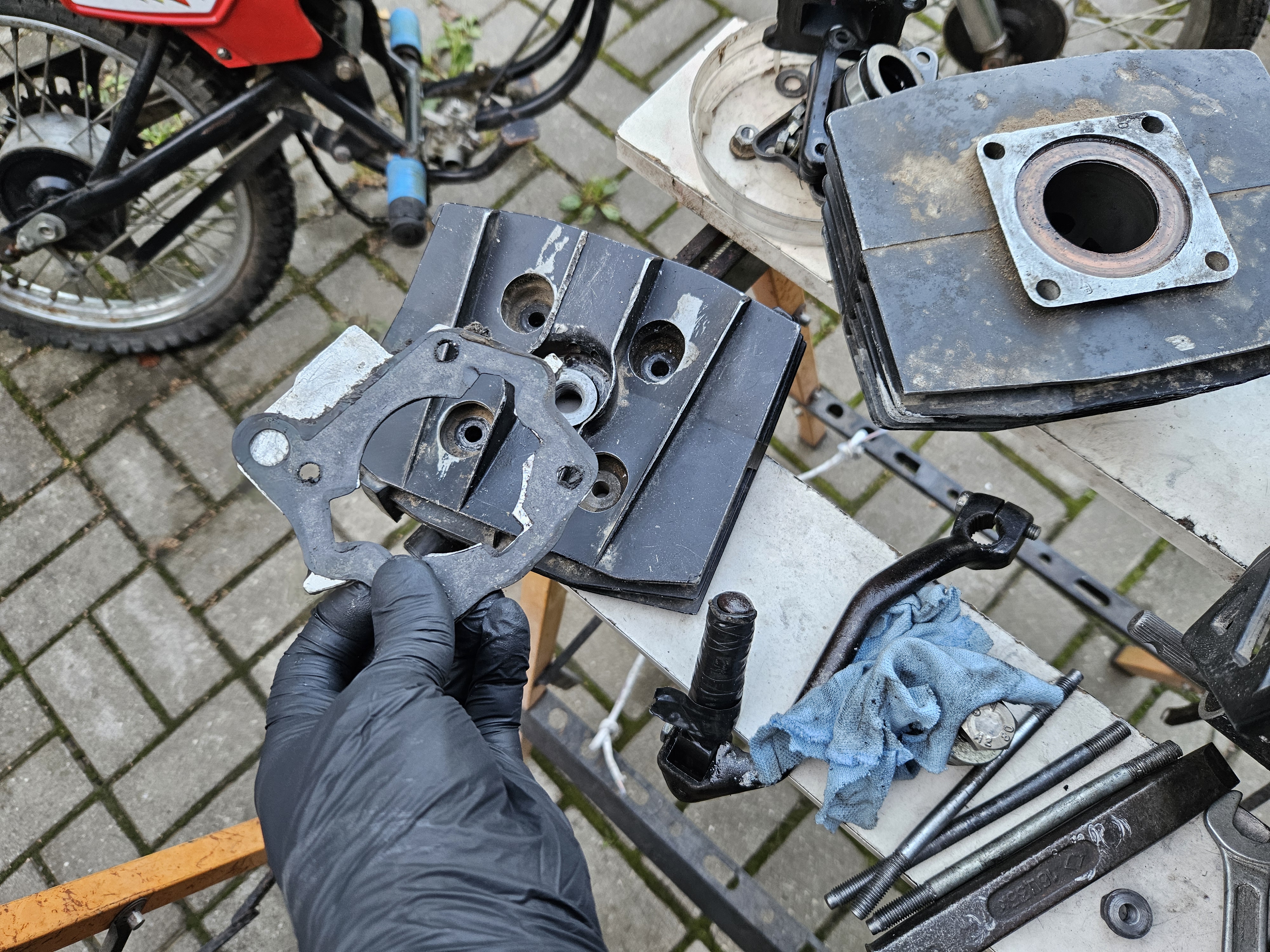 Конечно же сразу вскрыл поршневую на обоих моторах, у каждого оказались свои нюансы. Пилотовский мотор оказался с расточенной поршневой под поршень 40мм от Honda Dio, о чем так же свидетельствует алюминиевая прокладка 2 мм. Цилиндр оказался изношенный, придется его растачивать на 40,25. Коленчатый вал присмерти, благо купил одним лотом коробку запчастей, там пару коленвалов плюс новый цилиндр, а так же куча мелочевки,  которой уже несколько раз был крайне рад.