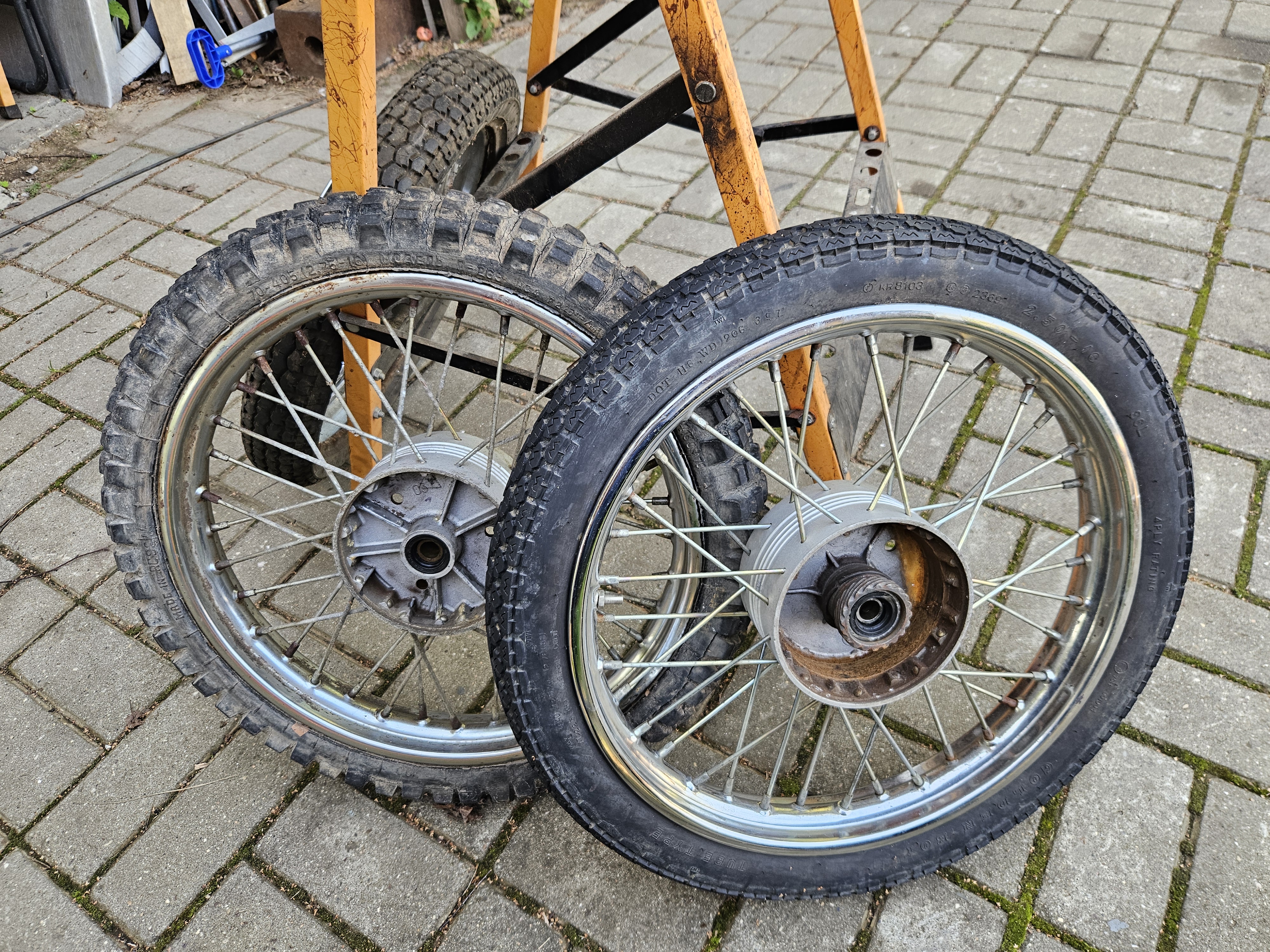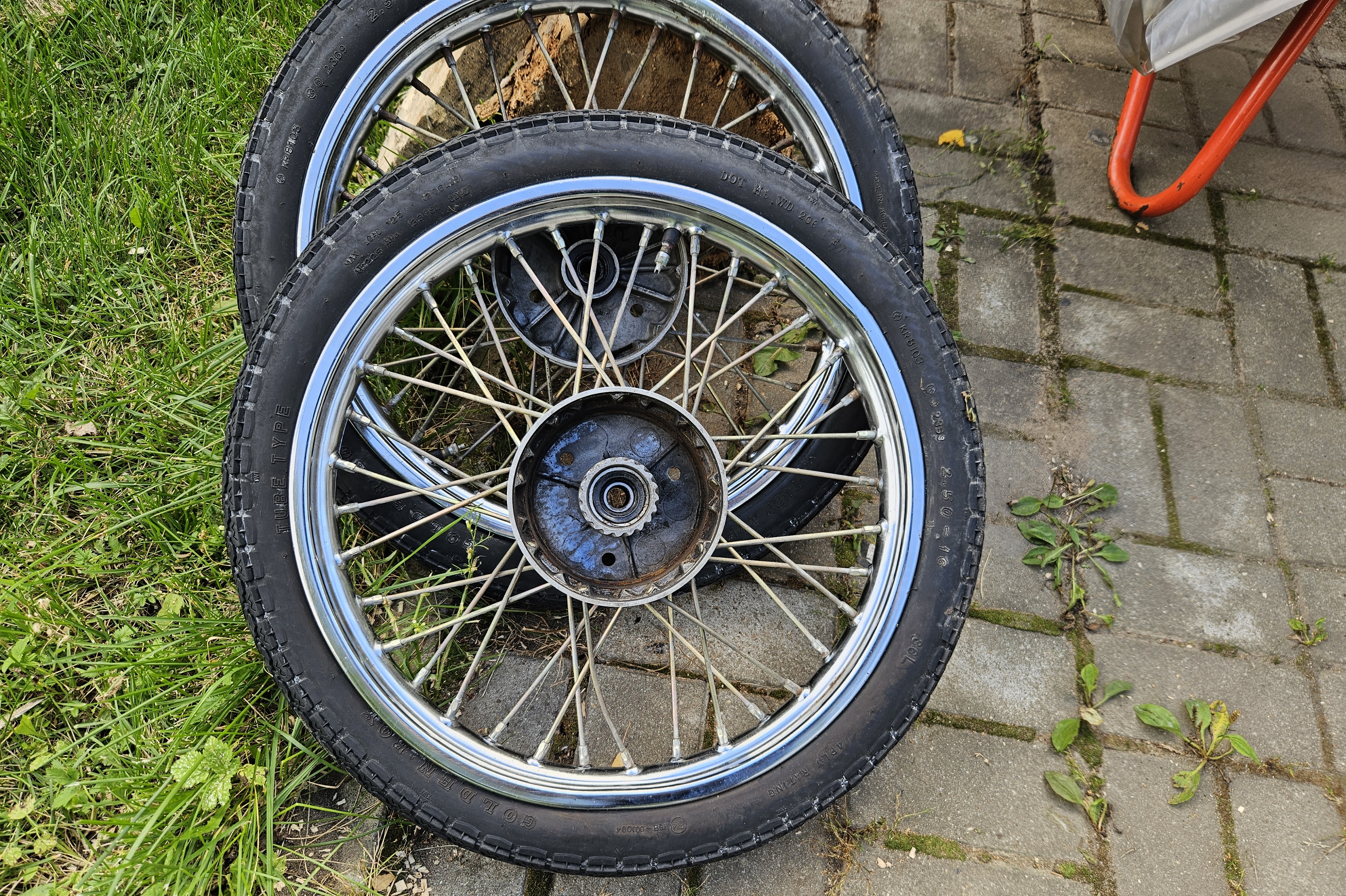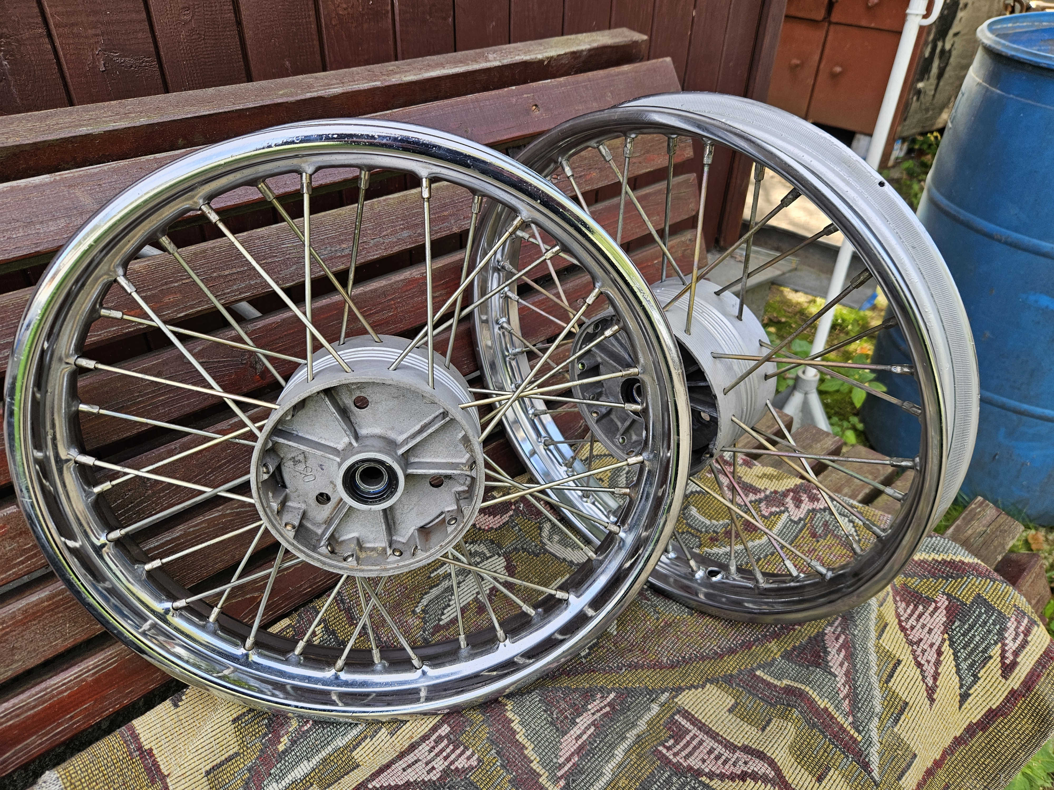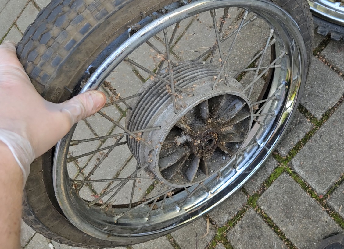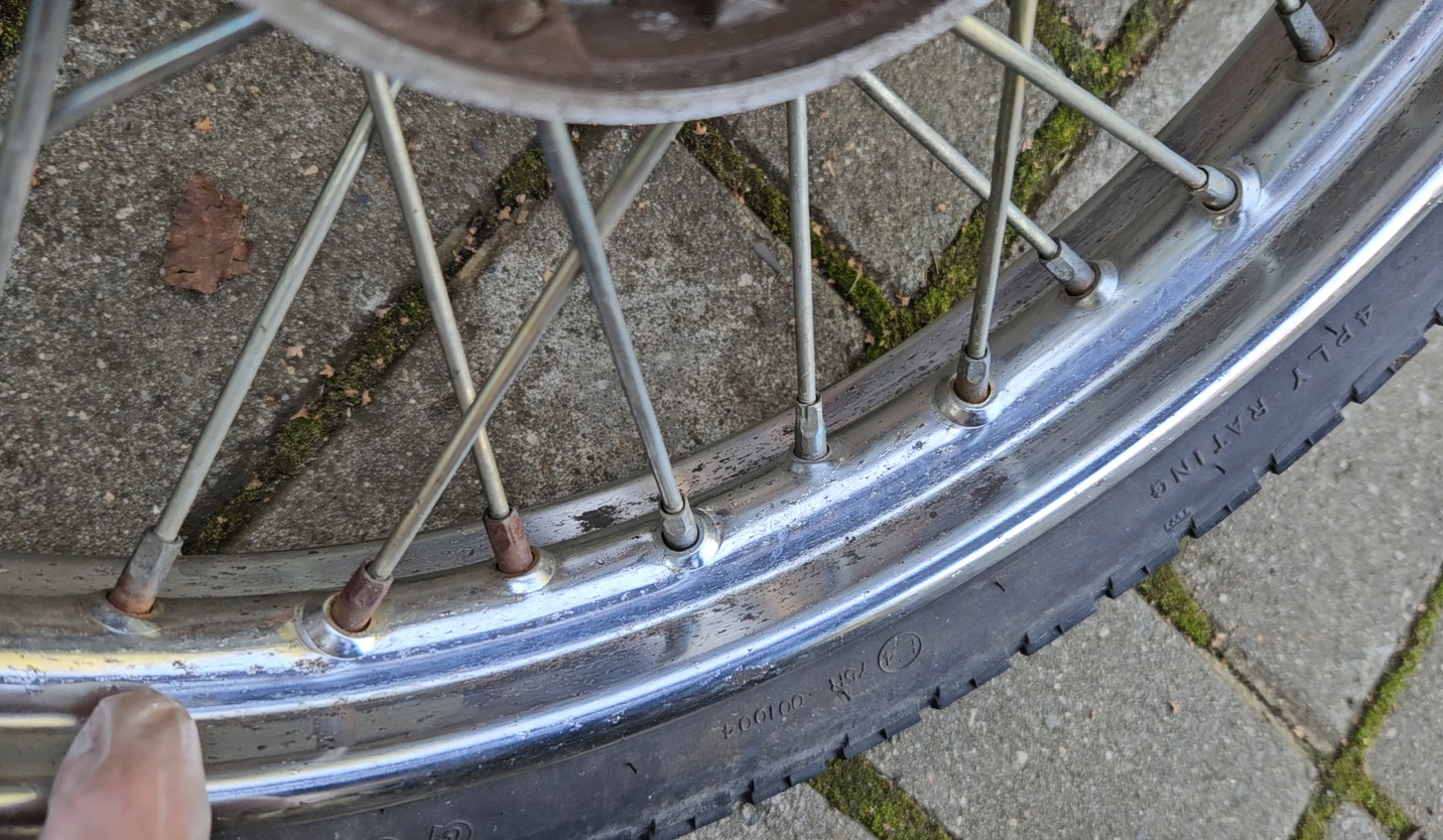 Посмотрел цены на пилотовские колеса и немножко подрасстроился - дорого и не факт что лучше моих. Почитал доступные ресурсы, оказывается можно поставить обод от Восхода или Явы, правда он будет чуть шире. А у меня в загашнике уже 20-25 лет лежит колесо от Явы старушки. Досталось случайно в крайне свежем состоянии, но лежание на пользу не пошло, появились мелкие окислы на хроме, но после протирки оказалось очень приличным, решил использовать этот обод на зад.