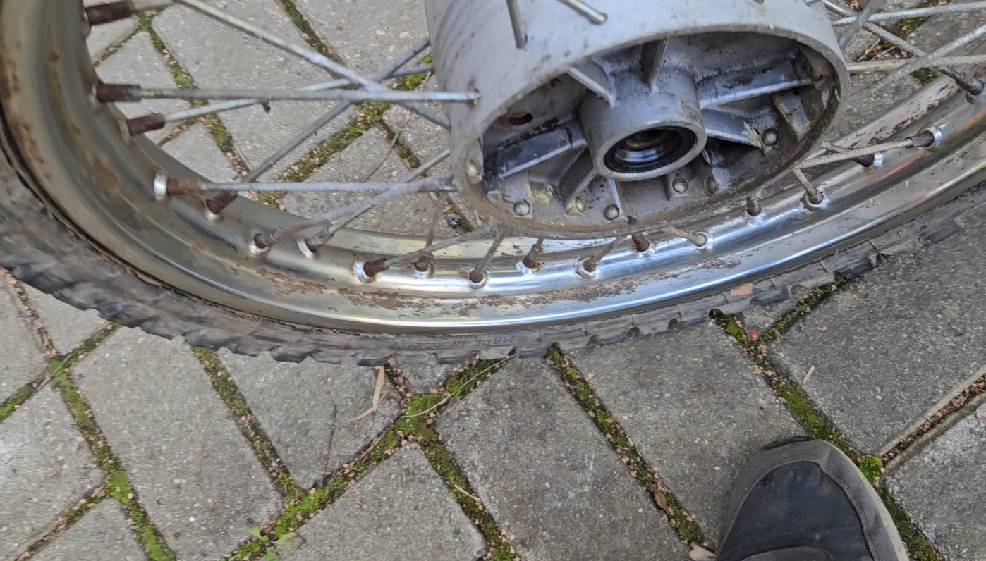 Тем временем, все же удалось купить пару Пилотовских колес за копейки. На переднем хром в идеале. Заднее хуже, но получше моего переднего. В чем же подвох аттракциона невиданной щедрости? Обода были сильно гнутые, особенно задний. К примеру, на фото видно гнутую спицу.