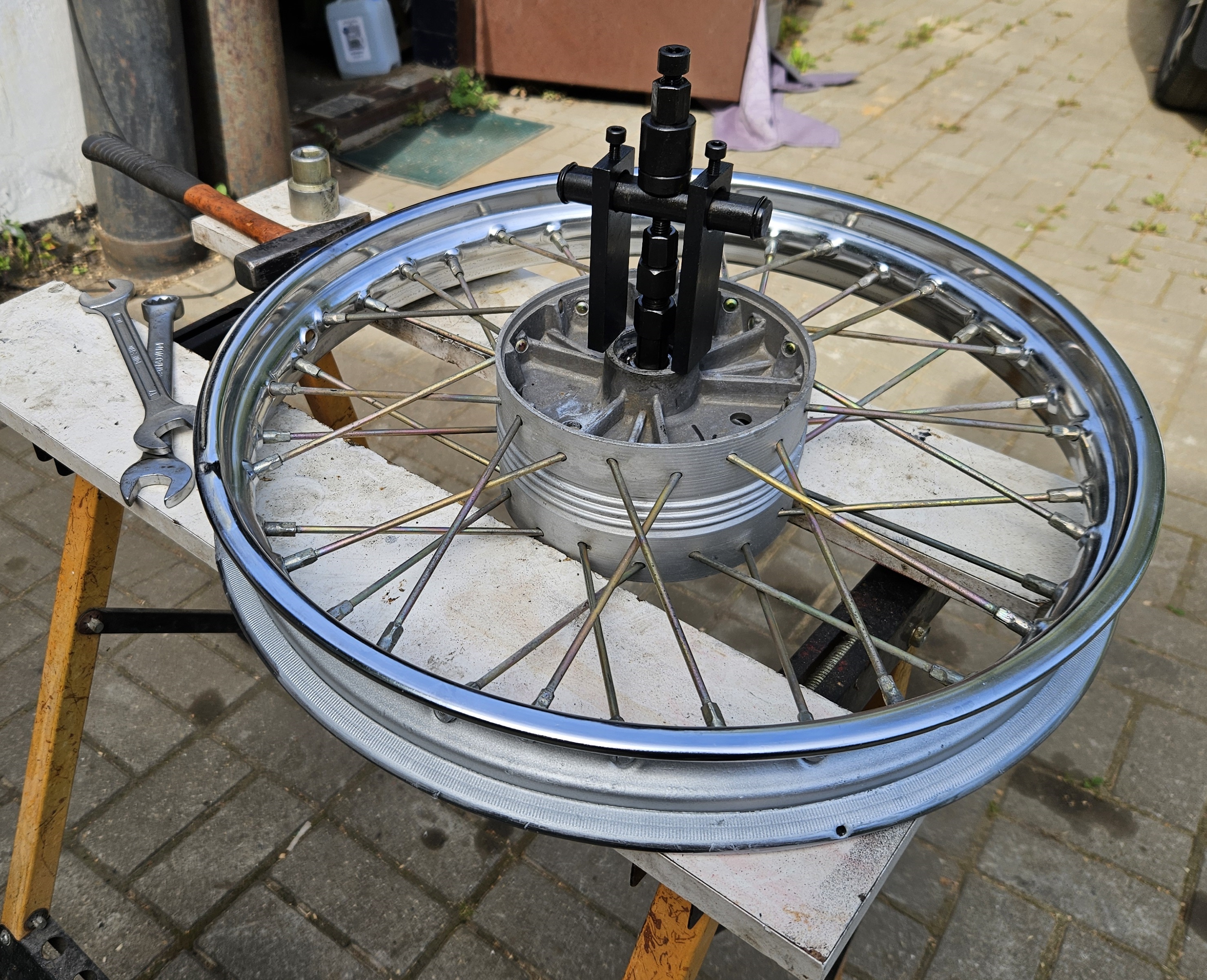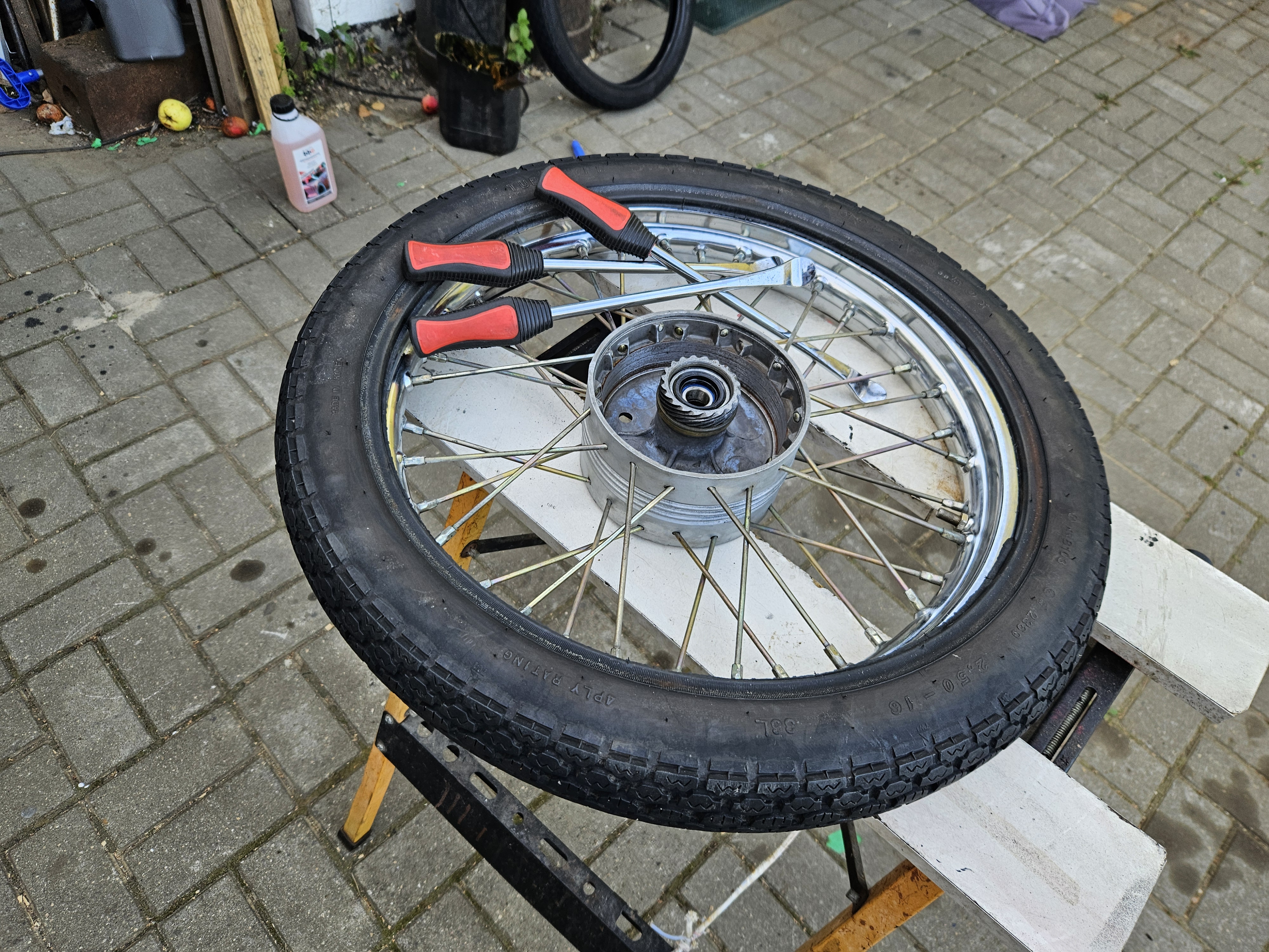 При помощи кувалды, бумажного скотча и алюминиевых подкладочек, довольно быстро отстучал вновь купленное переднее колесо. Освежил спицы где было нужно и получил вполне себе нарядное и ровное колесико на перед.