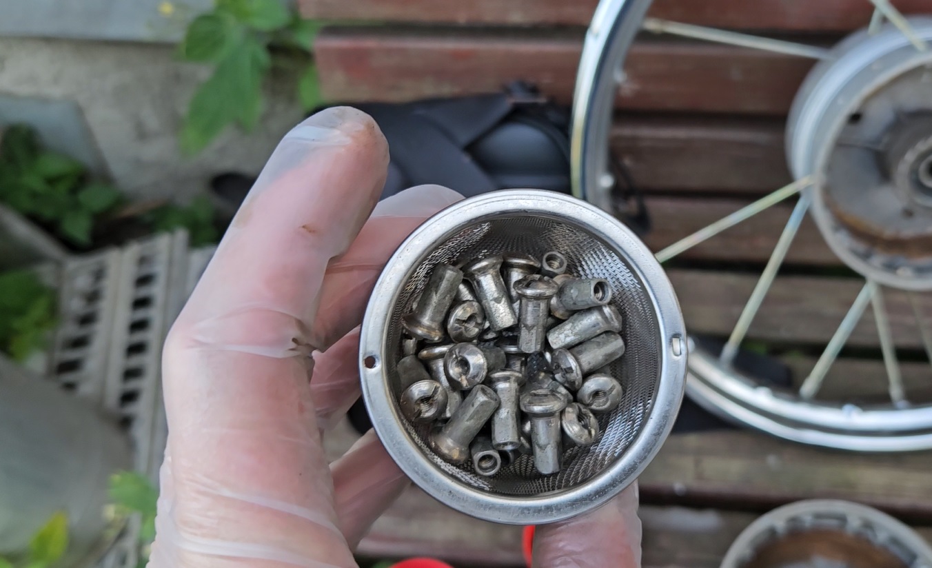 С спицами проблем не возникло, из 4х колес насобирал 2 комплекта с хорошим цинком, один комплект хороших ниппелечков, а на второе колесо взял от Явы.