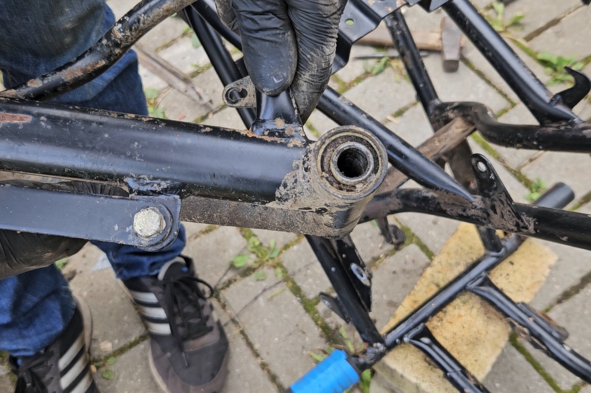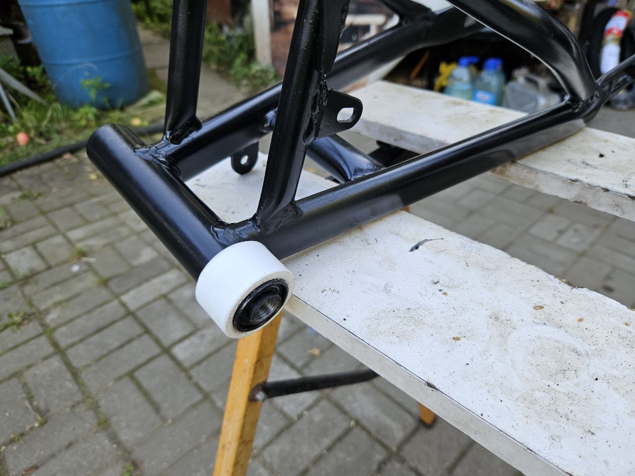 Новые сайлентблоки запрессовал абсолютно без проблем. Все размеры подошли. На левую трубу маятника сделал втулку из полипропиленовой трубы, для защиты маятника от цепи.
