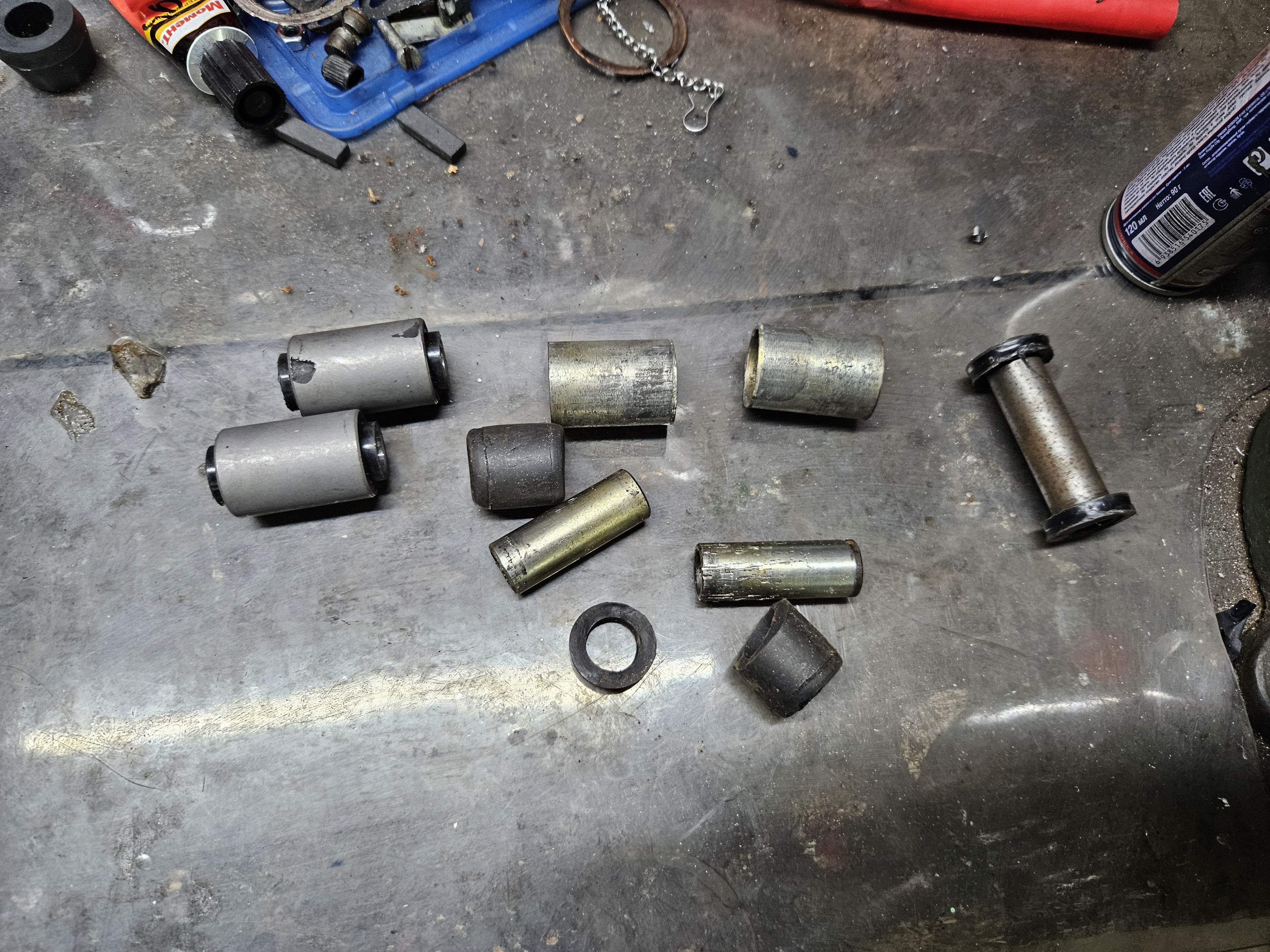 Выпресовка сайлентблоков по частям крайне творческое занятие, но я справился. Труднее всего было выбивать внешнюю обойму. Замена сейчас имеется в продаже, конструкция немного иная, но качество на первый взгляд мне понравилось.