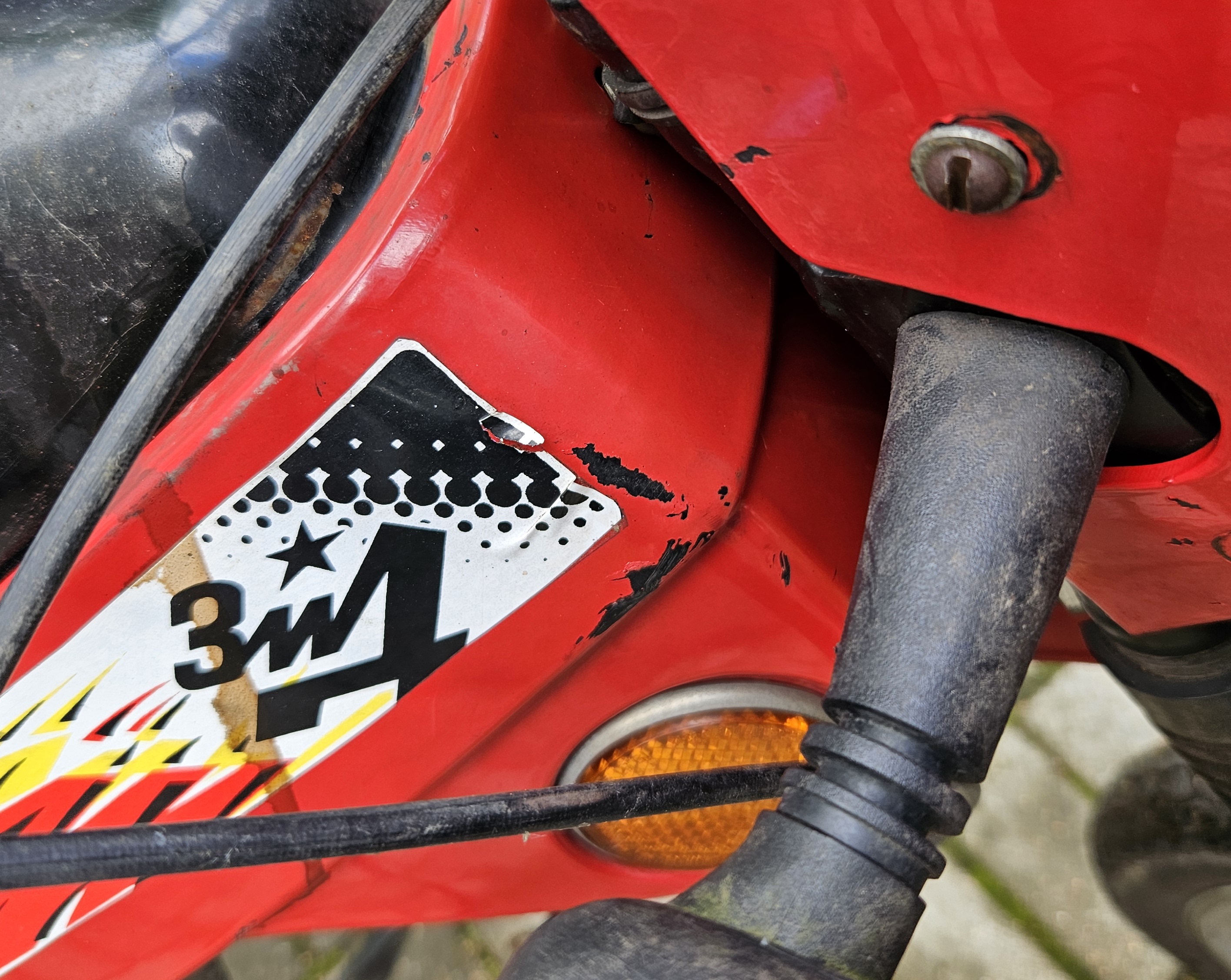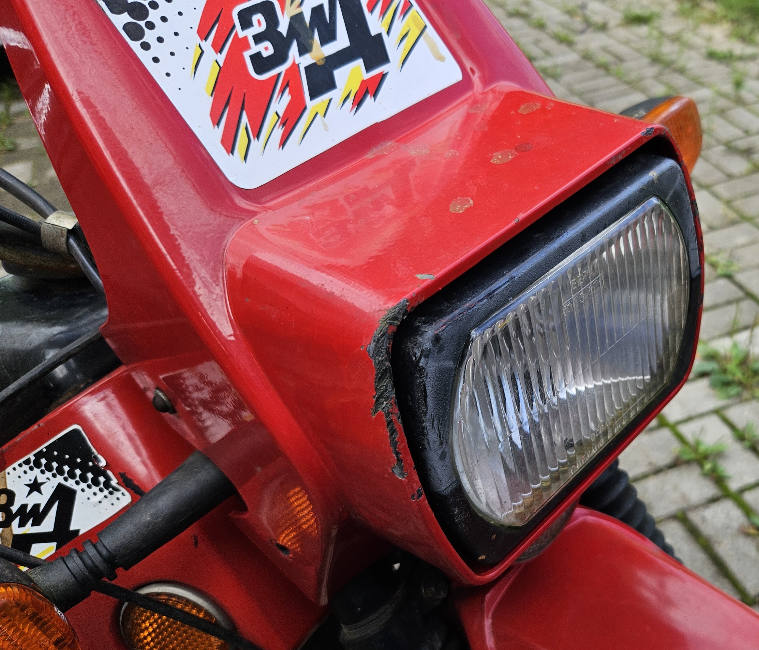 Так же, видимо из-за простоя опертым на стену частного дома, на некоторых деталях и облицовке мопеда были подтеки краски по дереву, типа морилки Пинотекса или чего-то подобного, а эту штуку фиг чем ототрешь.