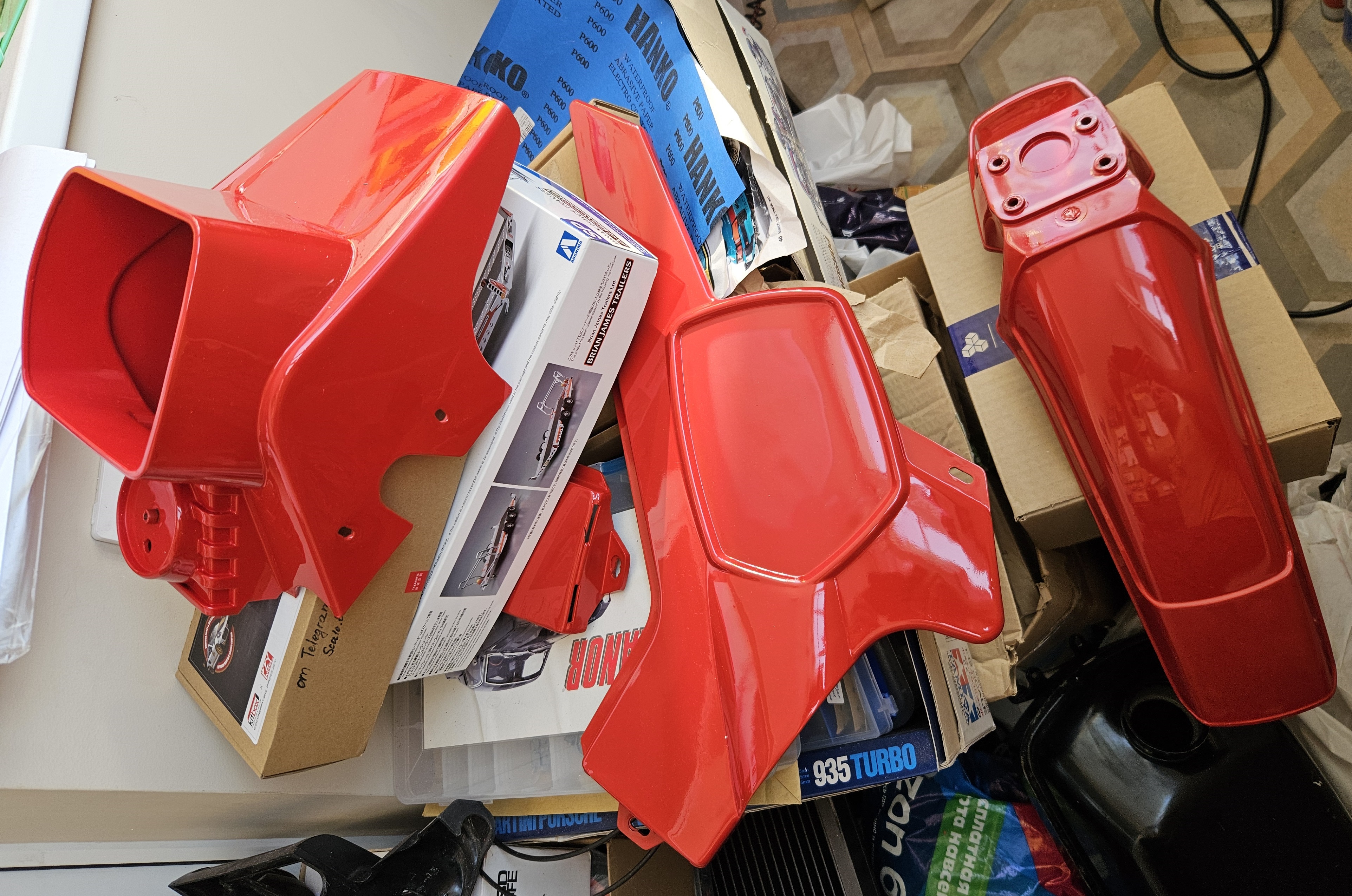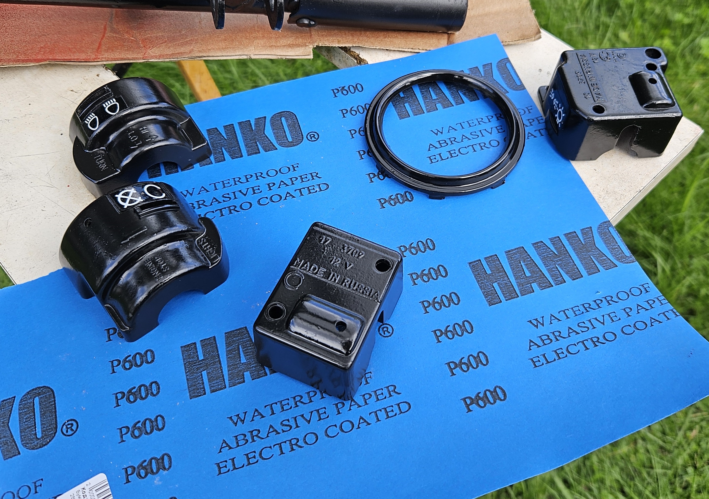 Красил все это на балконе, благо методика отработана на Риге 22, но в целом это извращение:) Крашу аэрографом, а затем полирую. Для небольших деталей допустимо, а с большими конечно ничего не получится. Да, на балконе есть покрасочный бокс настольный с вытяжкой, если что. Занимаюсь моделизмом, этого достаточно для небольших моделек в масштабе 1/24 , 1/12. Покраска мопедных деталек это своего рода домашняя работа в будни, после работы, т.к. в гараже нет возможности работать, а дело потихоньку движется.