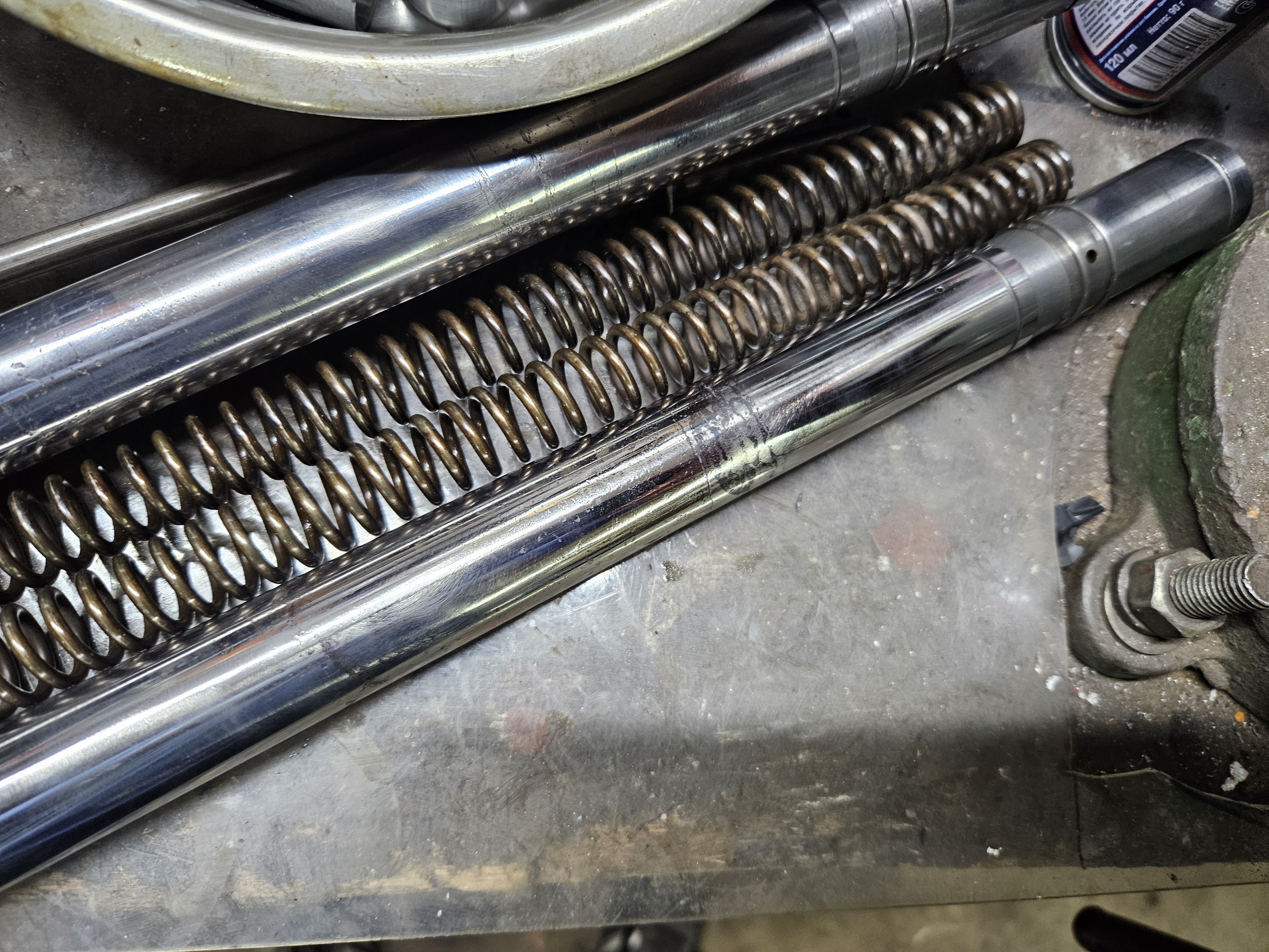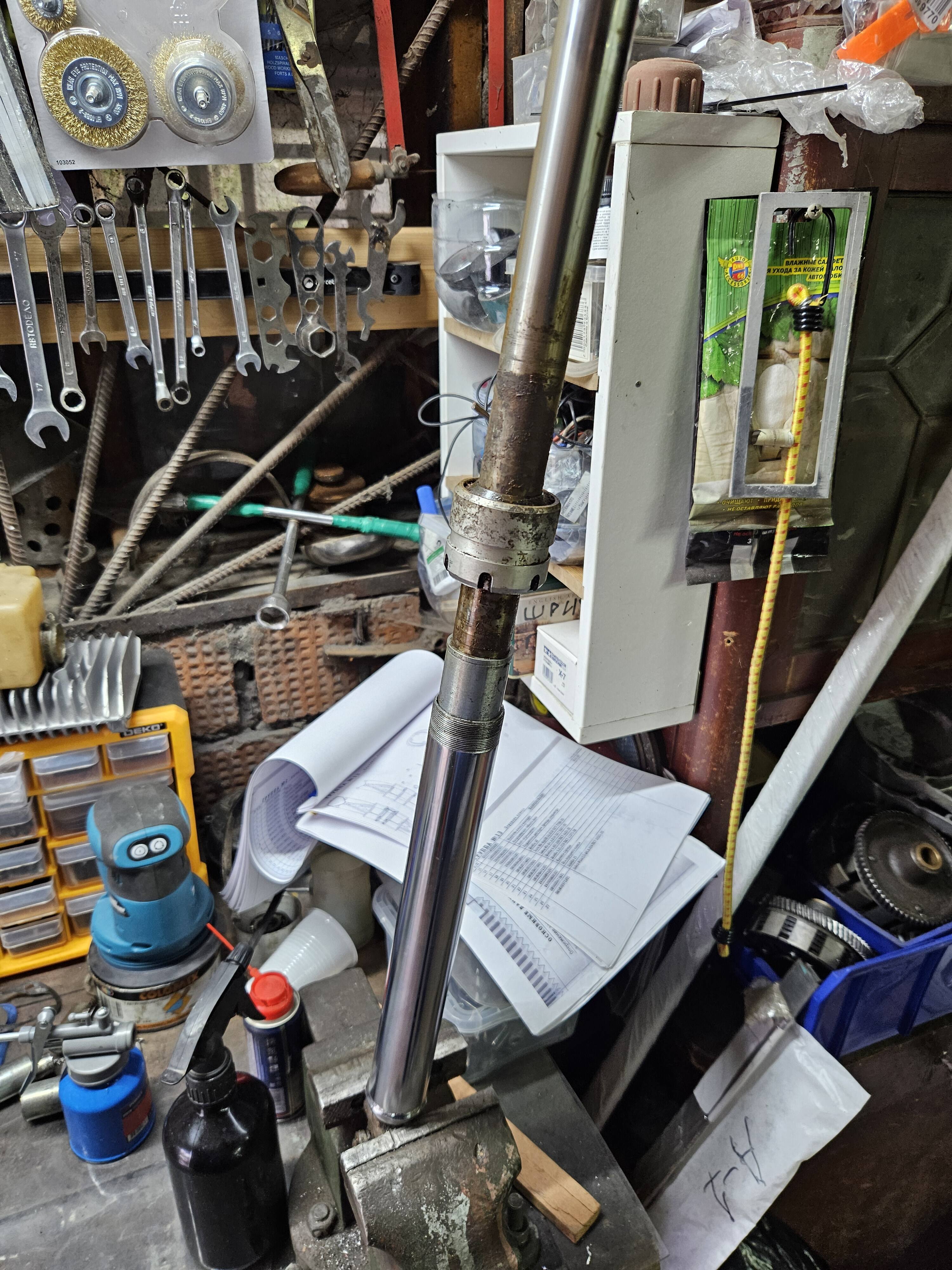 Перешел к передней вилке. Это самая печальная деталь на мопеде, я так понял частая проблема. Из-за простоя под открытым небом, в гофру набралась вода, что привело к тотальной ржавчине труб перьев.