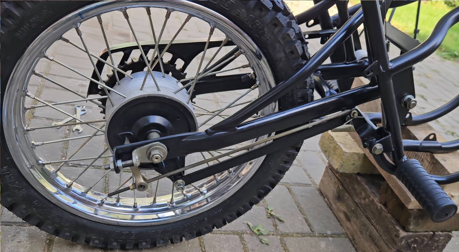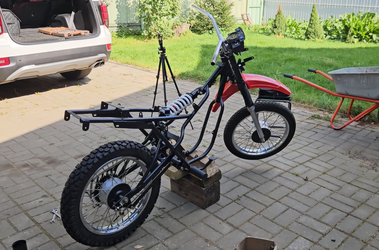 Задний амортизатор временно, чтобы поставить мопед на колеса, был установлен китайский, но очевидно он очень жесткий.
