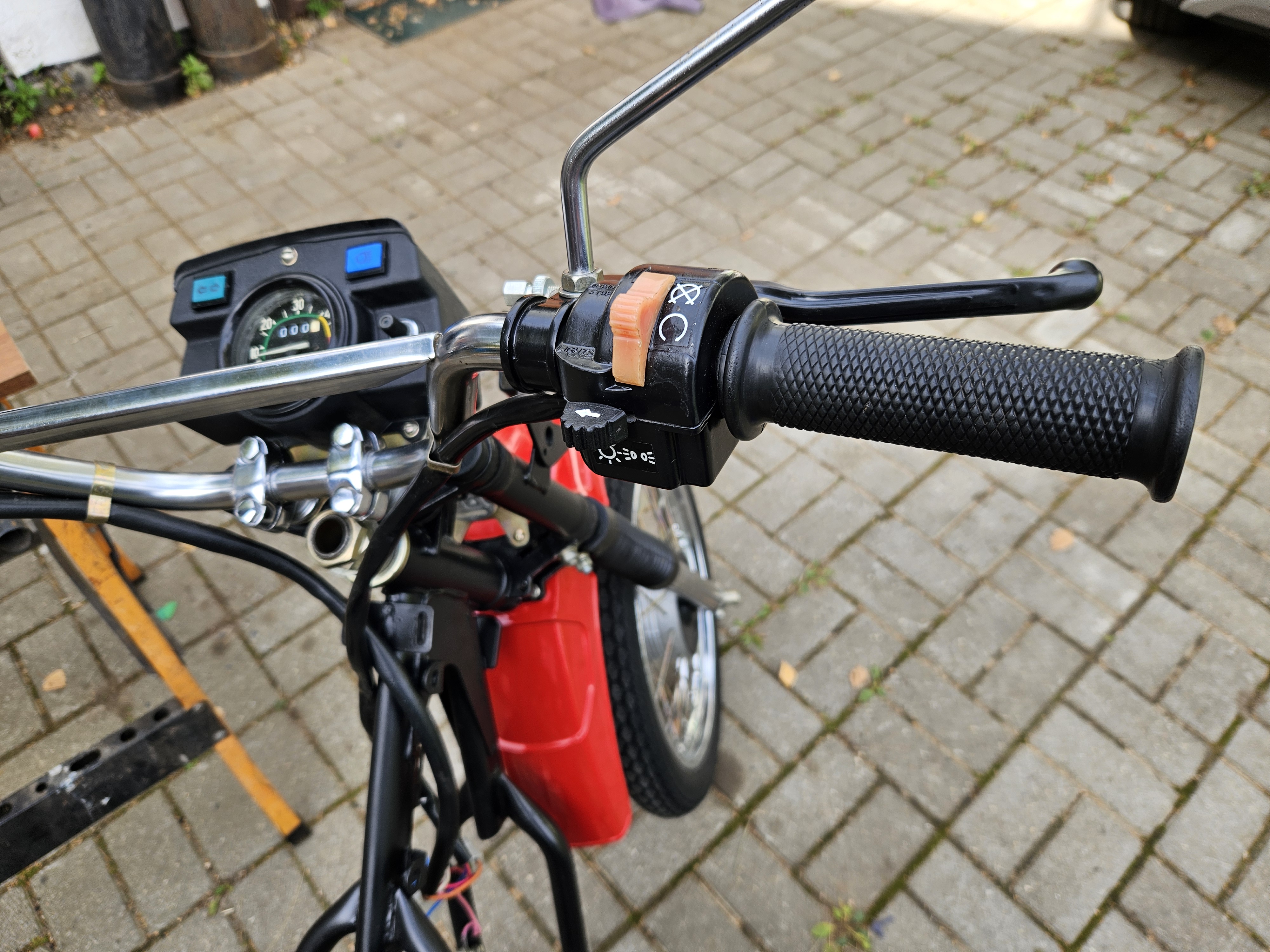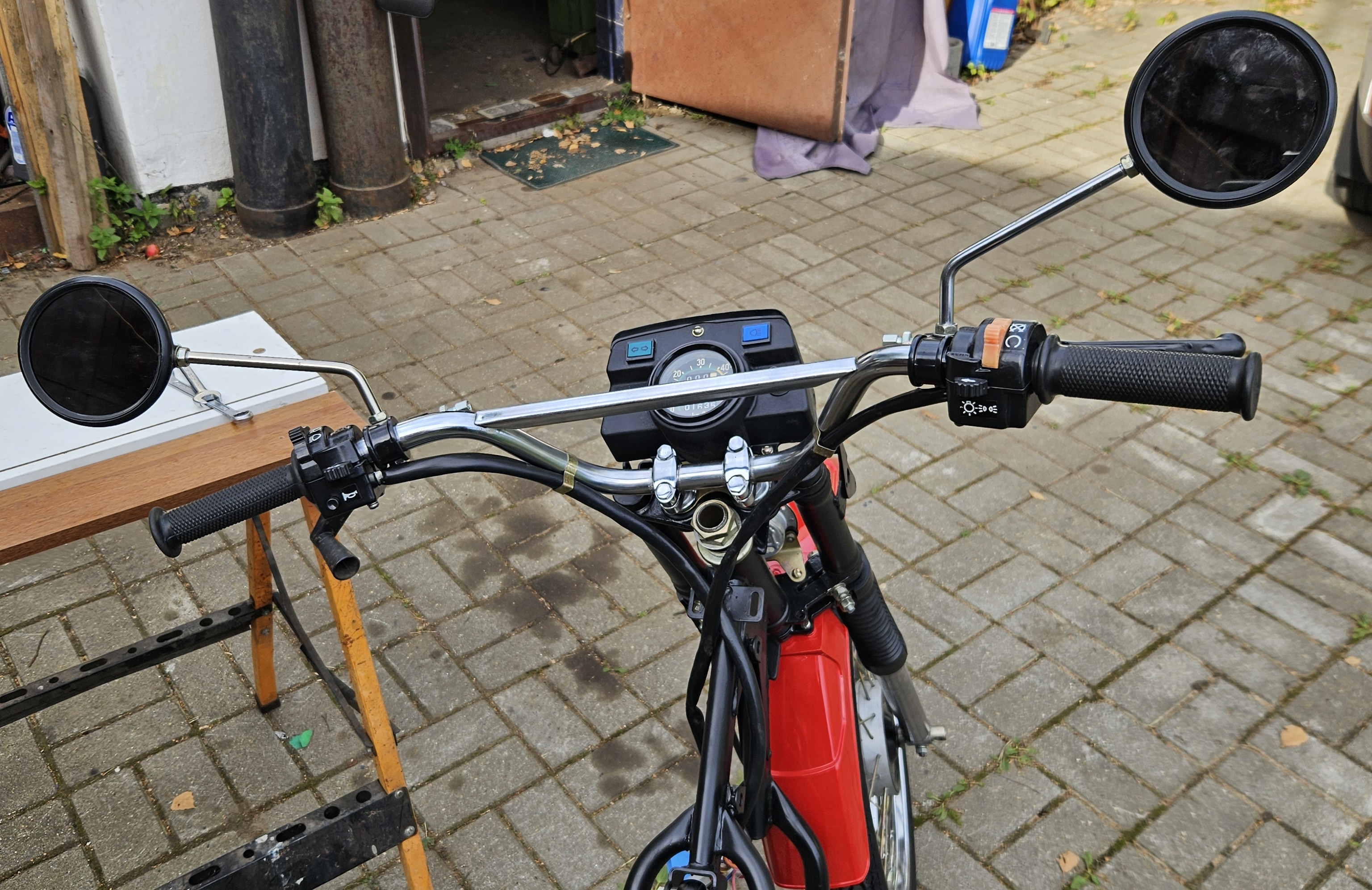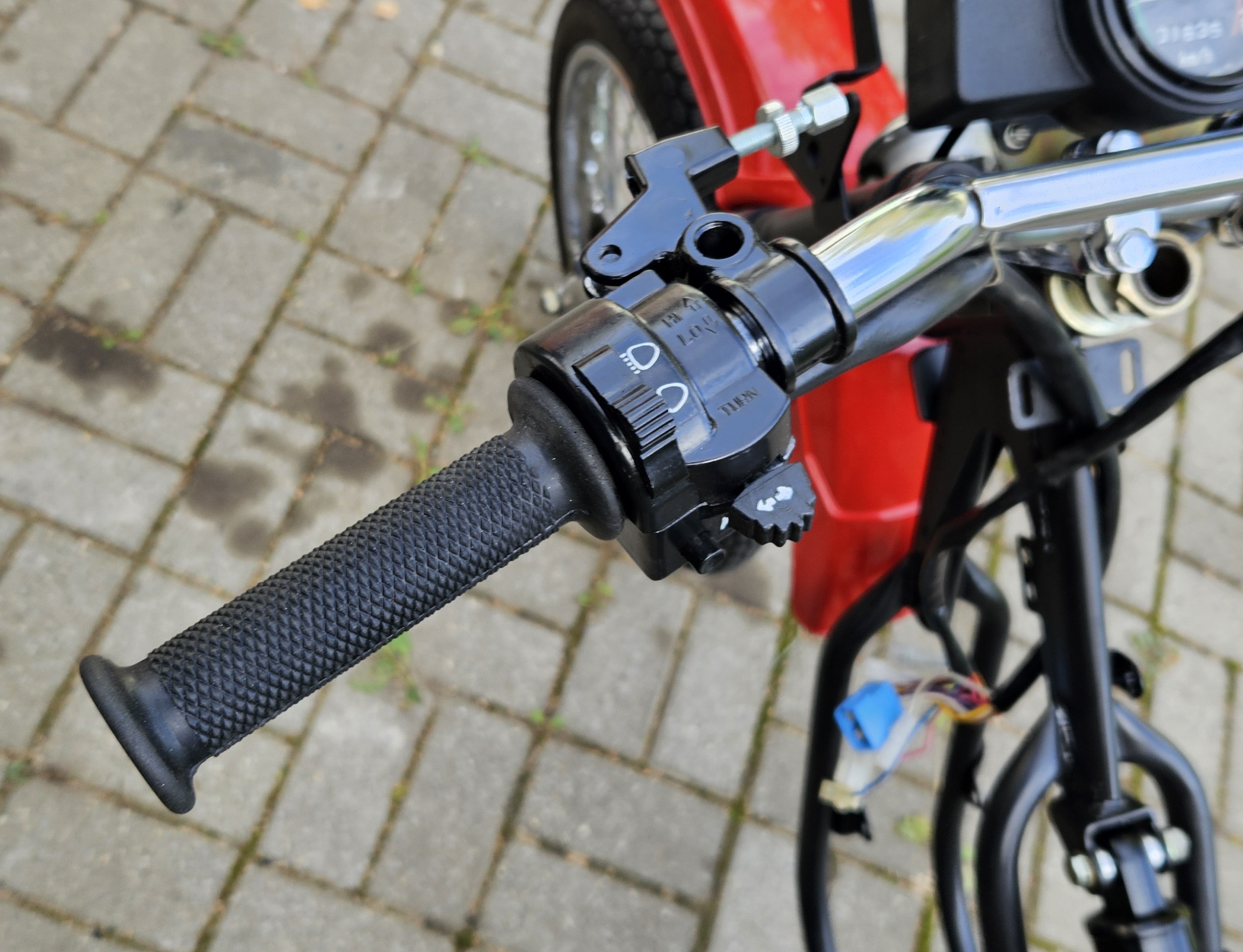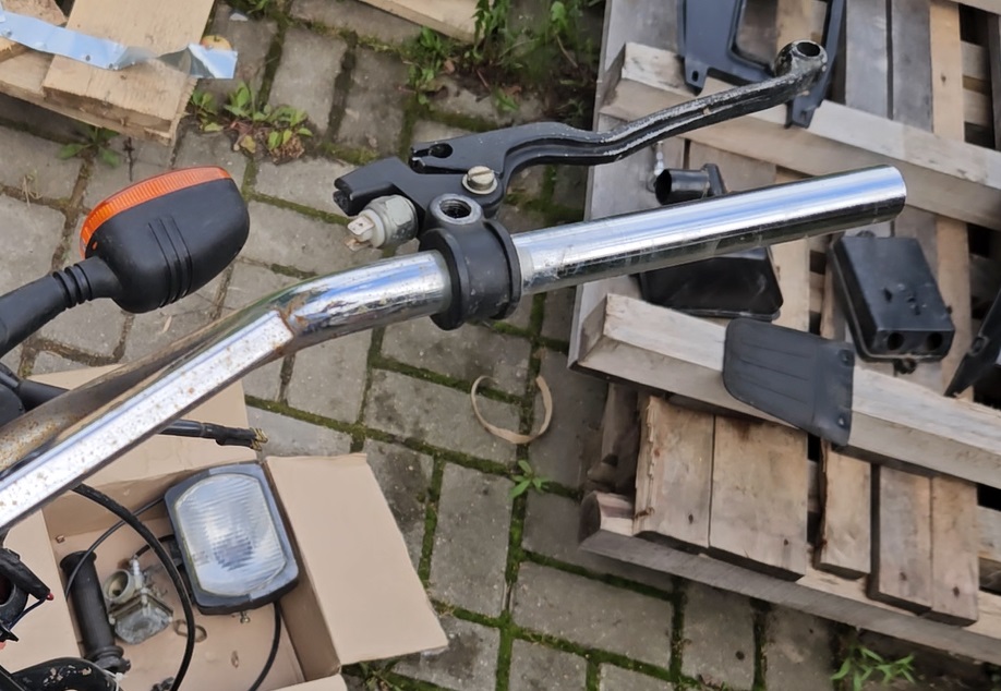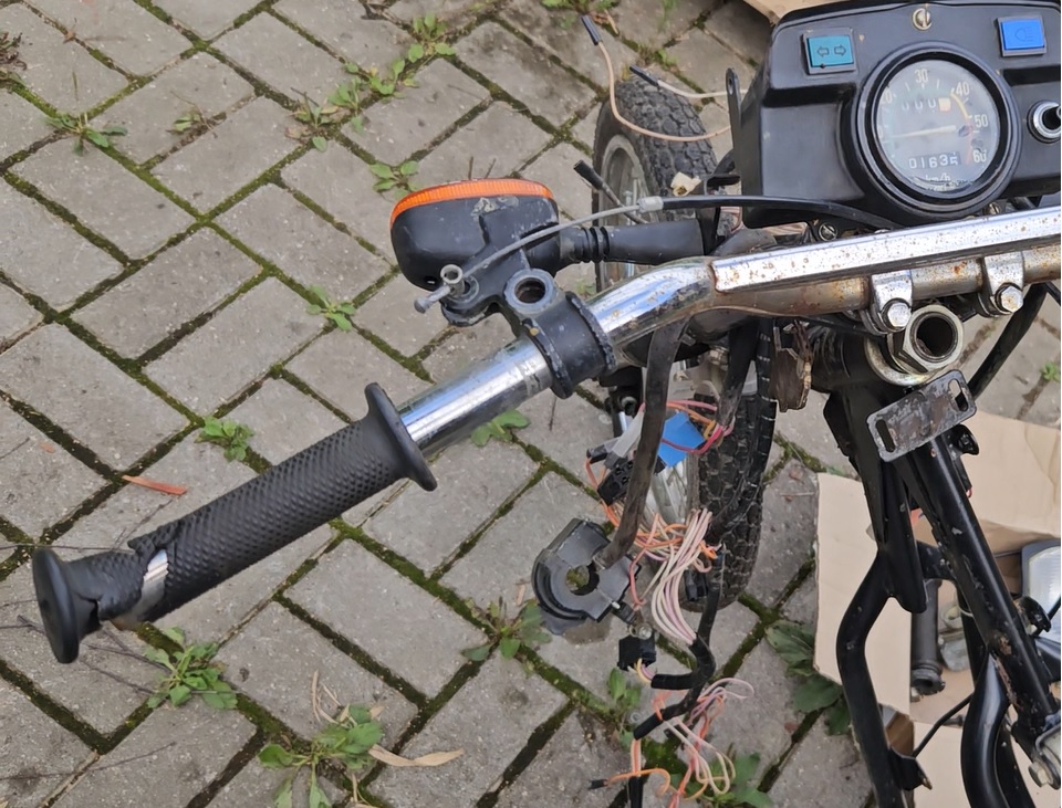 Напомню состояние при покупке мопеда. Грипсы сгнили и развалились, левого рычага не было, правый оказался левым, сами кронштейны крепились стойками от китайских зеркал, но без самих зеркал, даже не буду показывать, выбросил. Пульты оказались в хорошем состоянии с минимальными сколами краски, ну и конечно выцветший красный переключатель.