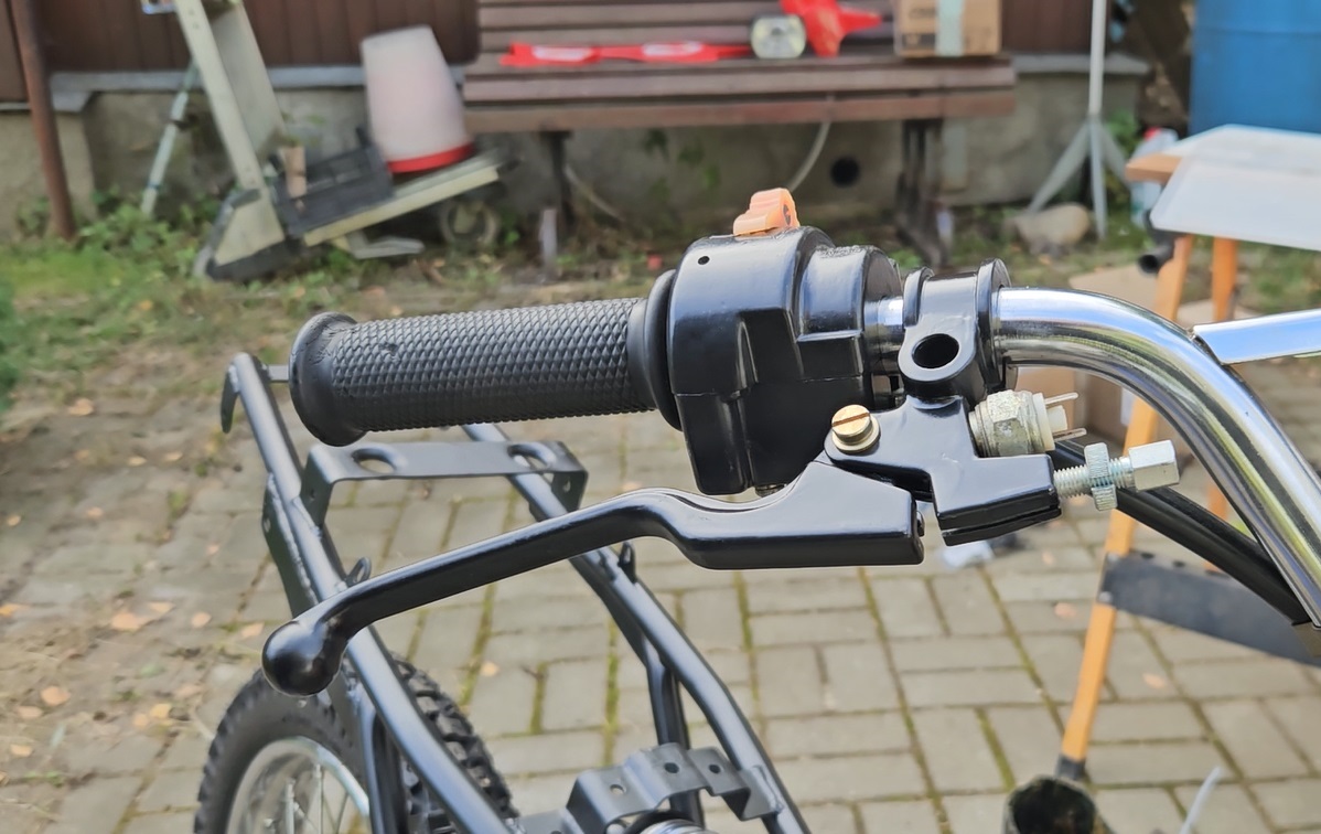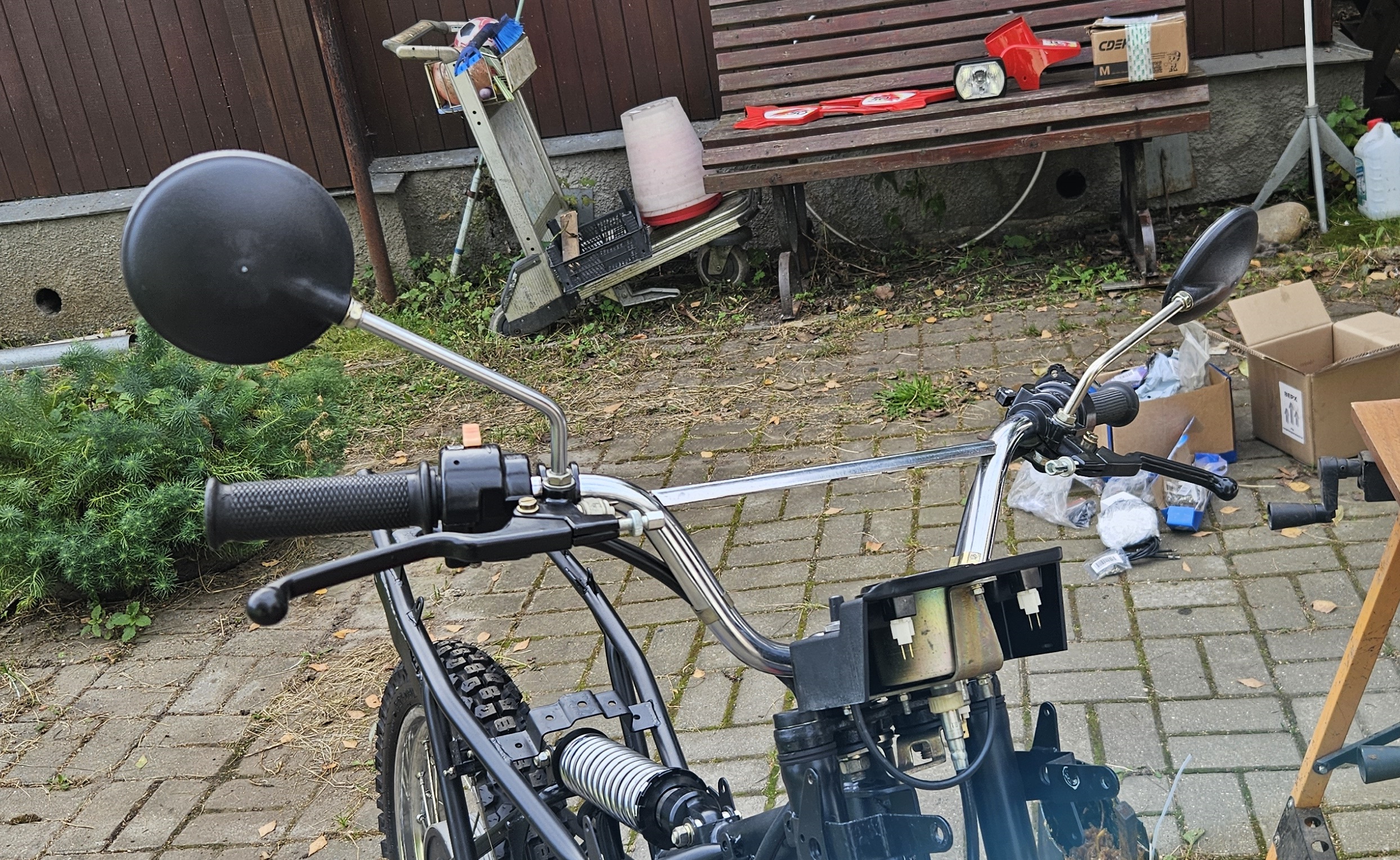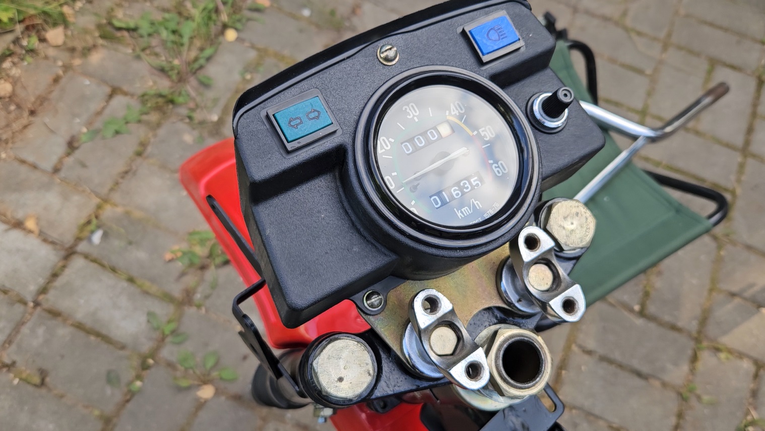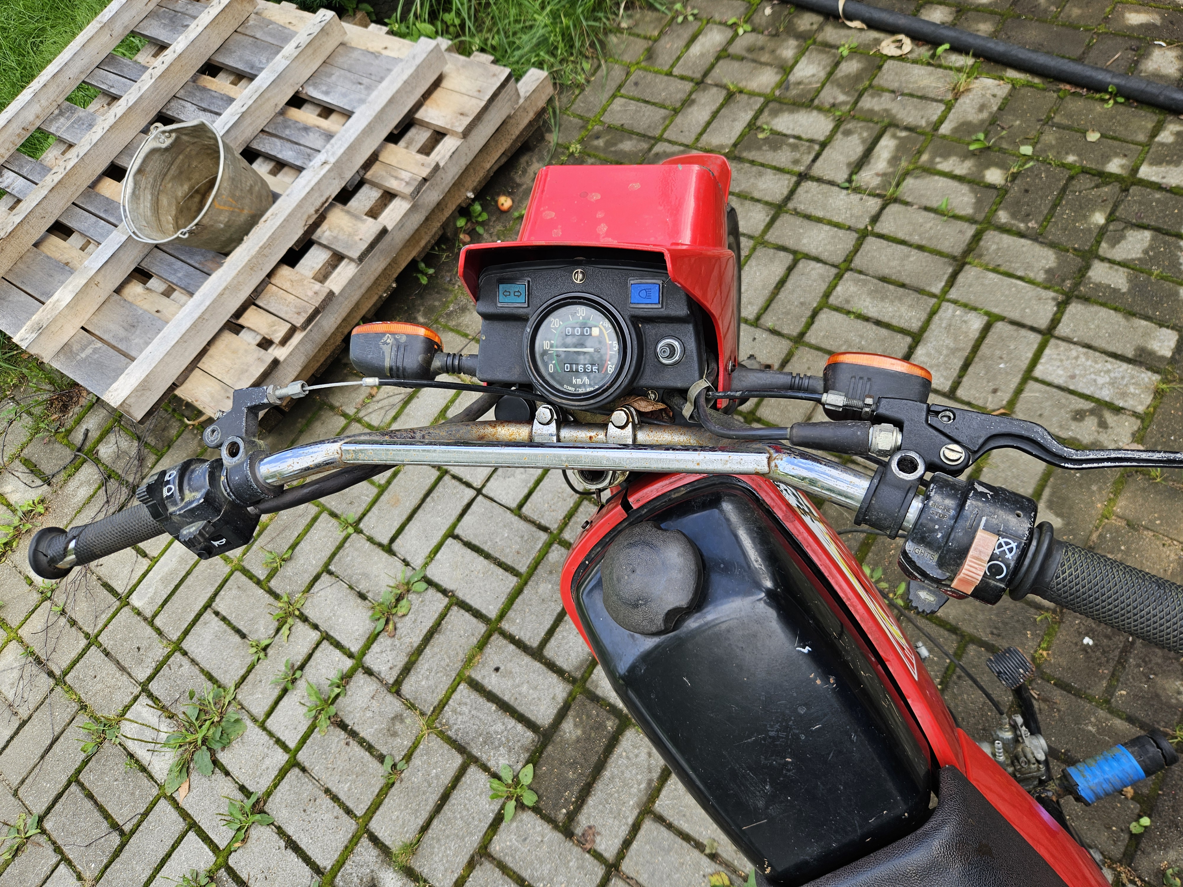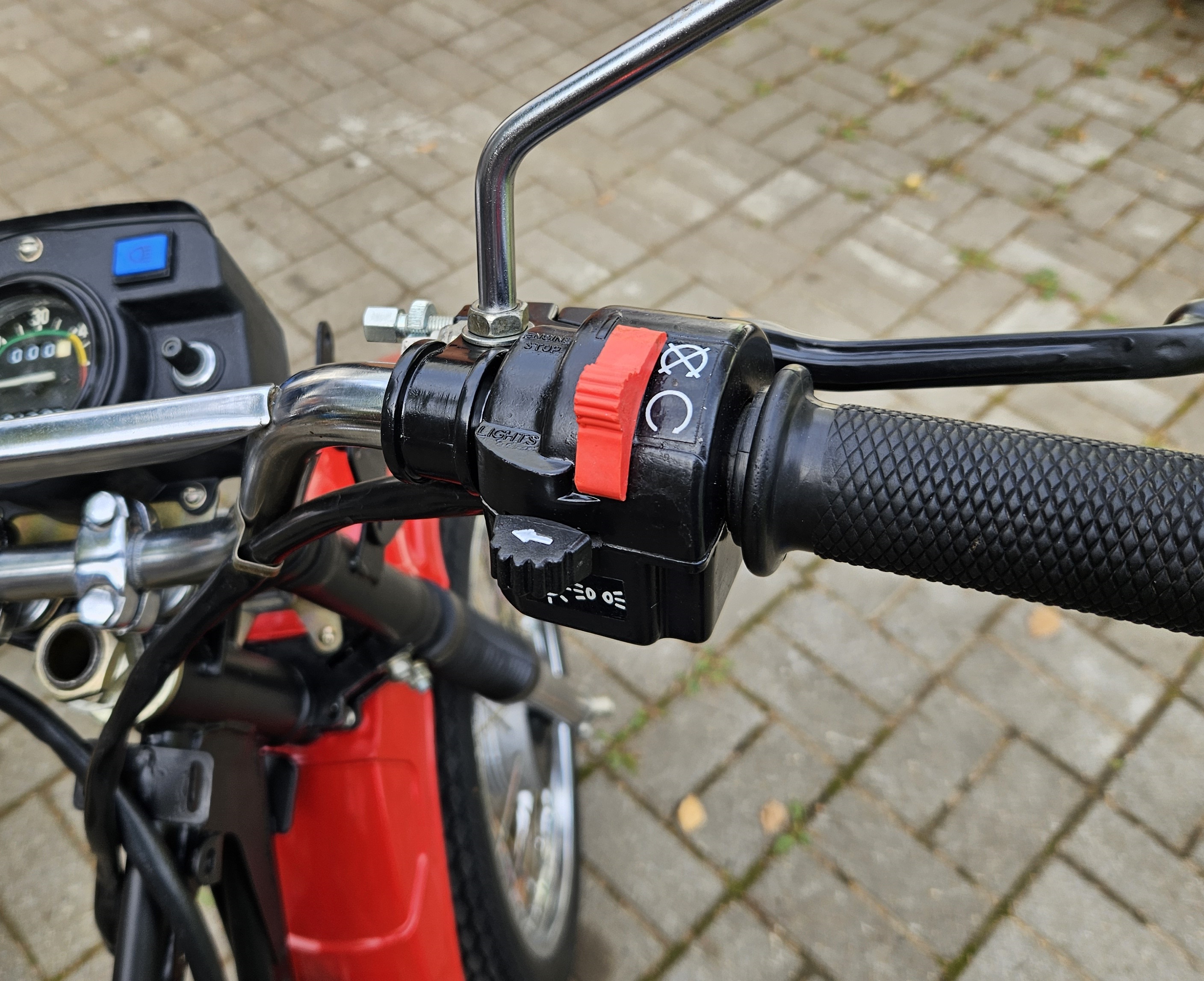 Напомню состояние при покупке мопеда. Грипсы сгнили и развалились, левого рычага не было, правый оказался левым, сами кронштейны крепились стойками от китайских зеркал, но без самих зеркал, даже не буду показывать, выбросил. Пульты оказались в хорошем состоянии с минимальными сколами краски, ну и конечно выцветший красный переключатель.