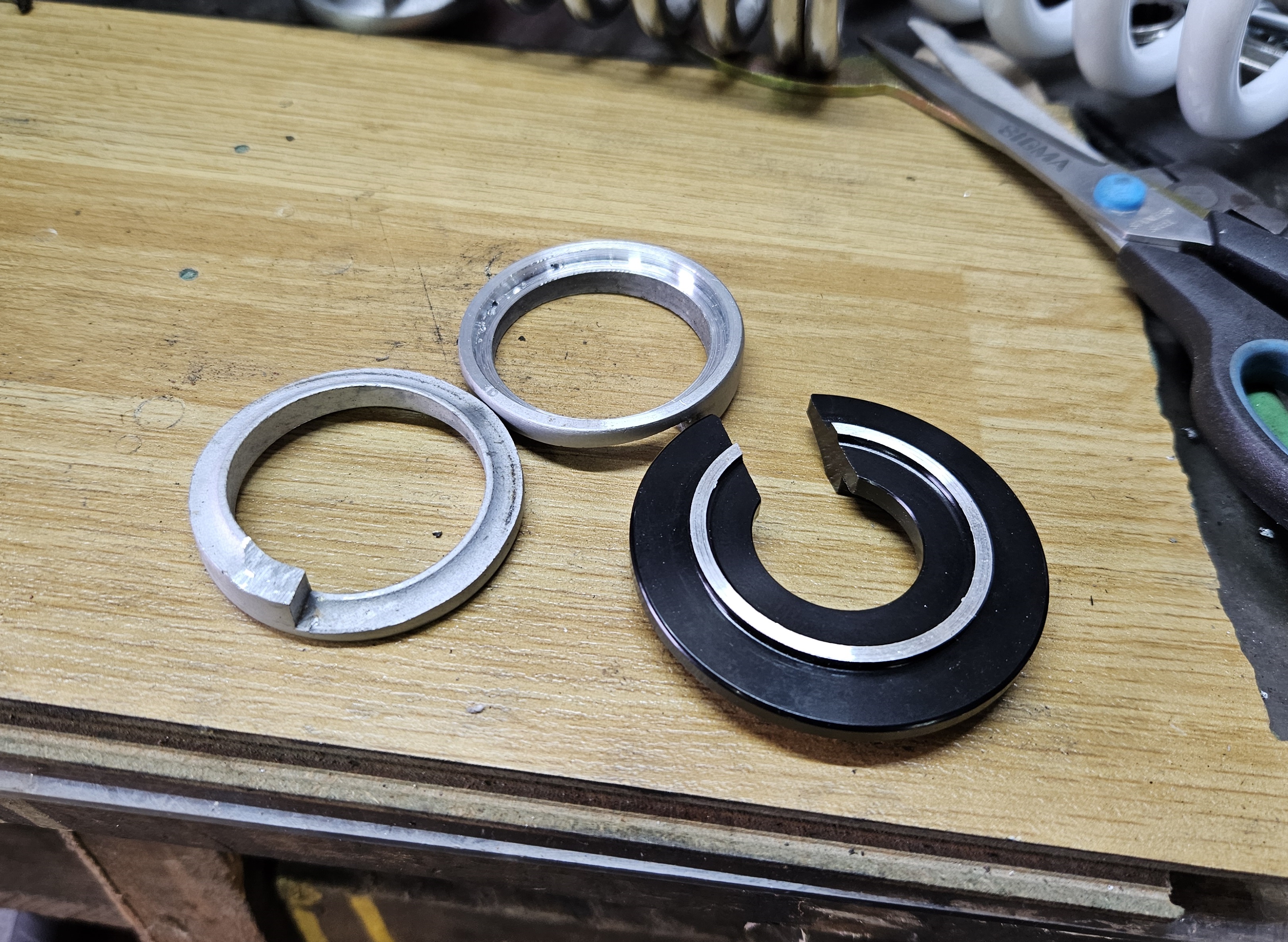 Для установки на мопед, выточили из алюминия 4 проставочные шайбы, т.к. посадочные на раме сильно шире чем места крепления амортизатора.