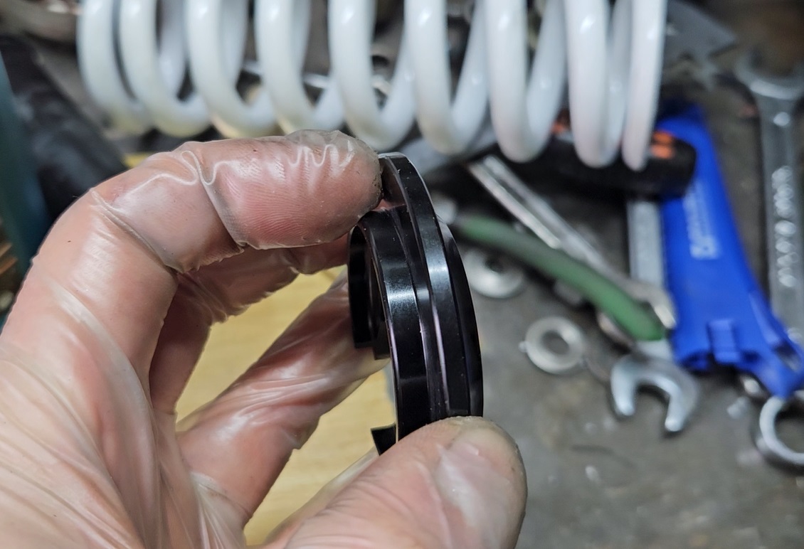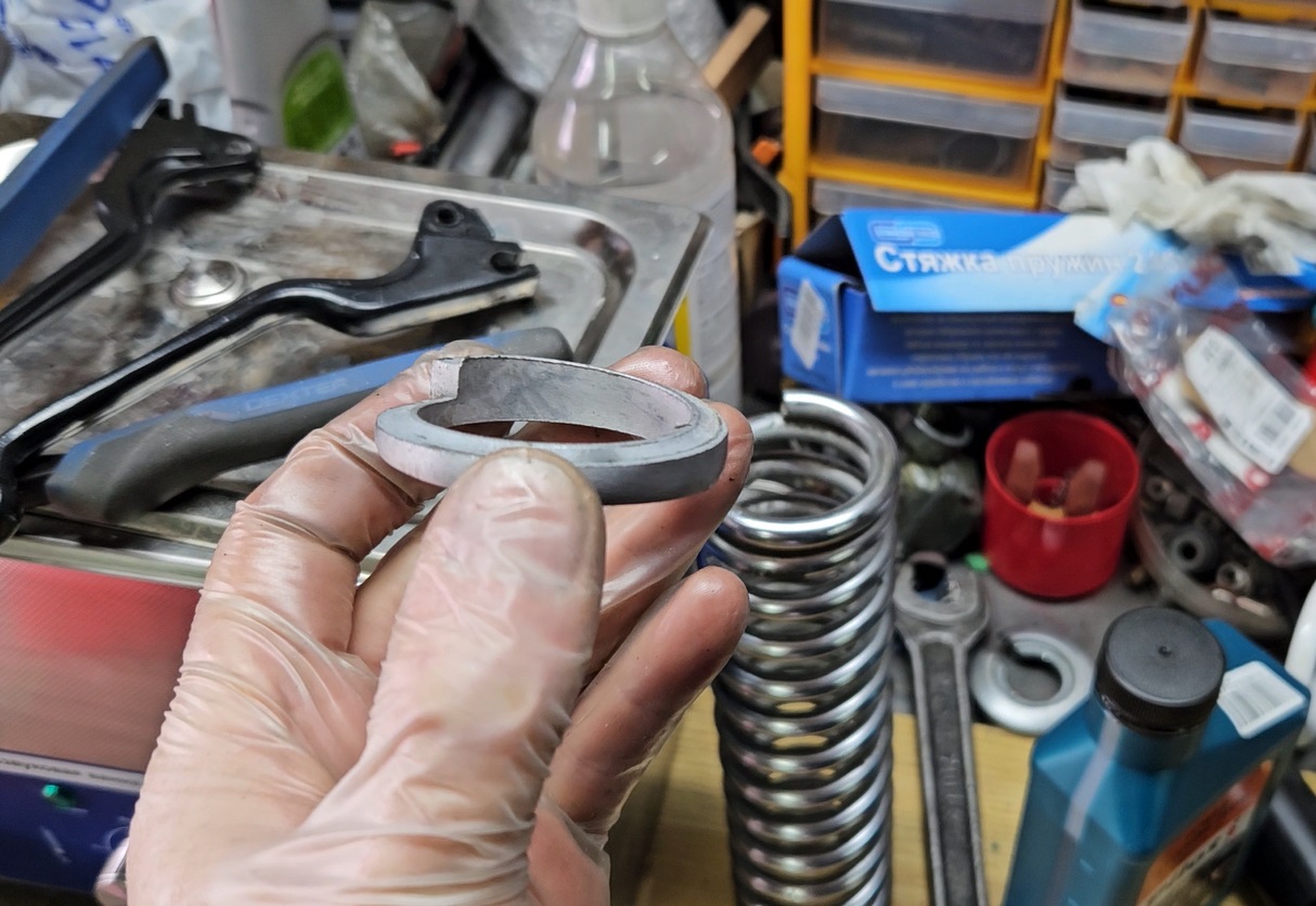 На оригинальной пружине крайние витки не сошлифованы в плоскость, а используются косые шайбы из силумина. На китайской пружине такой проблемы нет, она ставится без шайб сразу на плоскость гайки преднатяга и верхний стопор.
