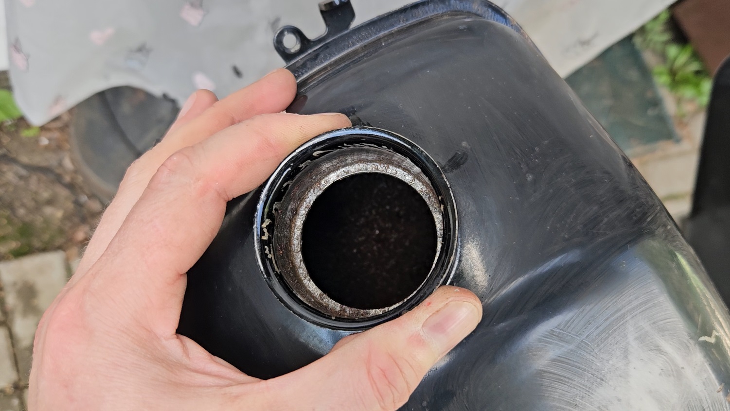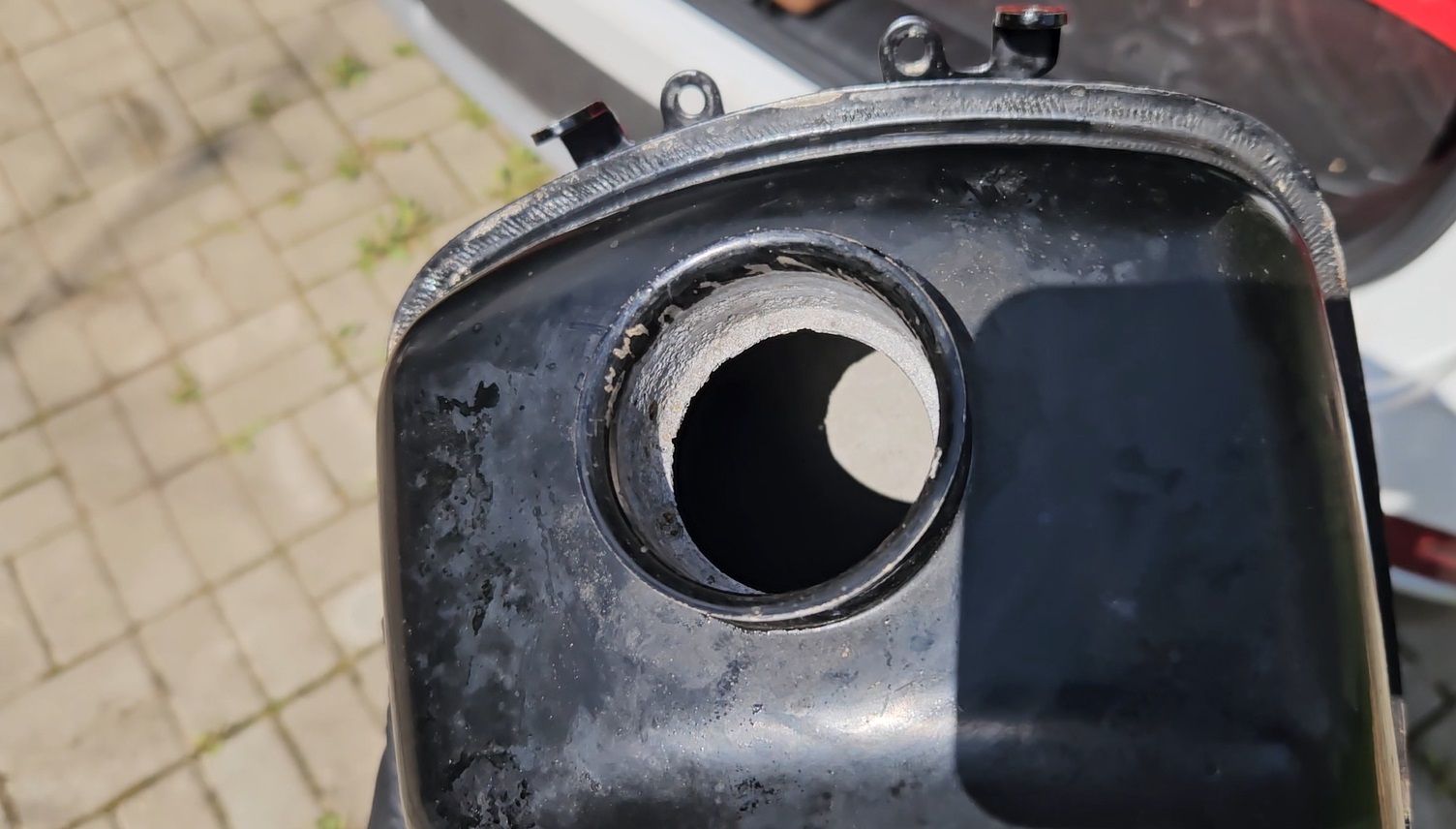 Последствия простоя под открытым небом не прошли без последствий. Сняв крышку с бензобака - обалдел и расстроился. Внутри был толстый слой хлопьев ржавчины. Заливная горловина также изрядно пострадала, но ее почистил щеткой в первую очередь.