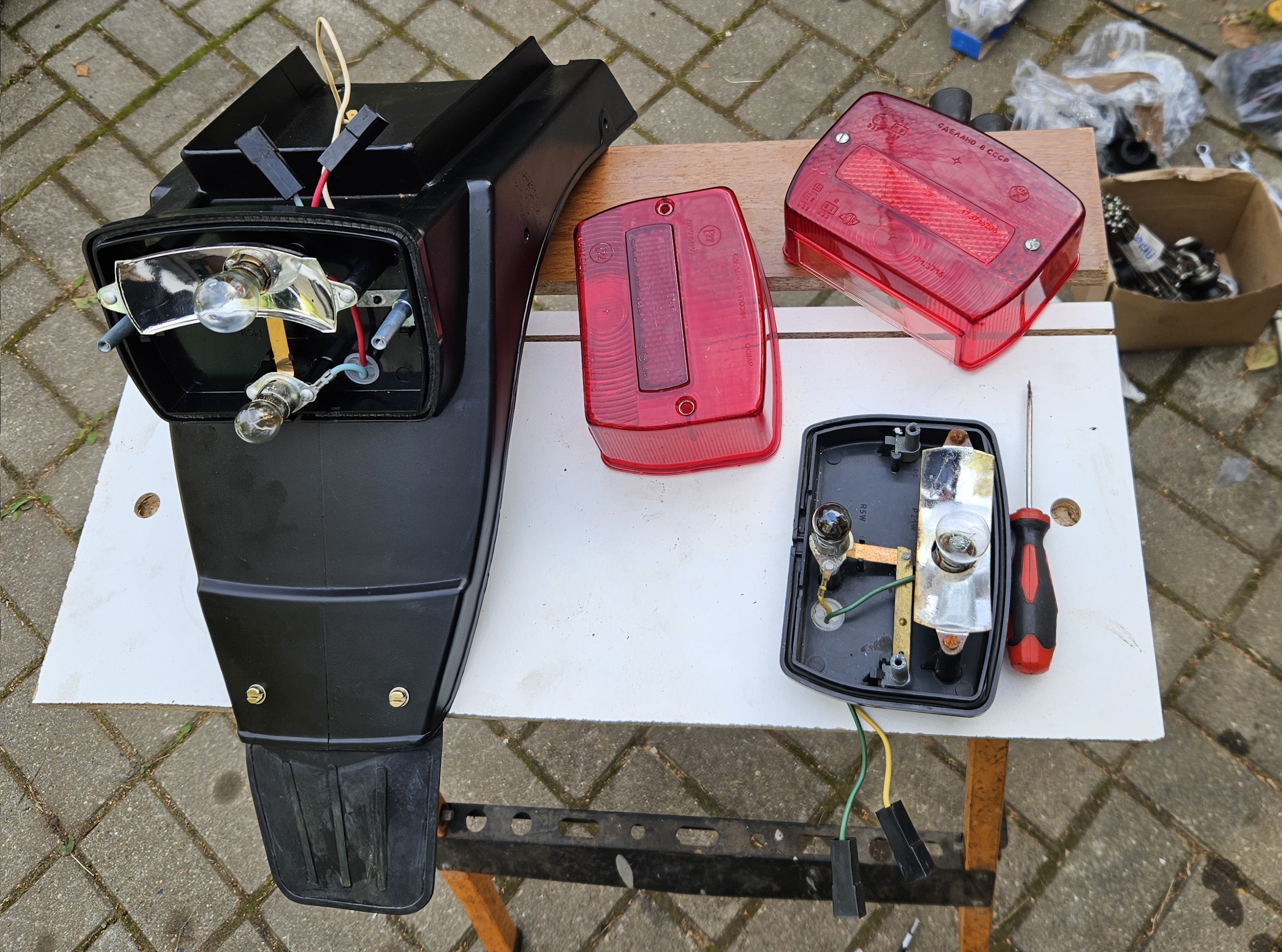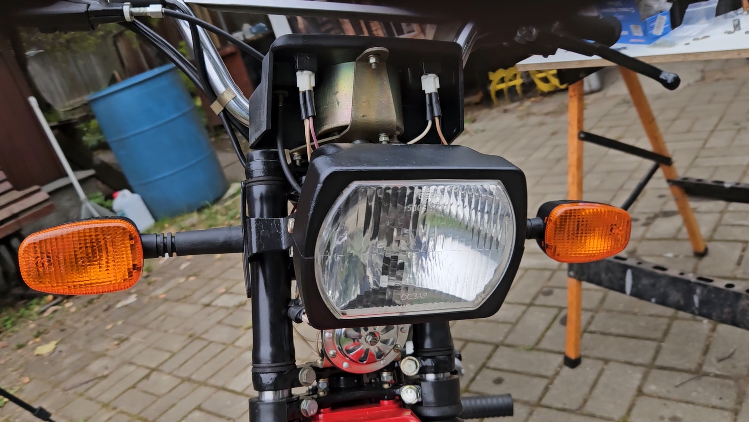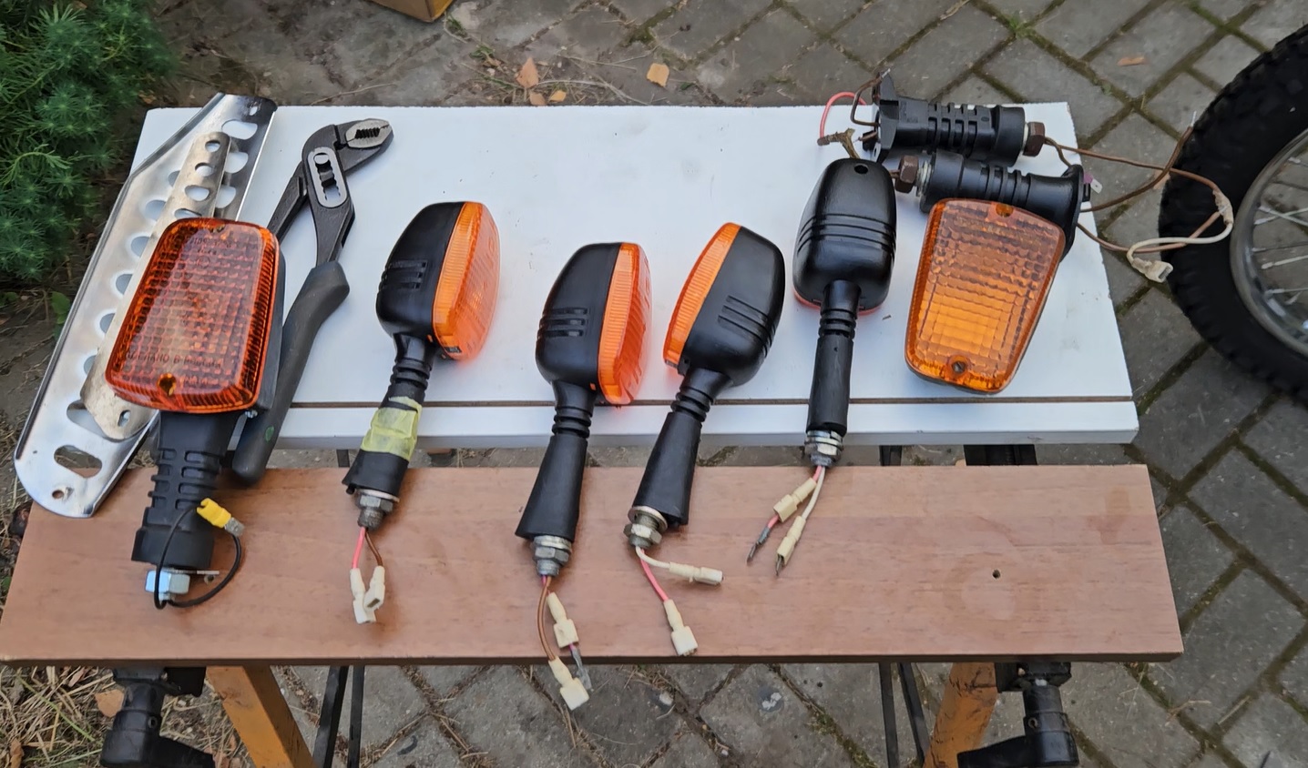Интересная эпопея с поворотниками. Мопед достался с разными поворотниками спереди и сзади. Спереди стояли редкие капельки, причем один с сломанной ножкой, а сзади прямоугольные. Для простоты изначально думал ставить все квадратные, благо продаются за копейки, но что-то меня заставило не идти простой дорогой и я начал искать где докупить еще комплект капелек. Ценники конешно штормят из крайности в крайность. Прошаренные спекулянты просят 2500-3000 за пару условно хороших, с следами эксплуатации на пластике, но вполне можно и за 150р штука приобрести, как повезет. В итоге накопил у себя наверно 3 или 4 комплекта разной степени ушатанности. Одну пару отобрал на перед. А вот с задними есть нюанс, оказывается они бывают с короткими ножками и у меня есть одна такая. А вот где брать вторую, пока не понятно, думаю буду что-то самоделить, но позже.