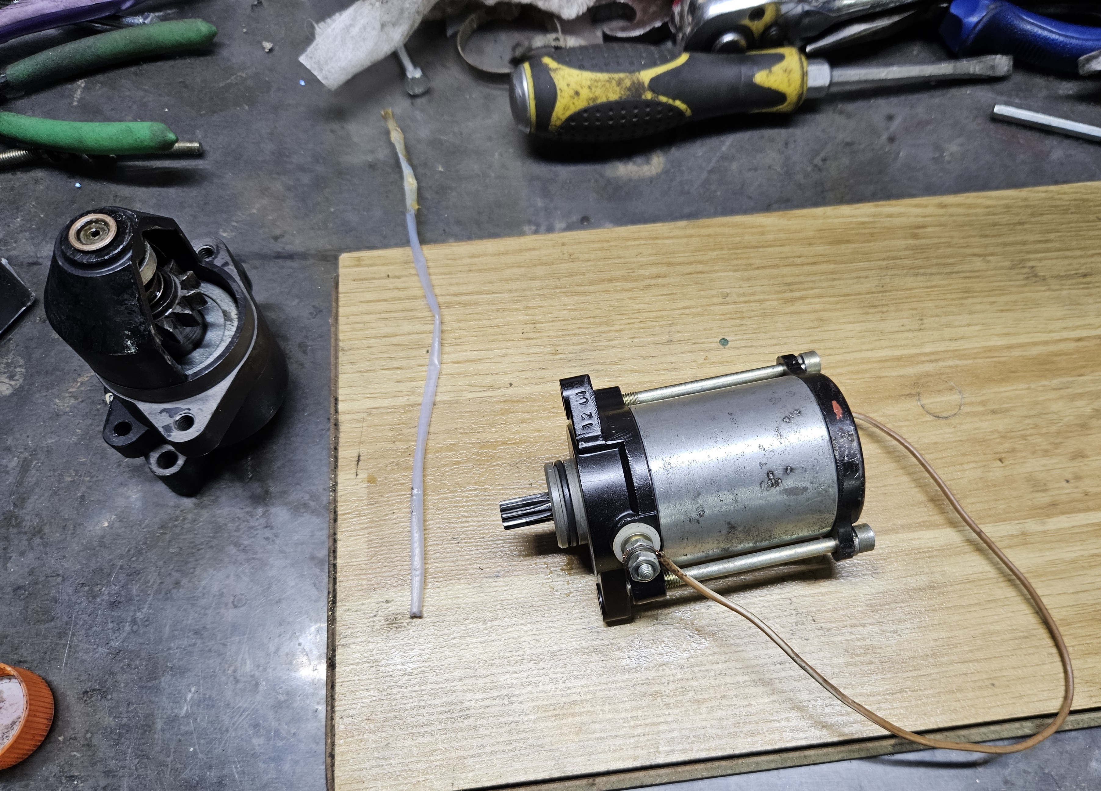 Но как вариант, сам моторчик возможно подойдет от такой Yamaha JOG 90 2т, Stels, 1E40QMB, https://www.ozon.ru/product/starter-yamaha-jog-90-2t-stels-1e40qmb-1666943696/ , но это не точно. Цилиндрическая часть похоже меньше на 1 мм, и по картинке не пойму по крепежным отверстиям, они должны быть смещены относительно вала, т.е. быть не на одной оси с ним.