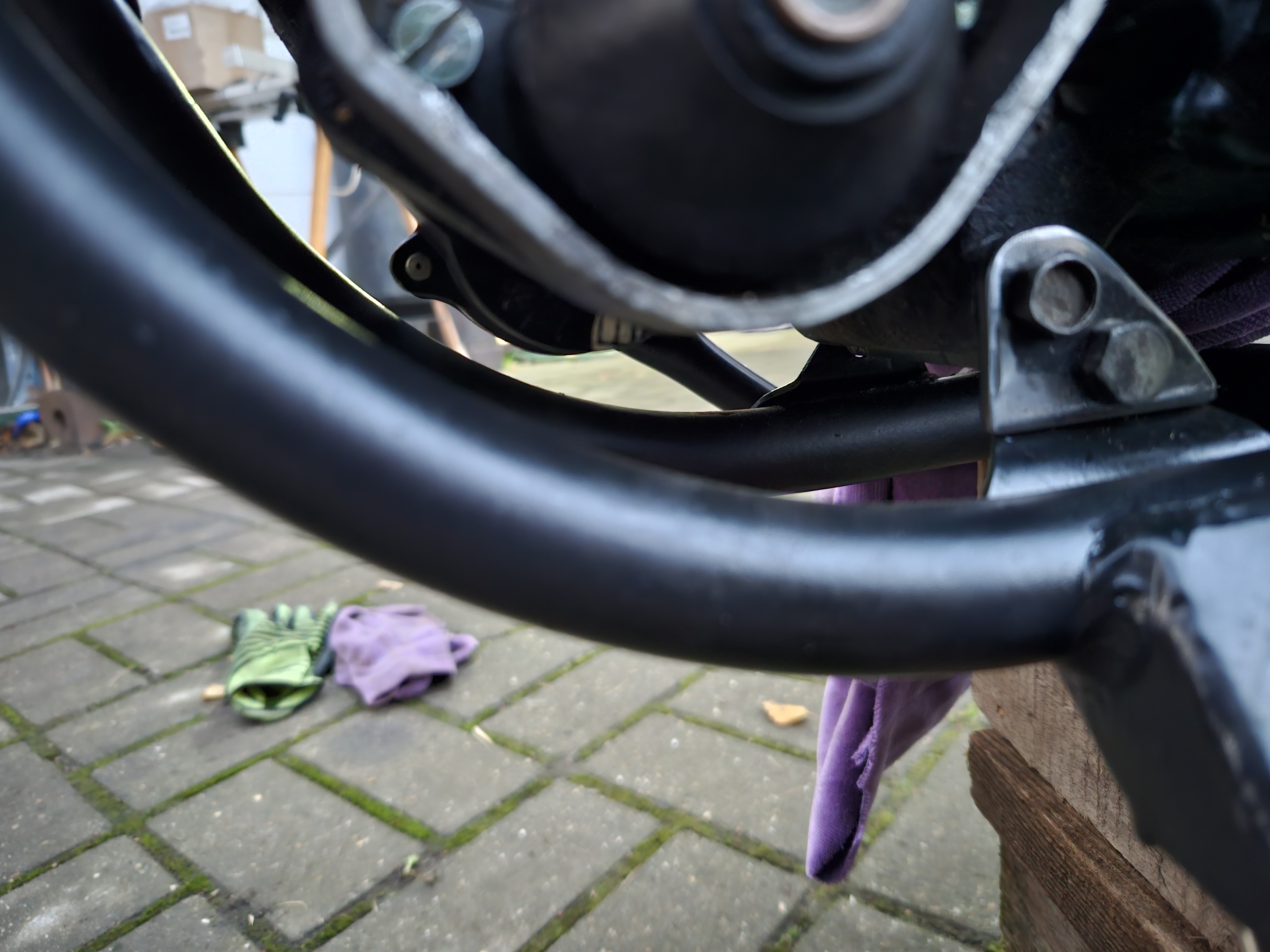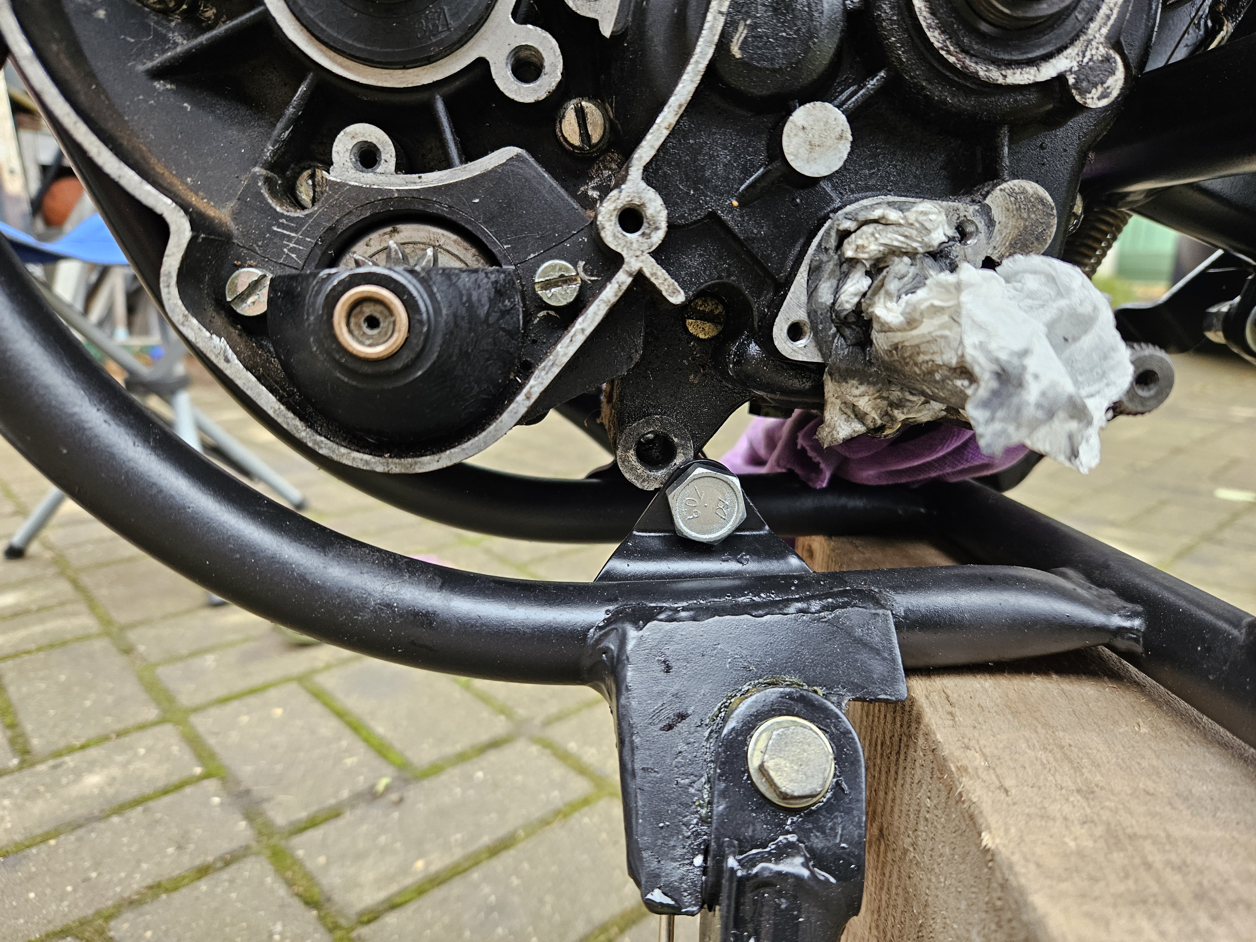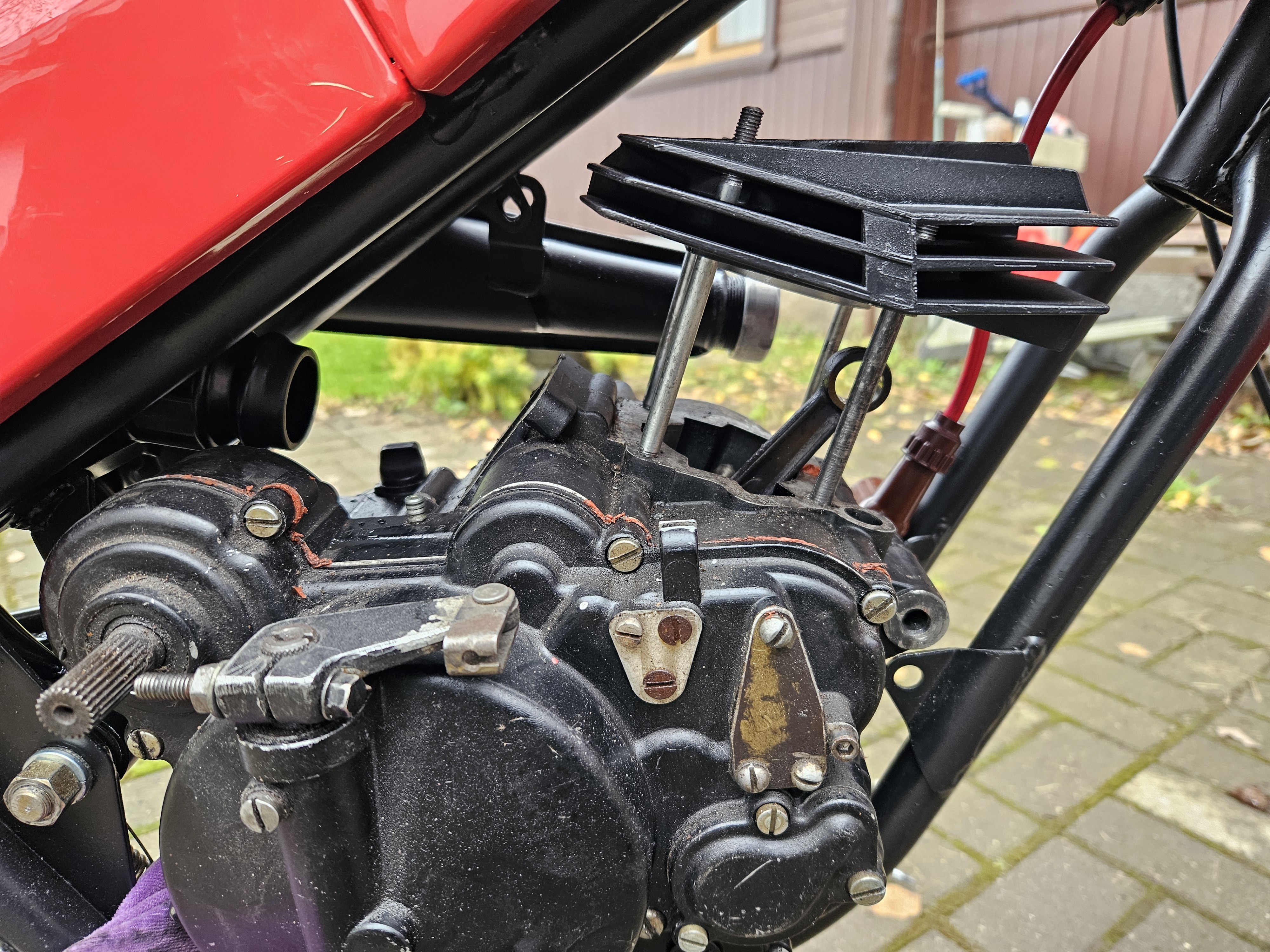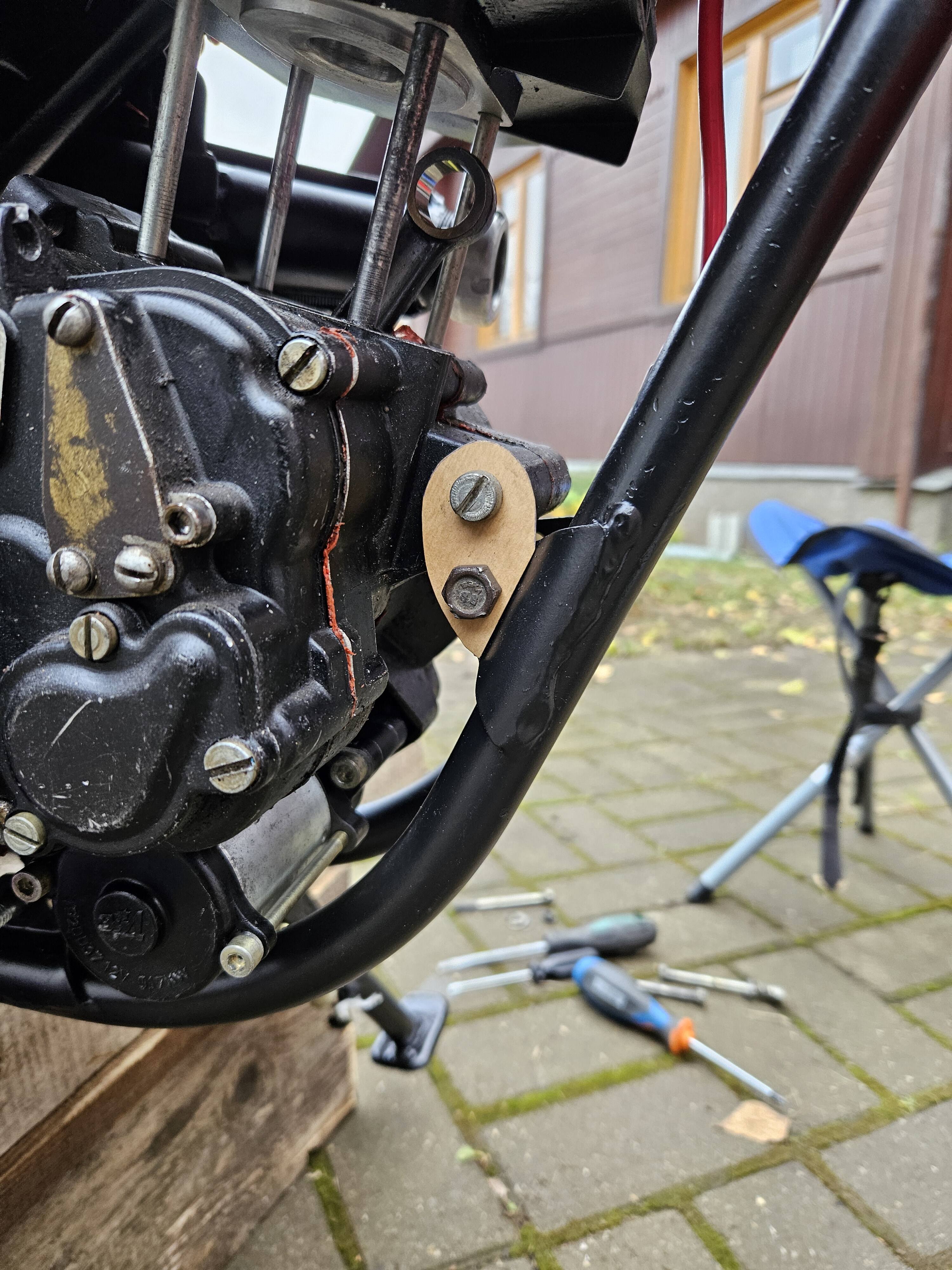 Решил попробовать приподнять переднюю часть. Мотор лежит на шпильке, вставленной в нижнее крепление на раме, задняя точка крепления штатная.