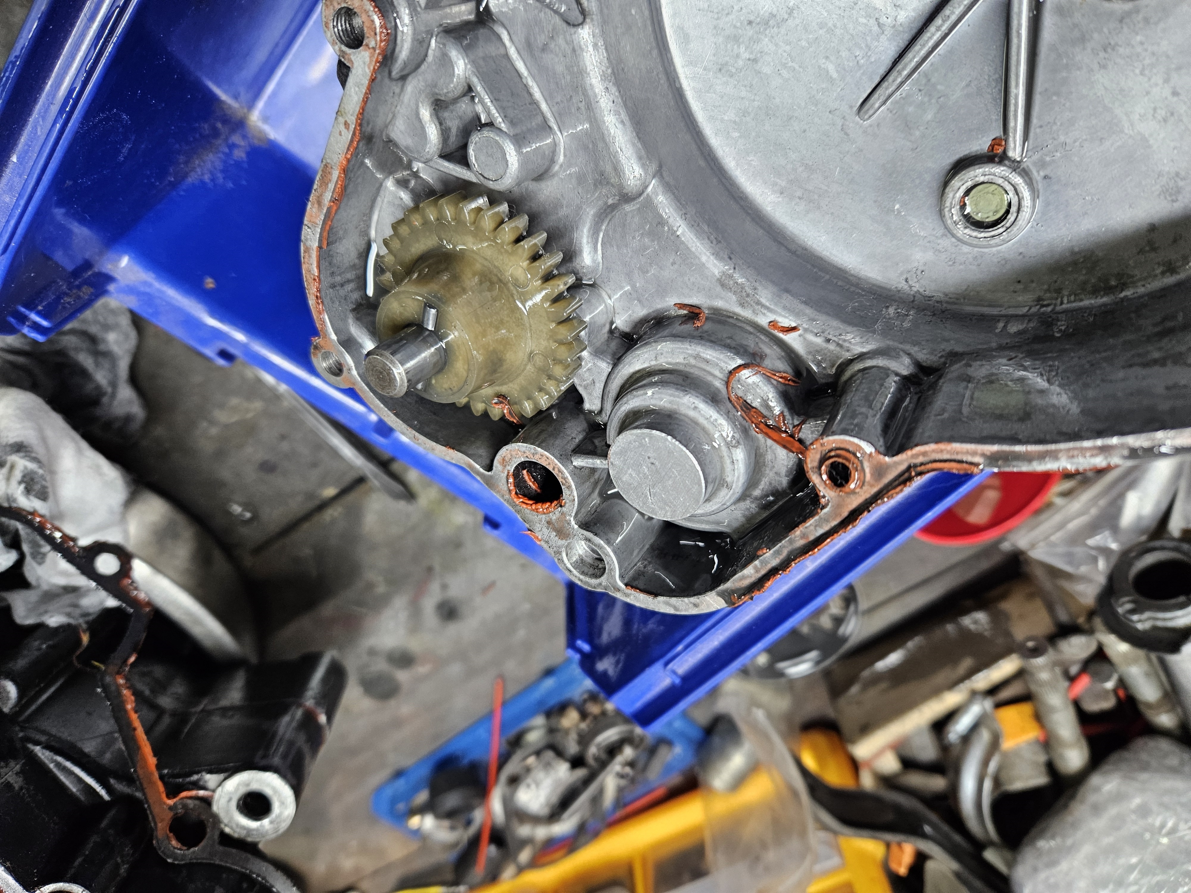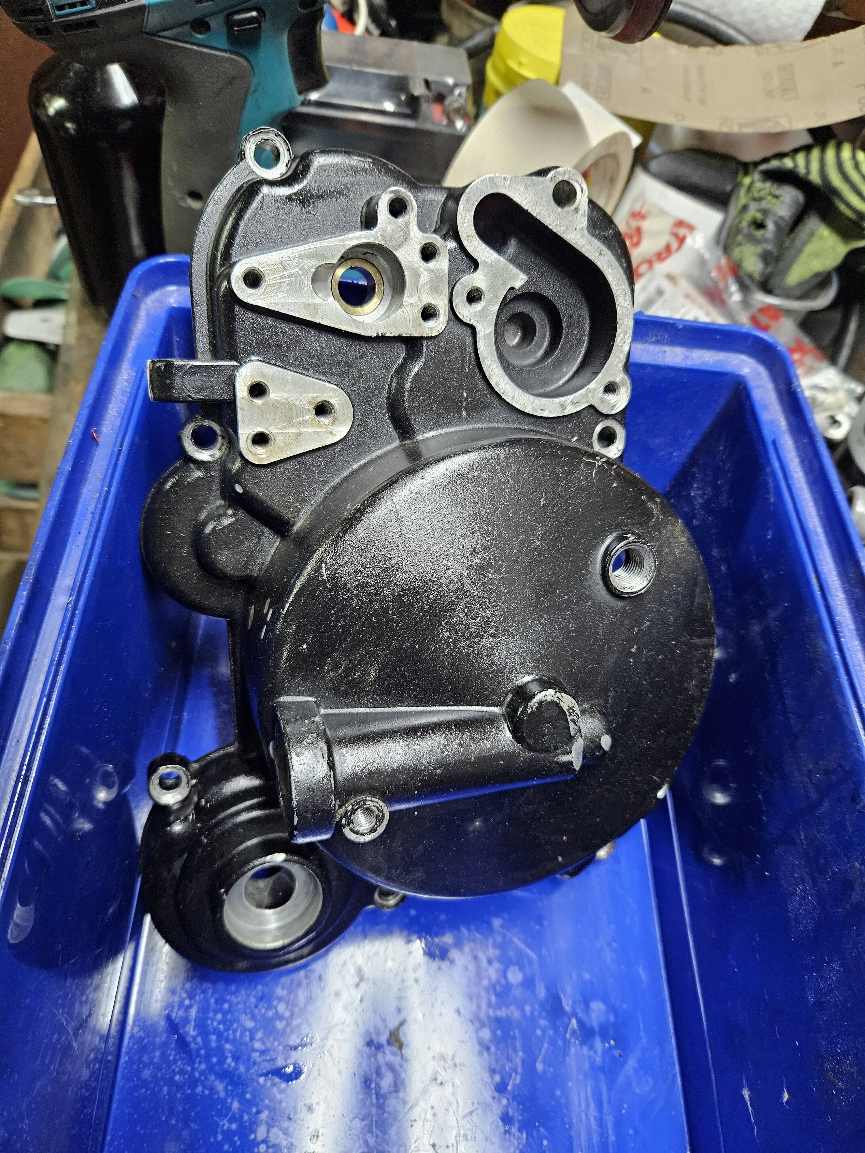 Нижняя крышечка заглушка помпы. Кроме крышки там нет ничего, ни привода, ни крыльчатки и отверстие в центре глухое. Сверху самодельная крышка на месте масляного насоса. Привод есть, сам насос отсутствует. В картере так же есть втулка в этом месте. На коленвале дополнительная звездочка стоит. Отсутствие насоса не смущает, так даже спокойнее.