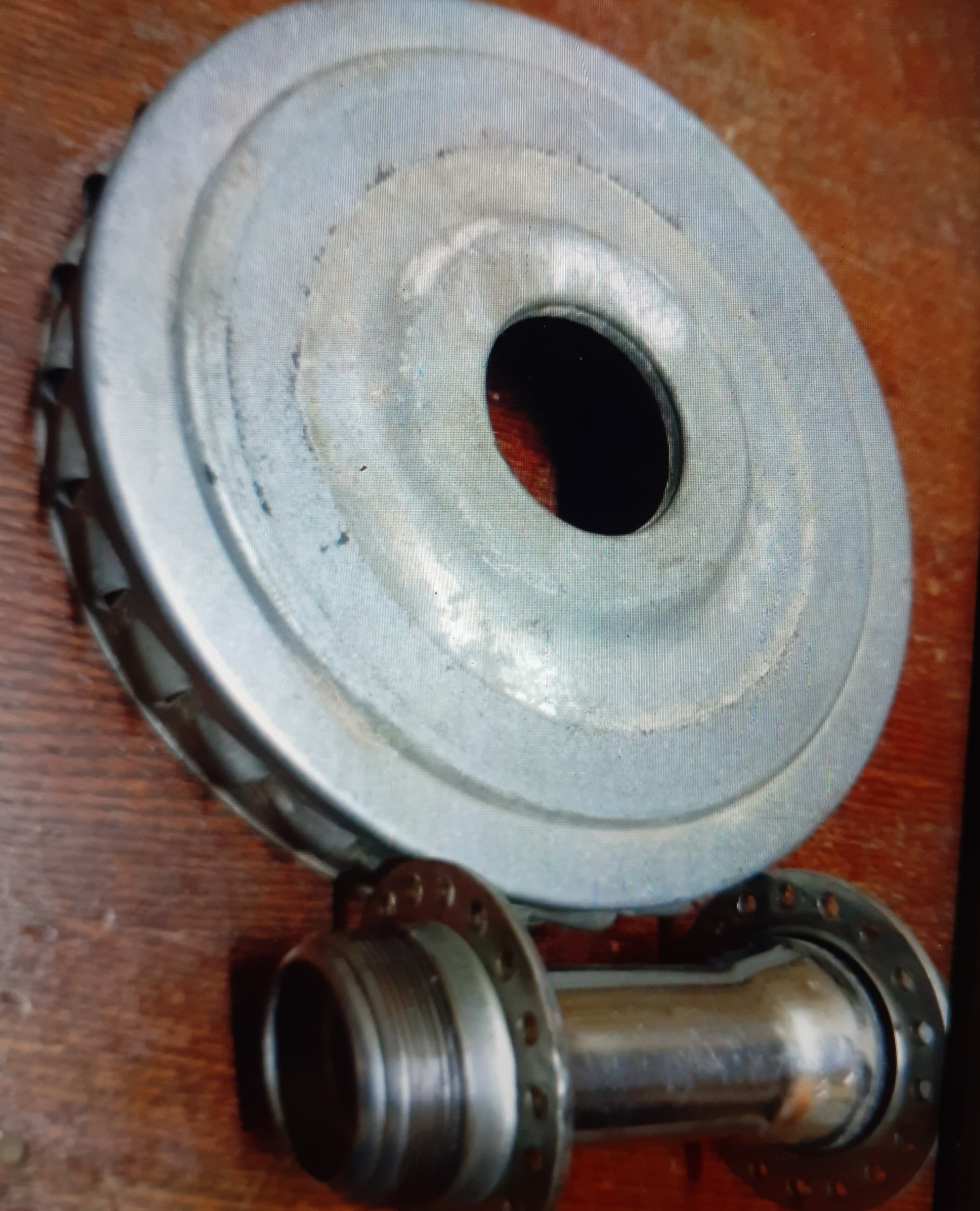 Хочу развернуть колесо. Тогда торм.колодки будут слева, а справа много свободного места в передней вилке и там можно прислюнить на ступицу резьбу от веловтулки и на неё трещётку под цепь для мотопривода.
